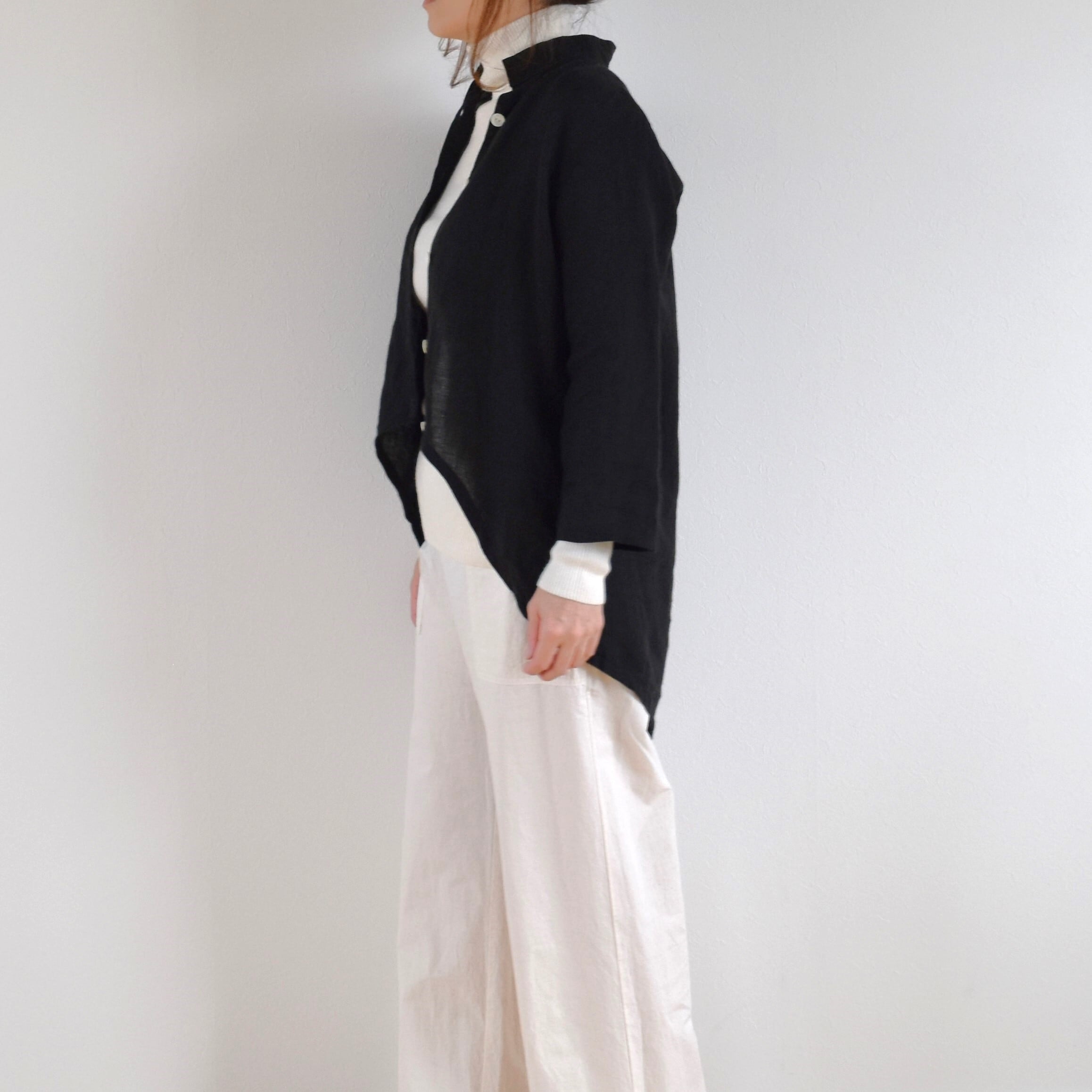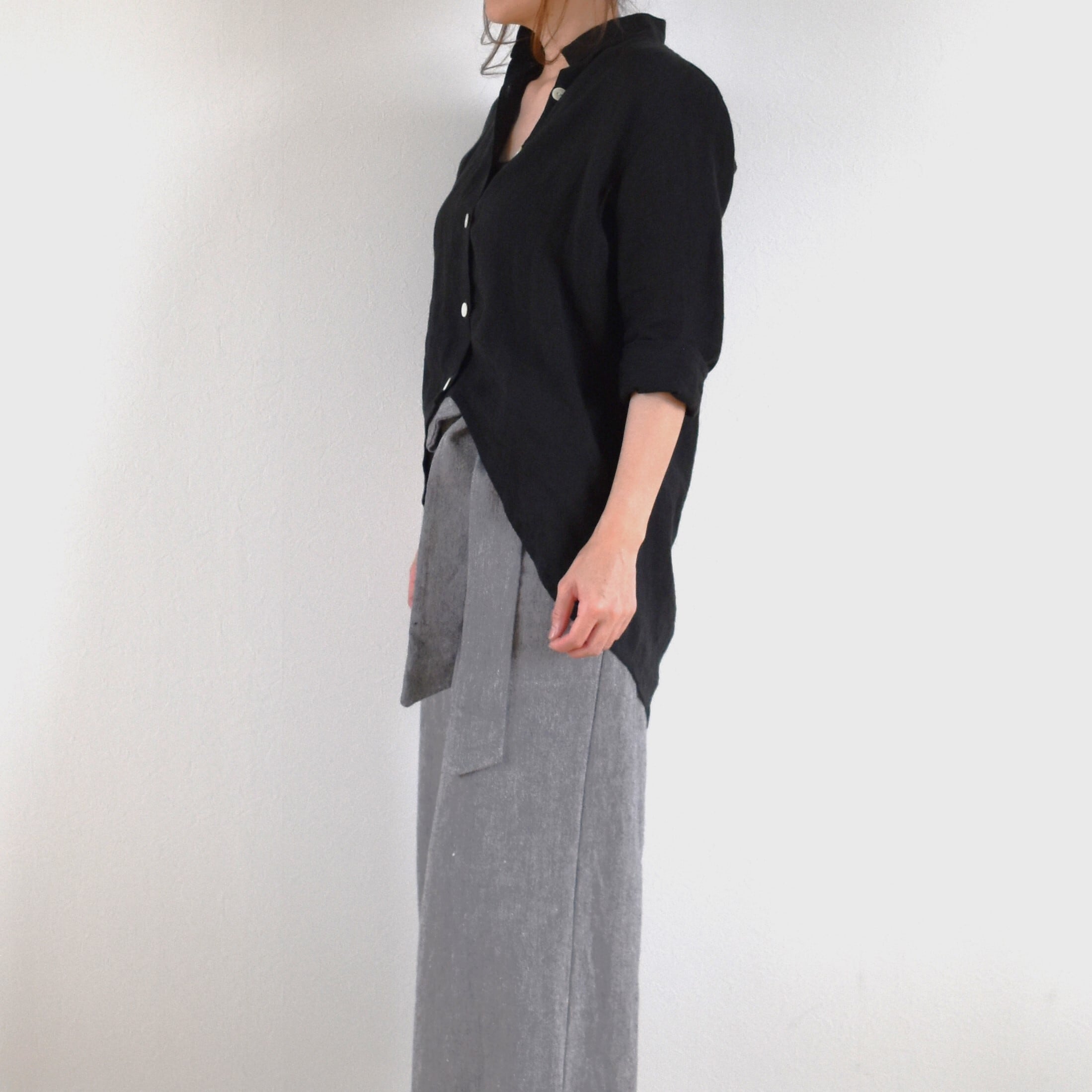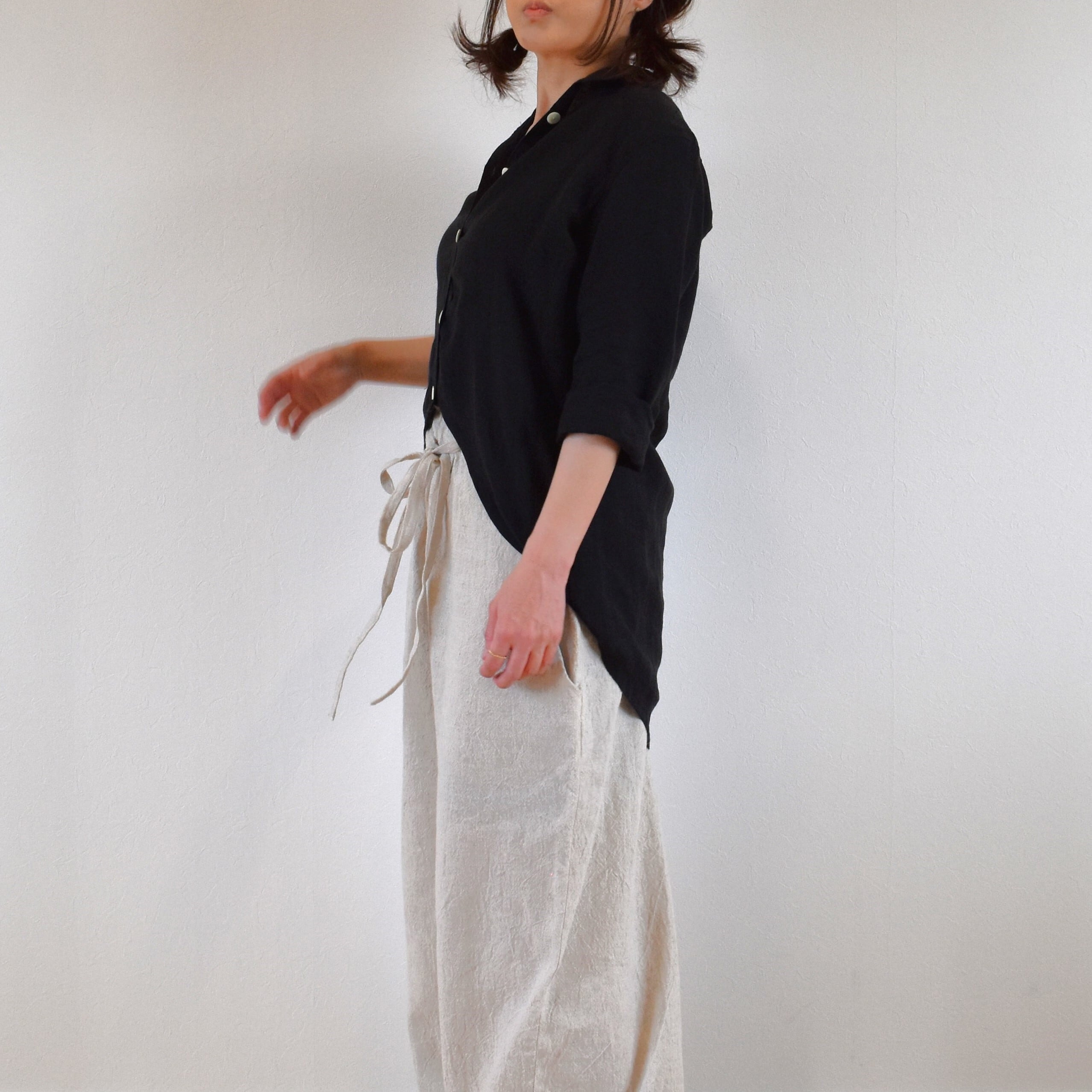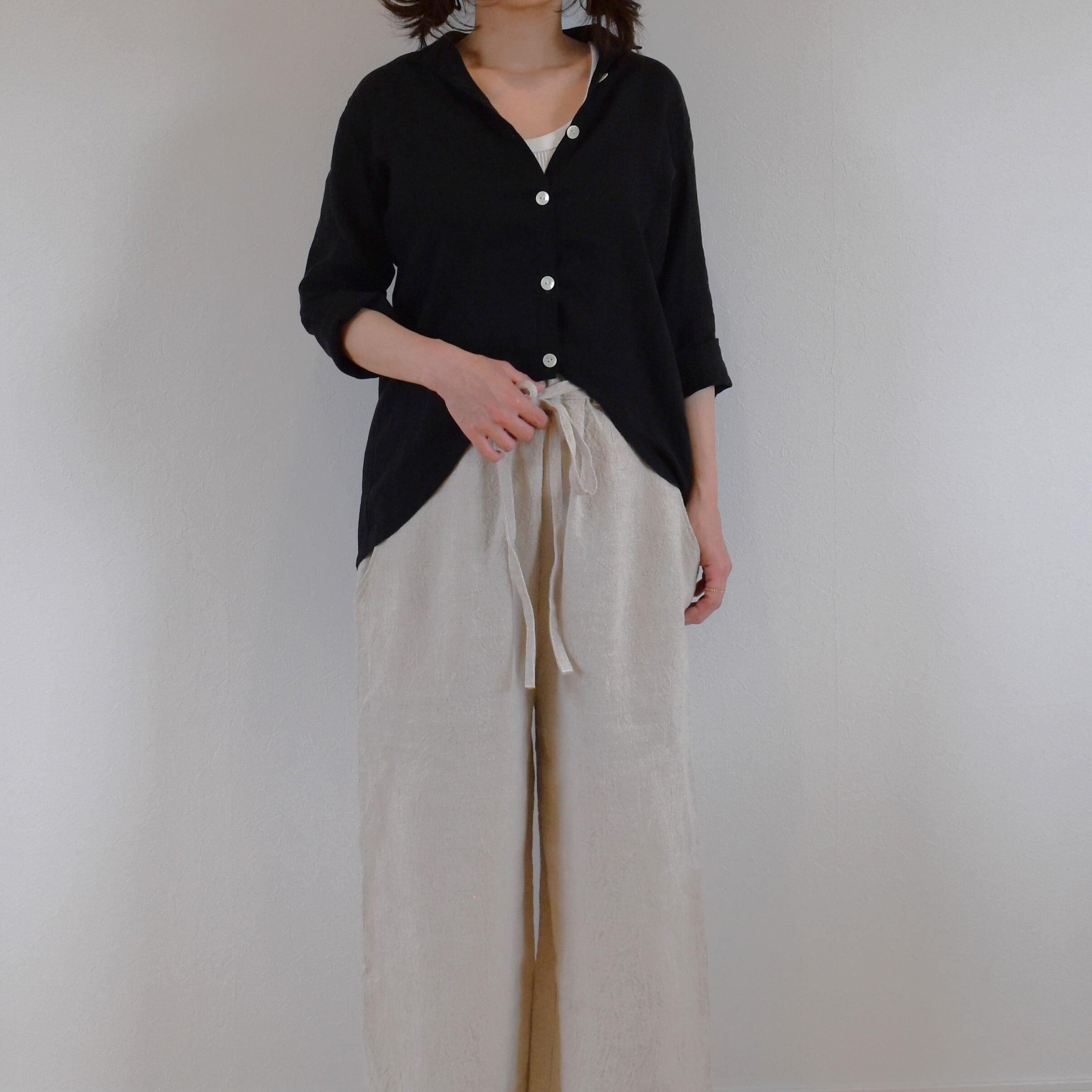 薄手のリネン生地を使用し、透け感がありますのでインナーを合わせて着用してください。