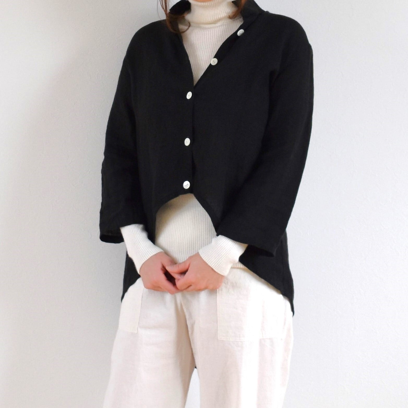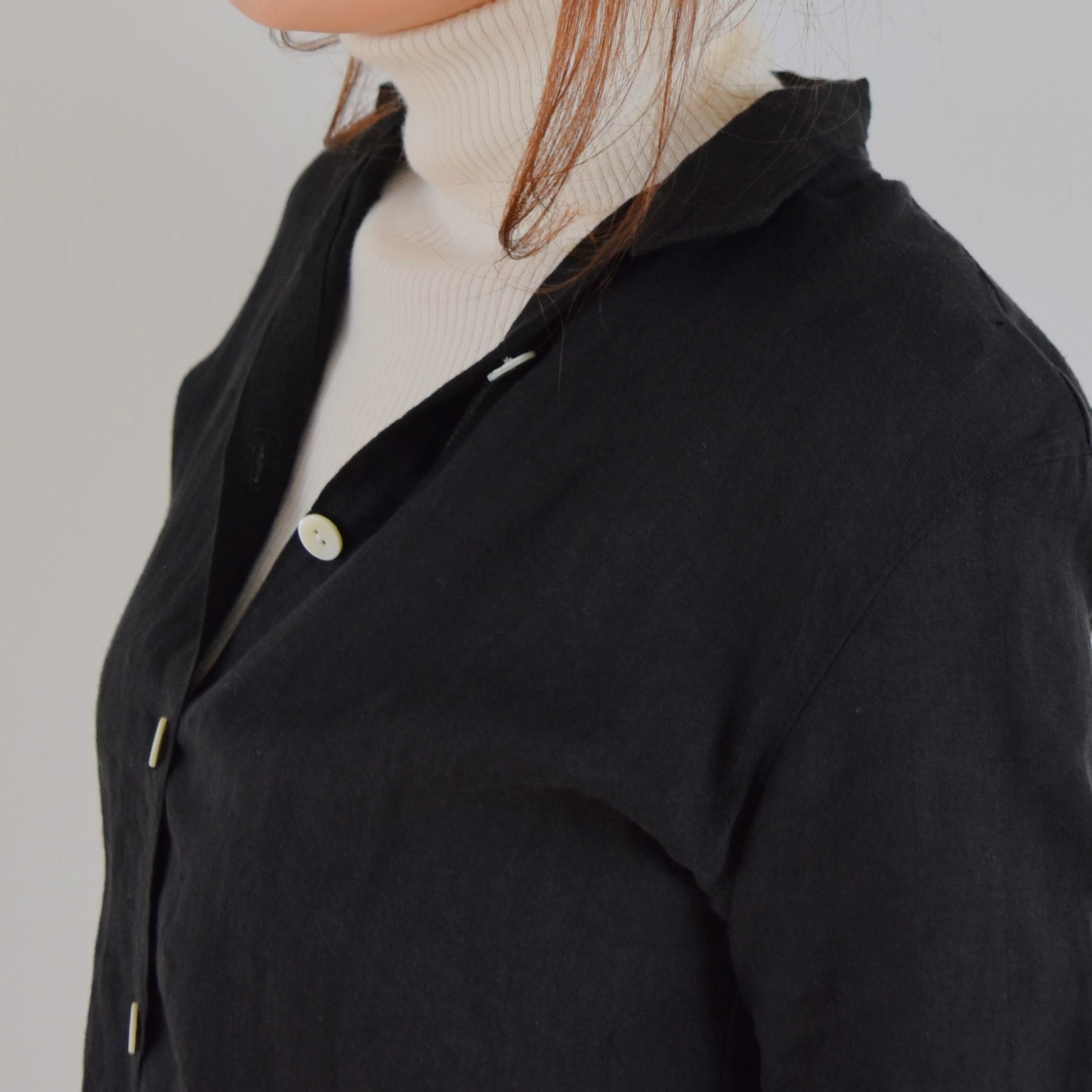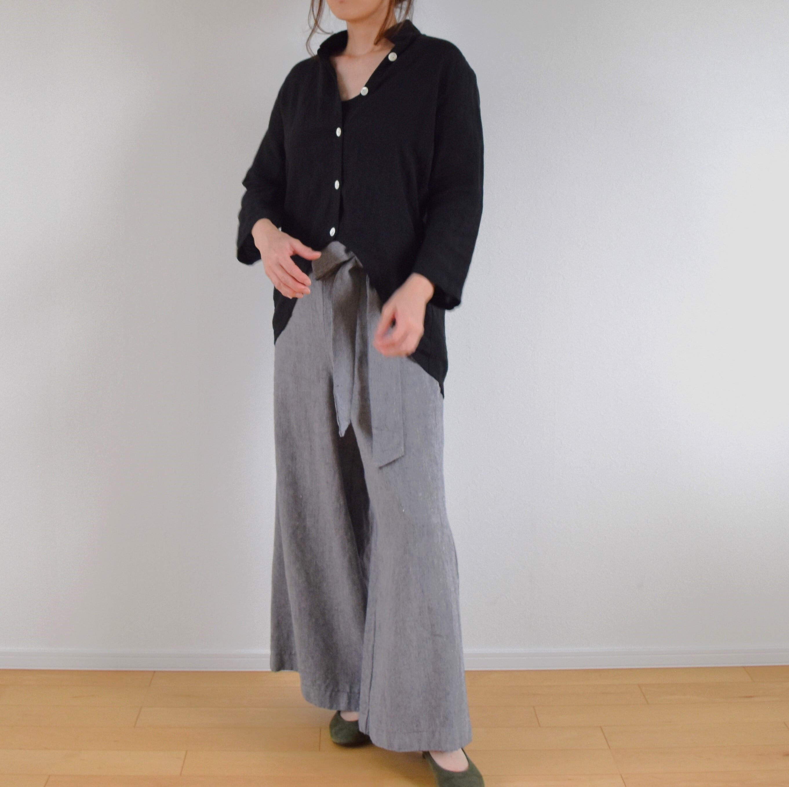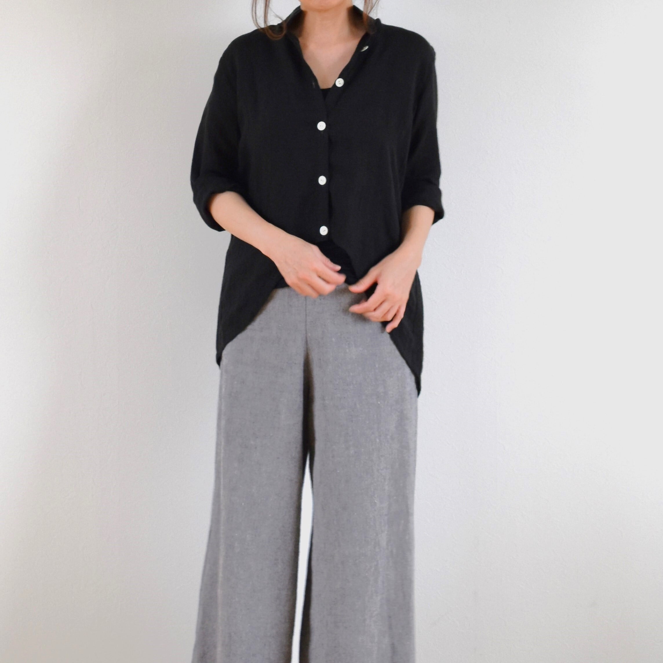 薄手のリネン生地を使用し、透け感がありますのでインナーを合わせて着用してください。