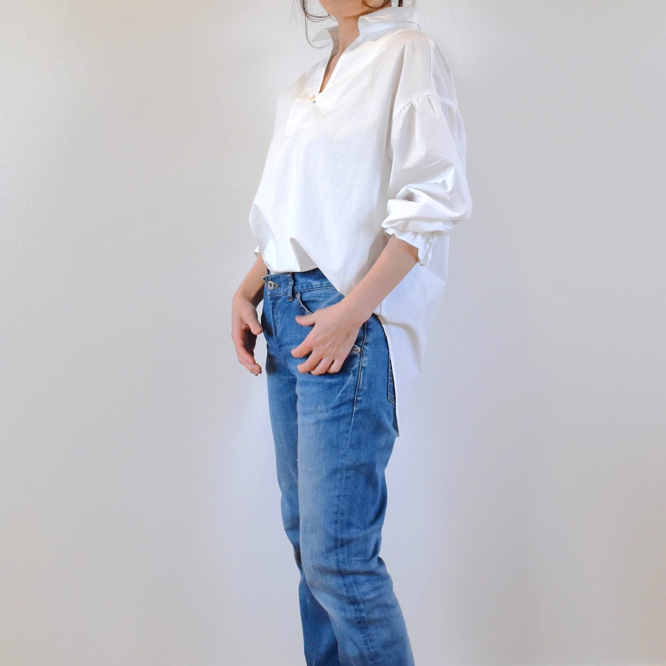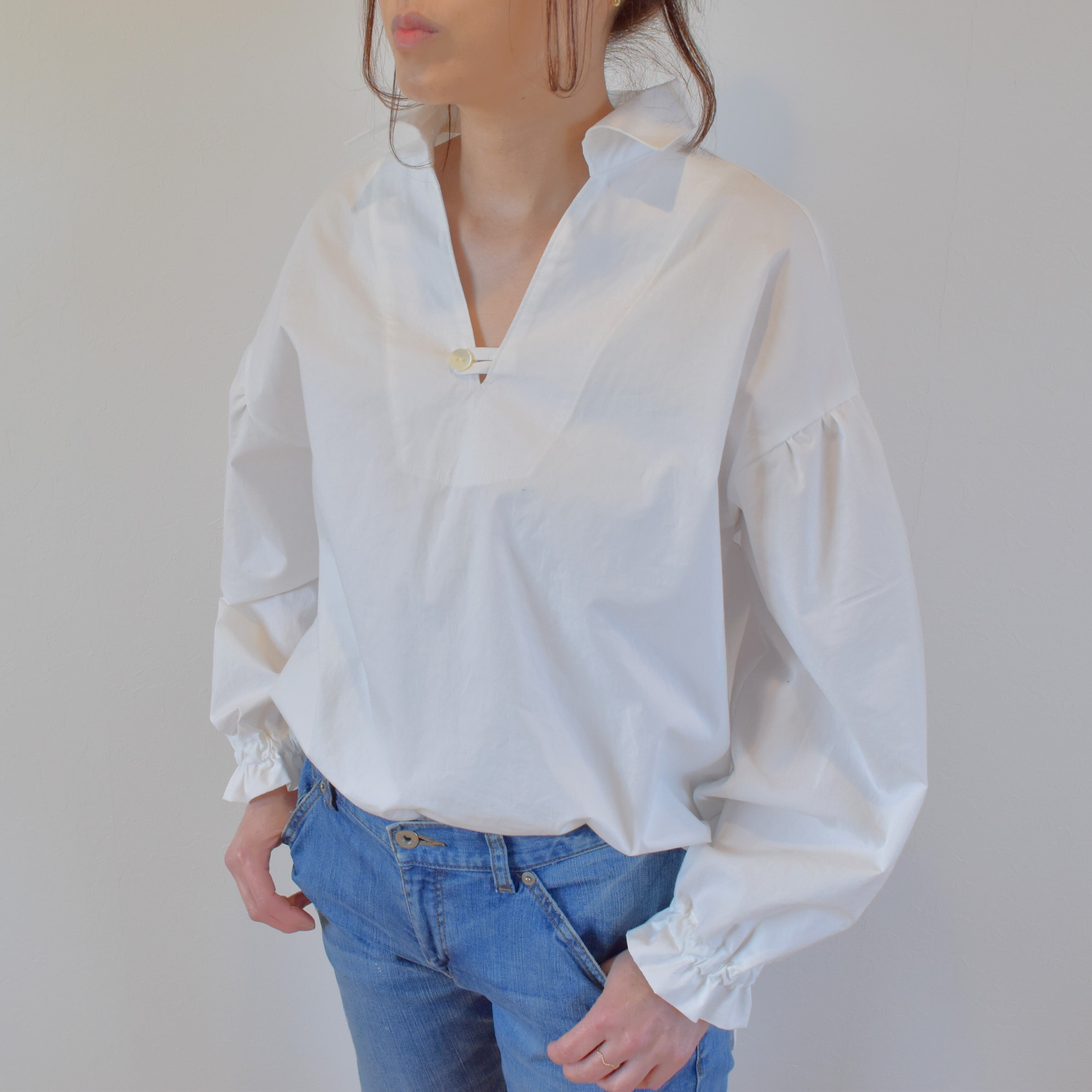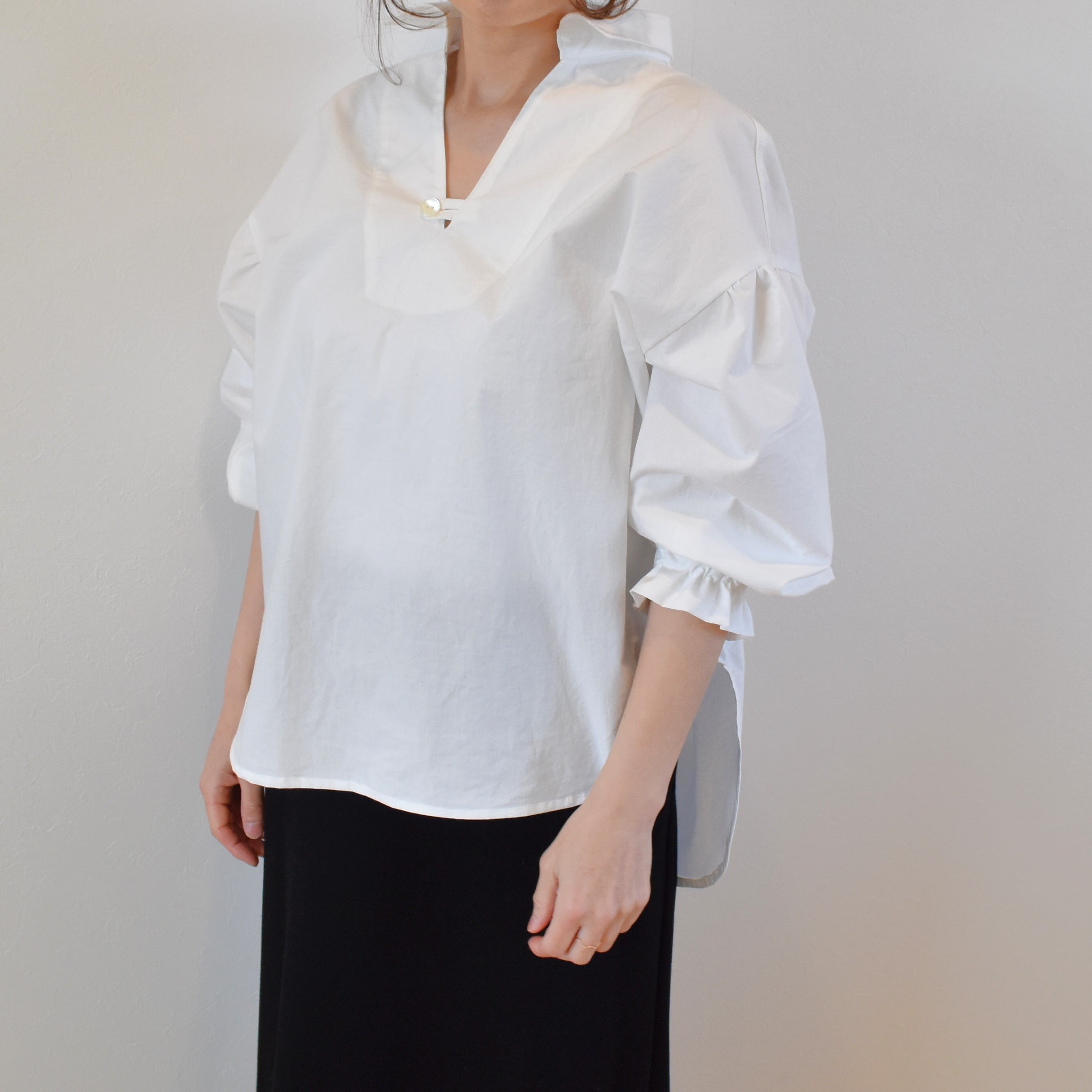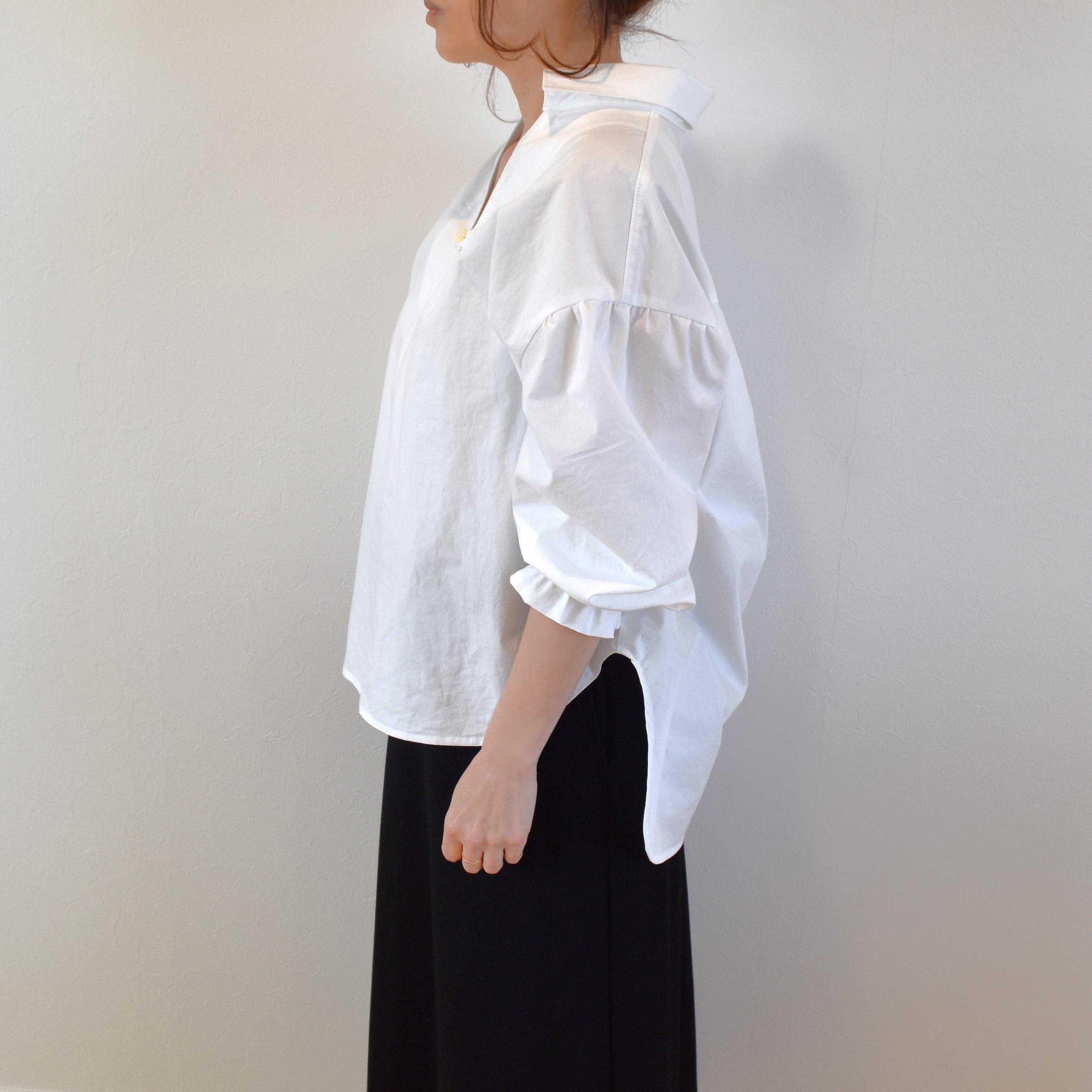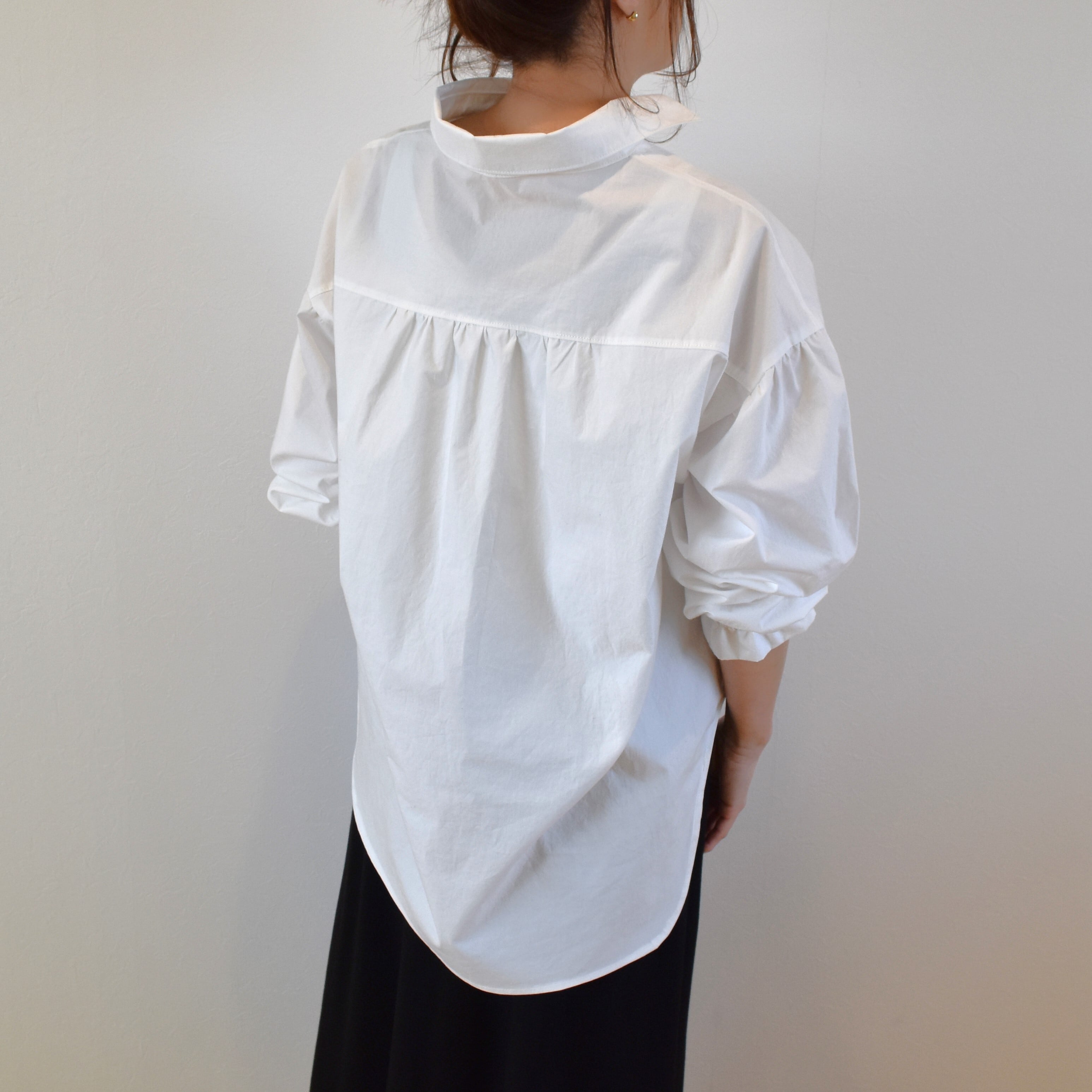 綿100% ふっくらギャザー スキッパーシャツ コットンタイプライター/ホワイト