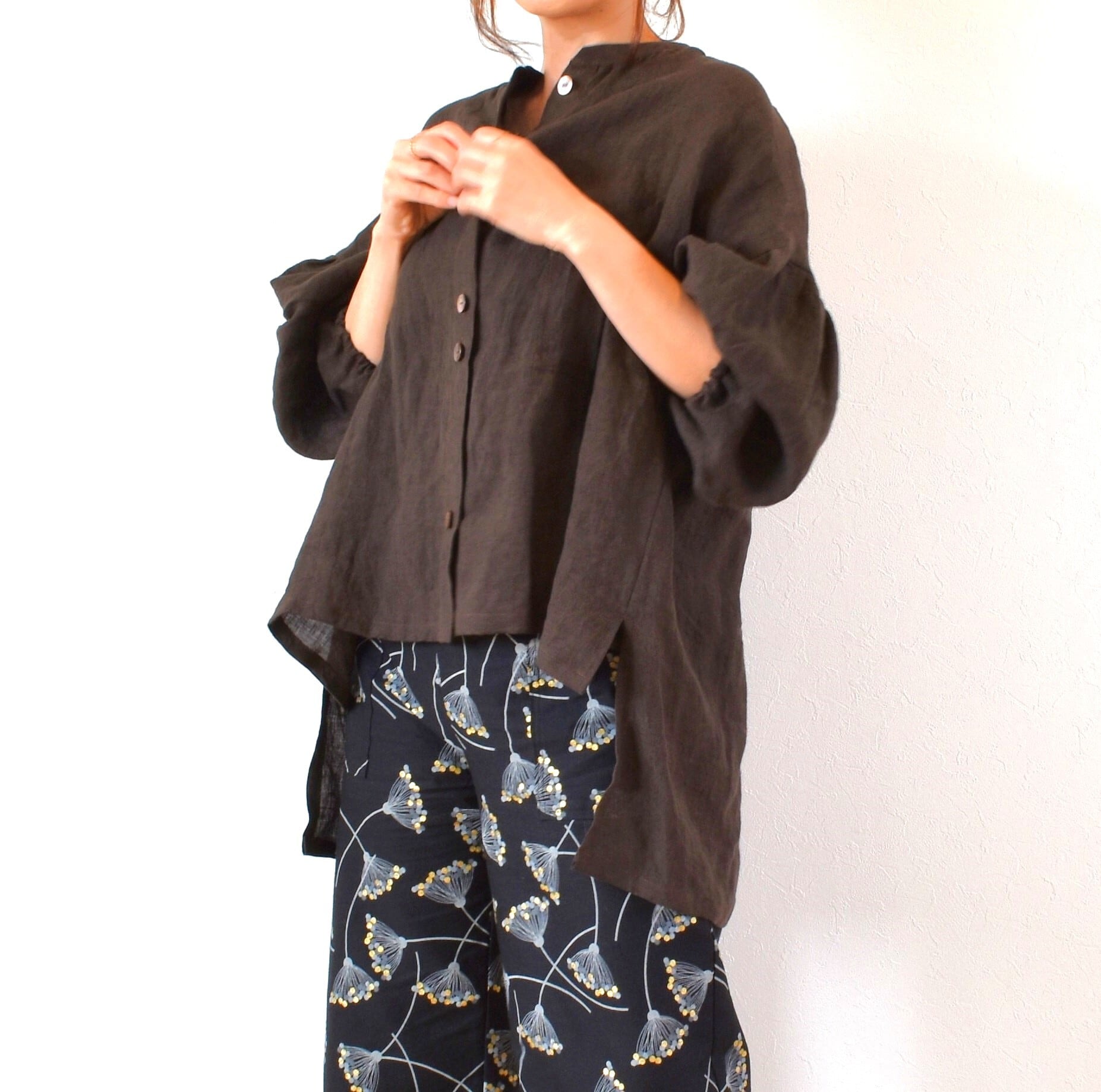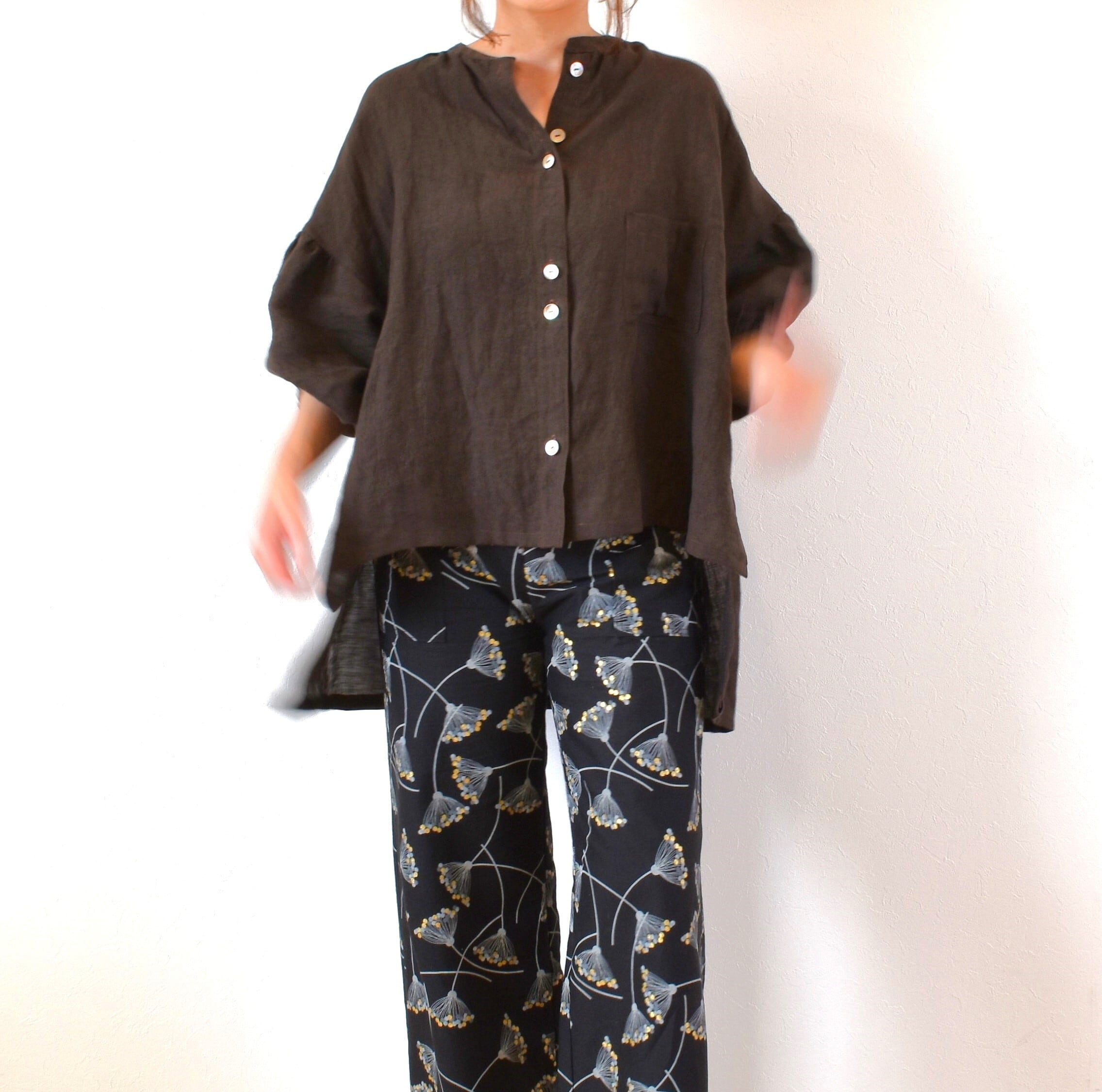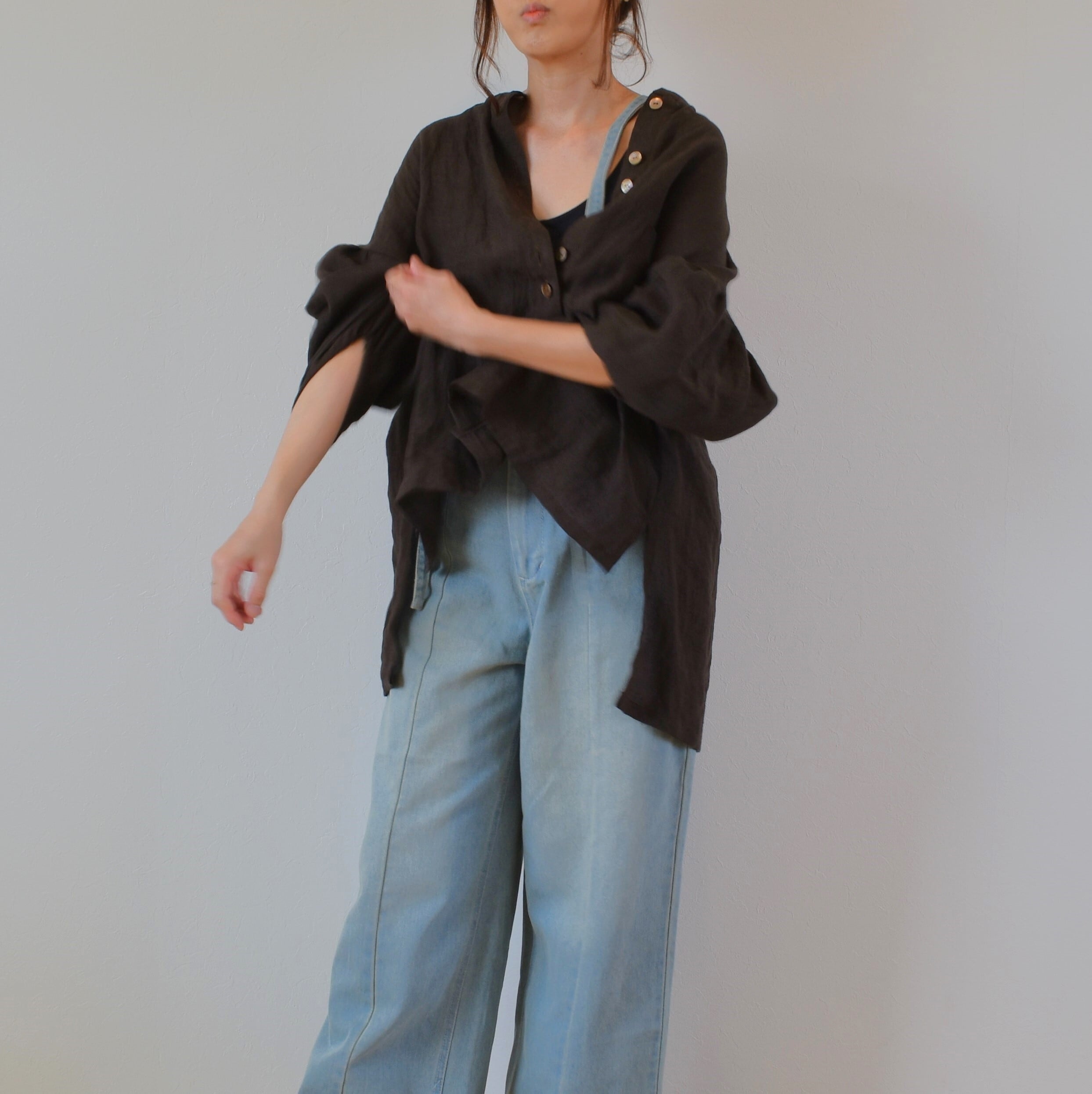 薄手のリネン生地を使用し、表面には素材の良さが際立つような美しいシボ感があり、深みのある雰囲気抜群のブラウスに仕上がっています。柔らかくやさしい着心地です。