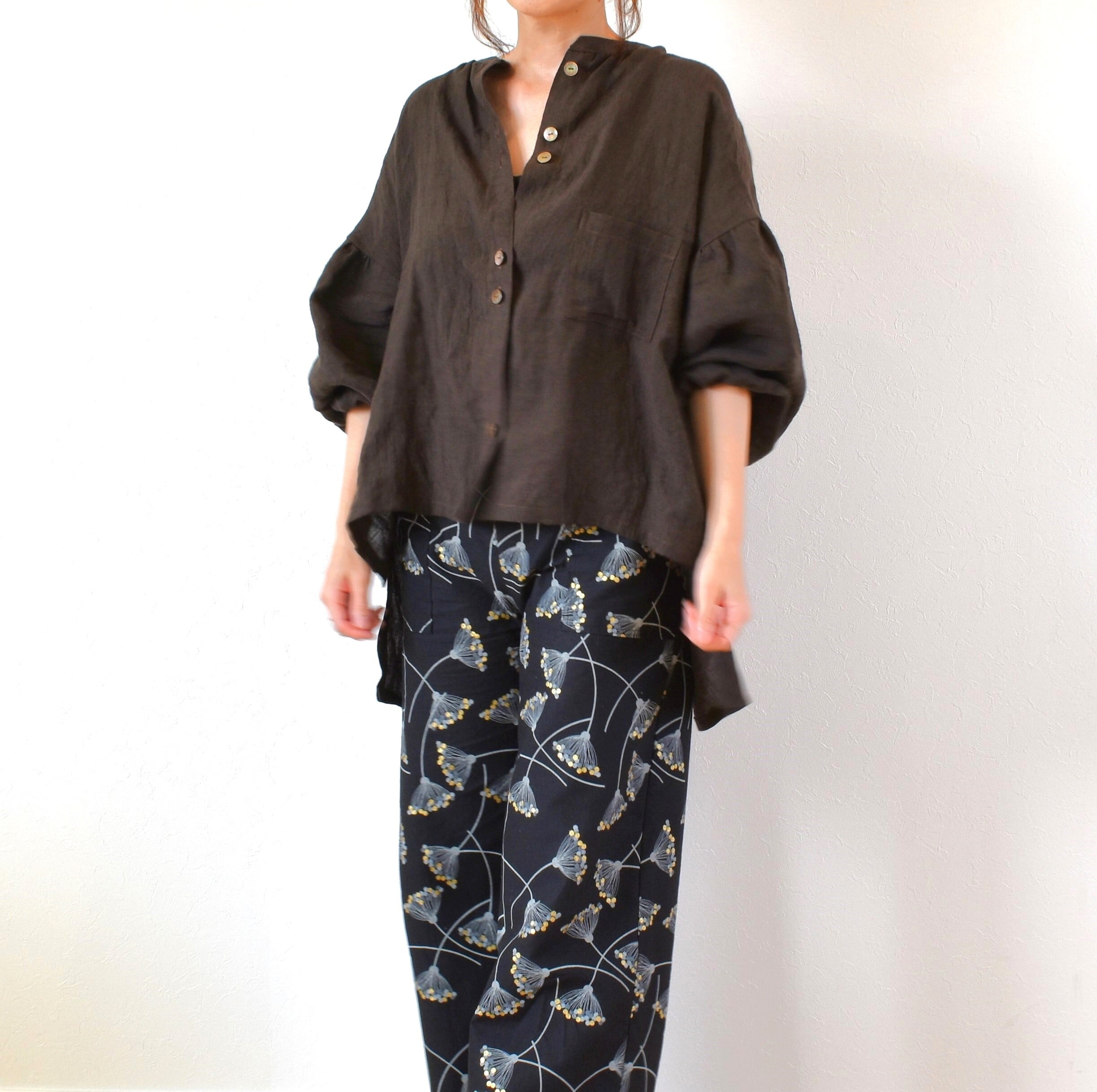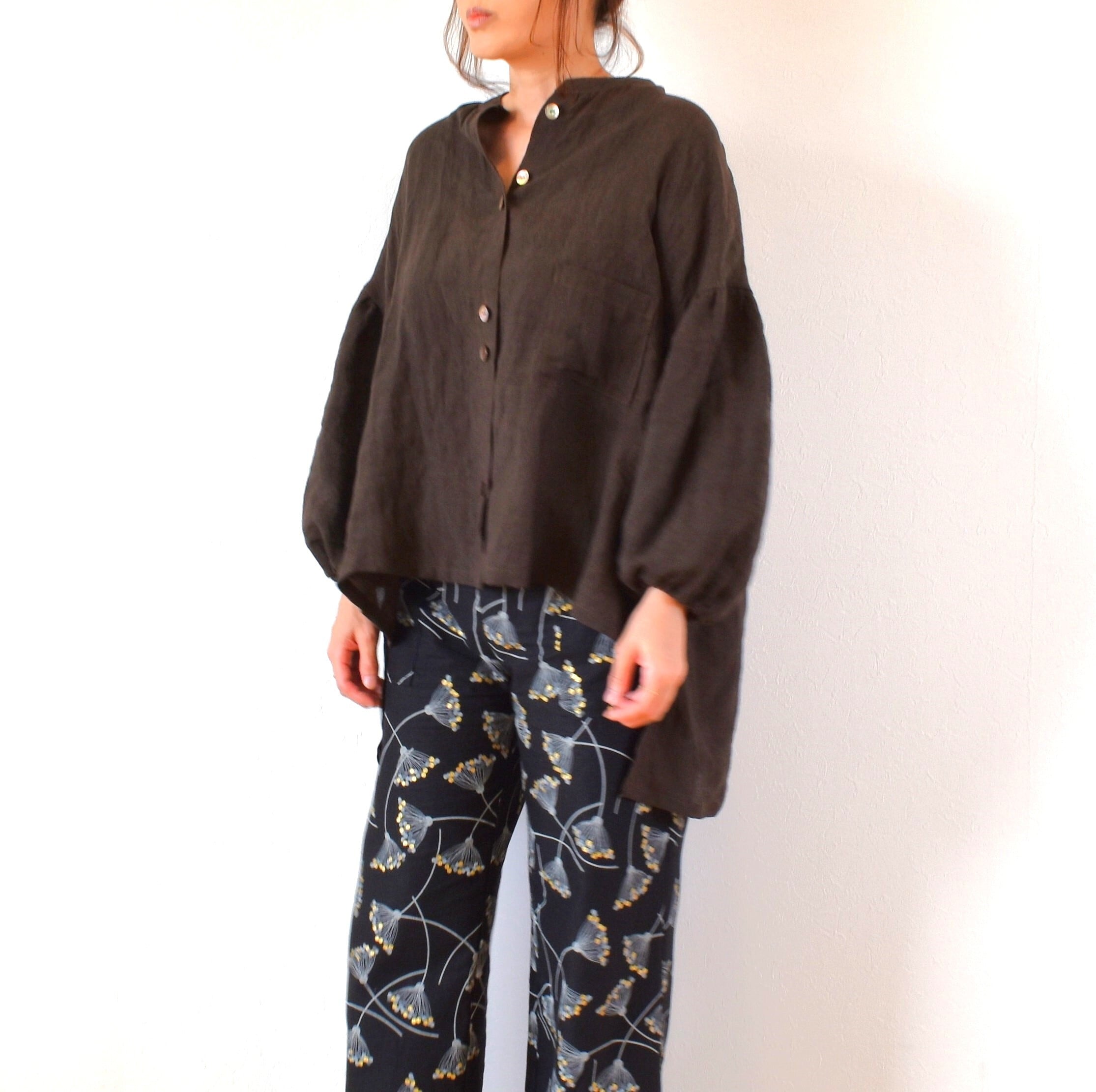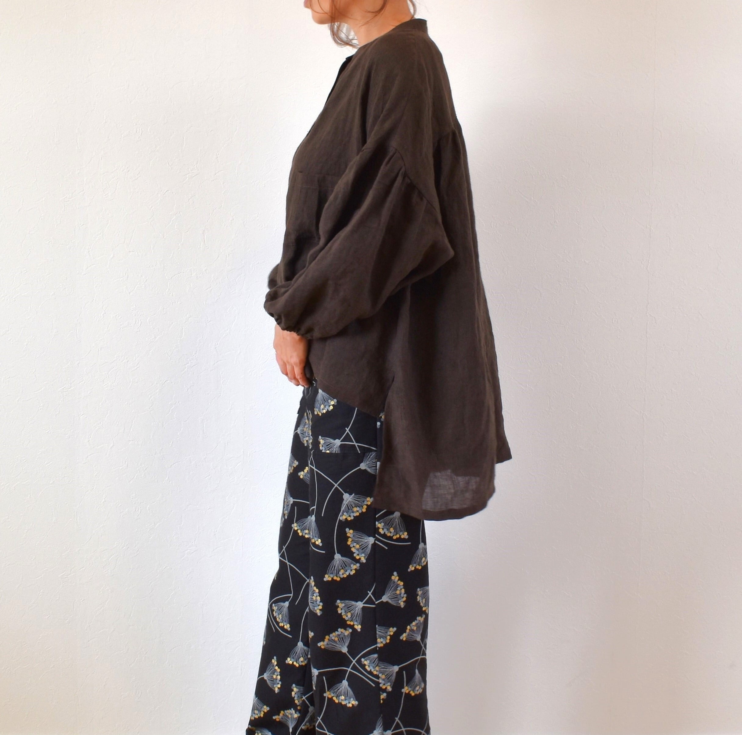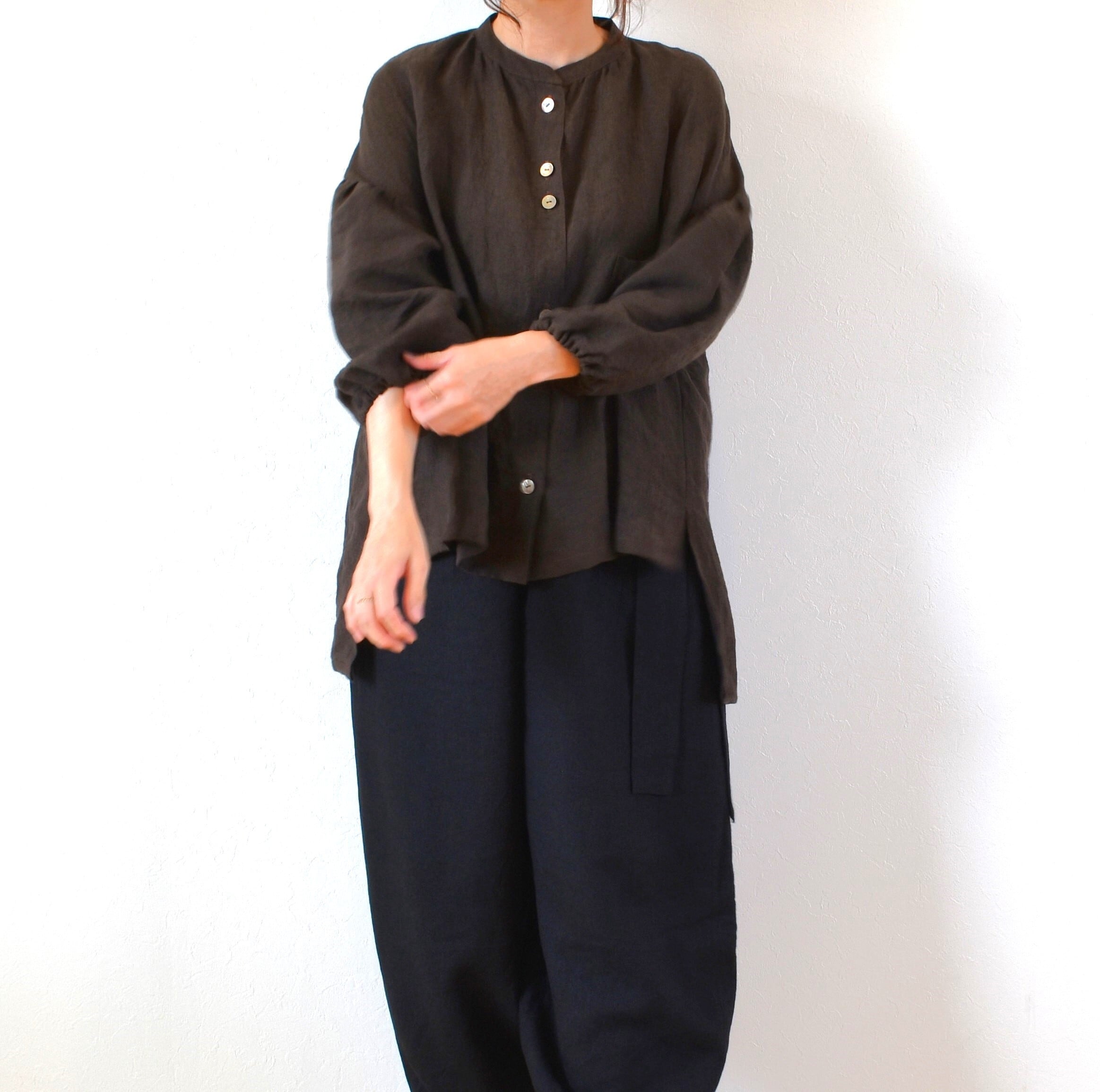 やわらかリネン100% バンドカラーギャザースリーブ ブラウス/チョコレートブラウン
