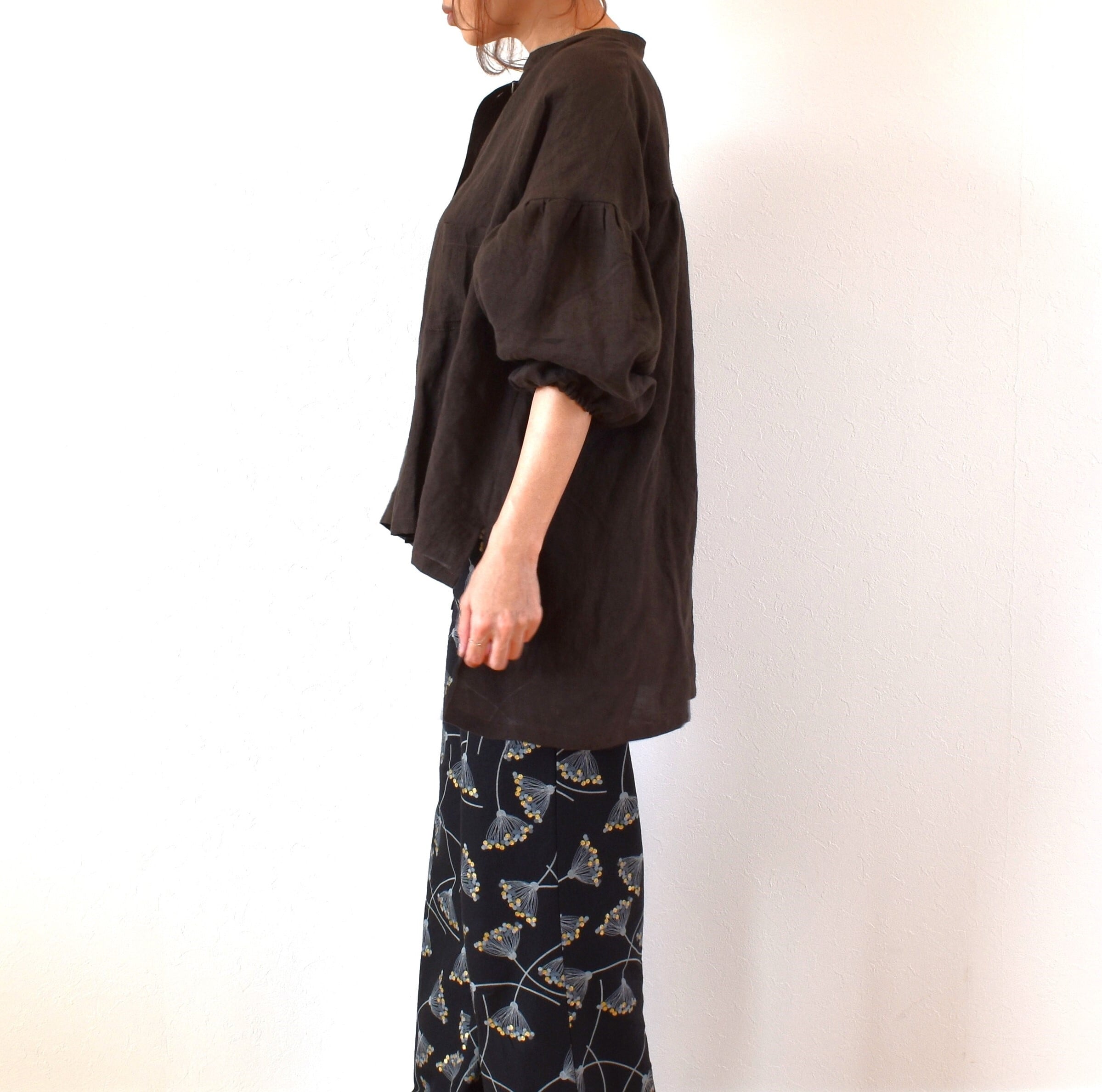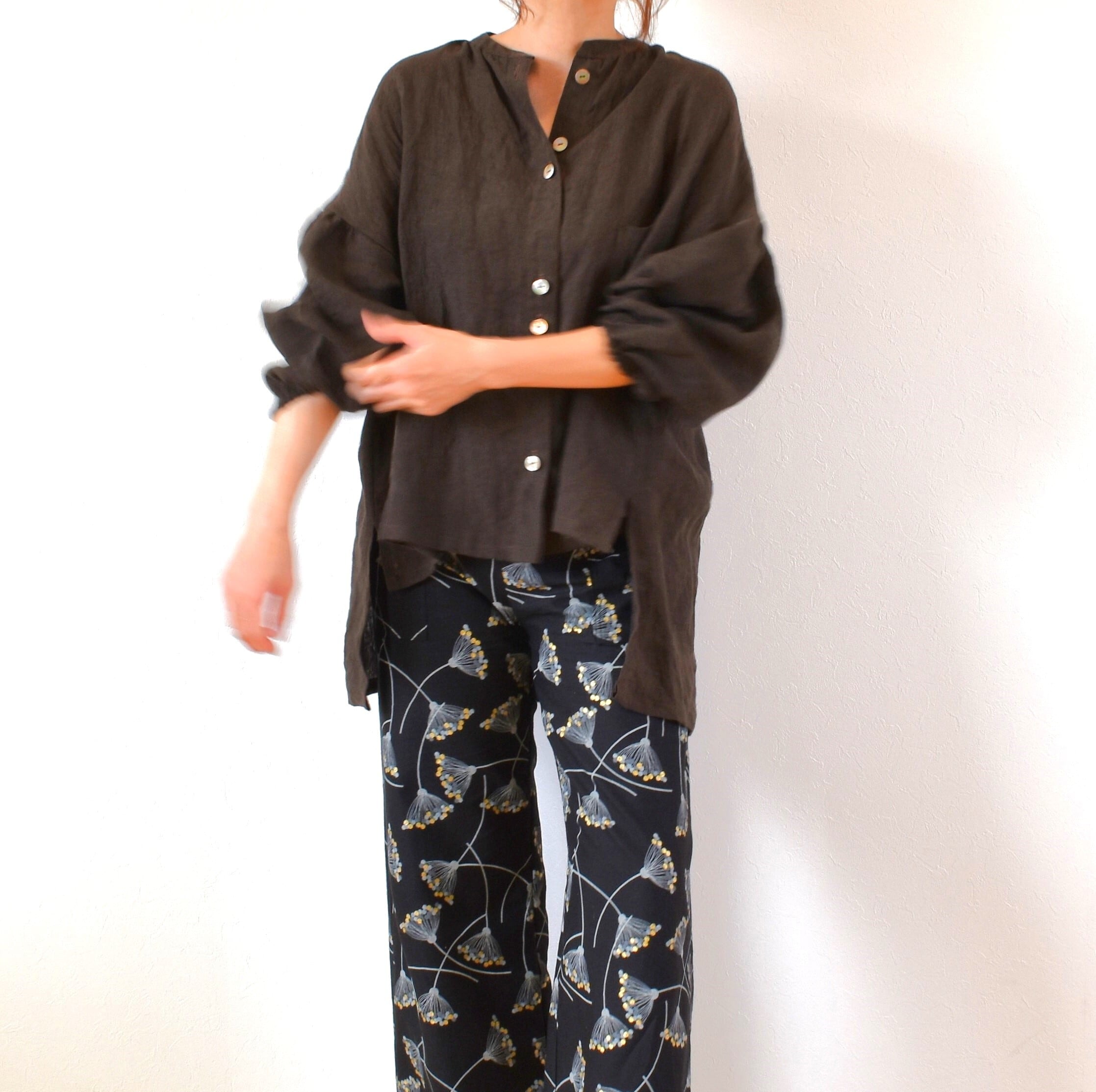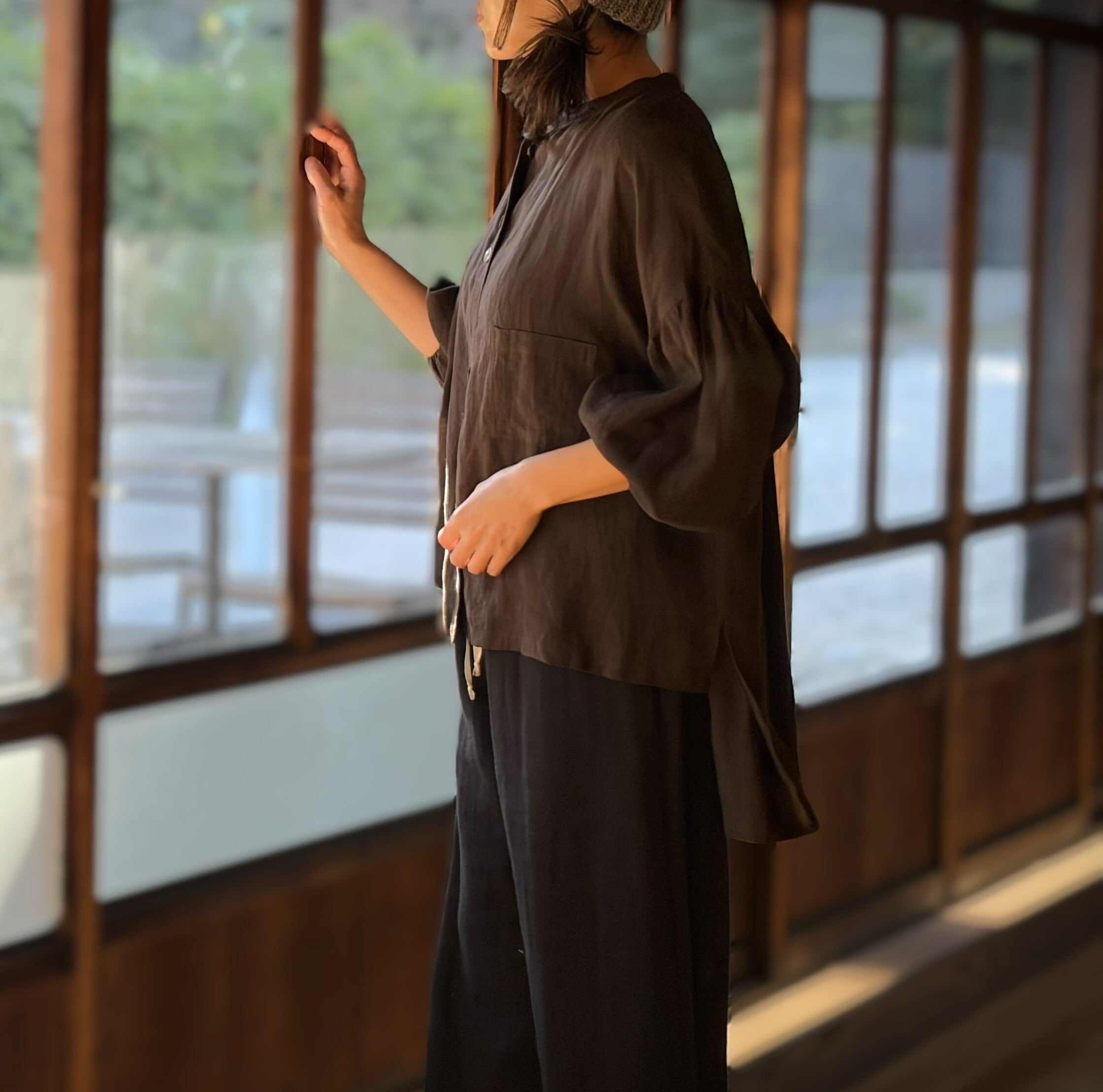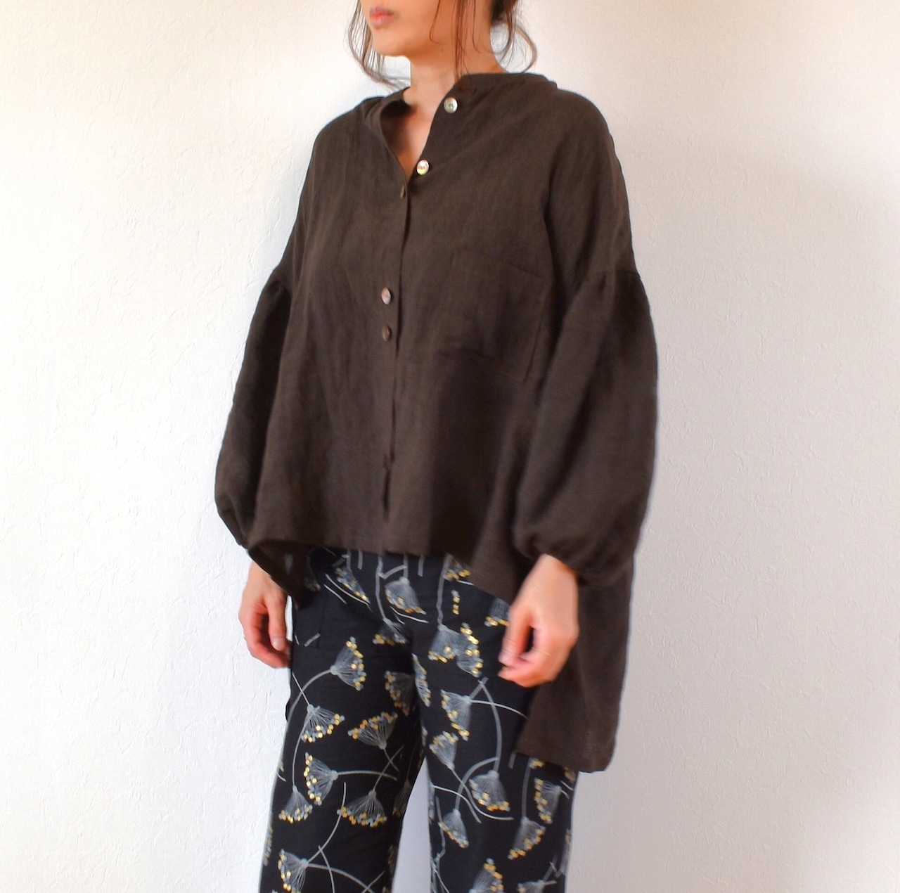 やわらかリネン100% バンドカラーギャザースリーブ ブラウス/チョコレートブラウン