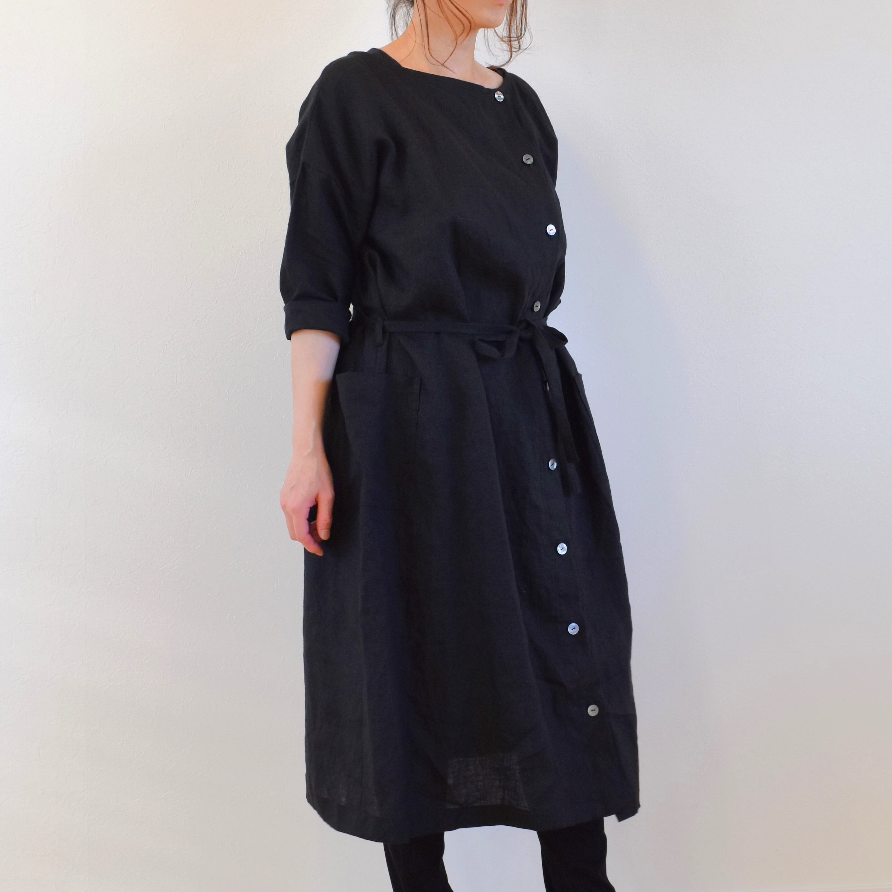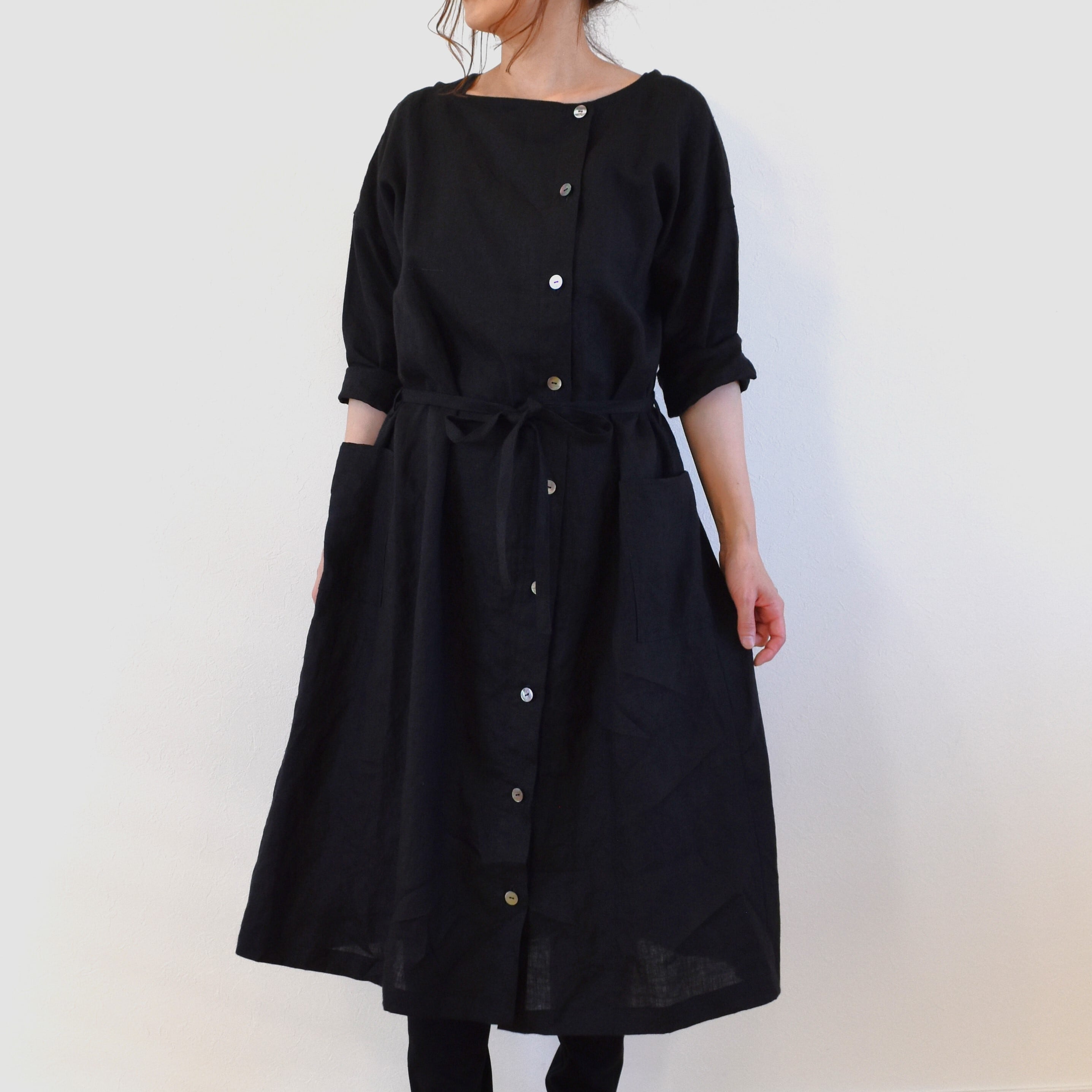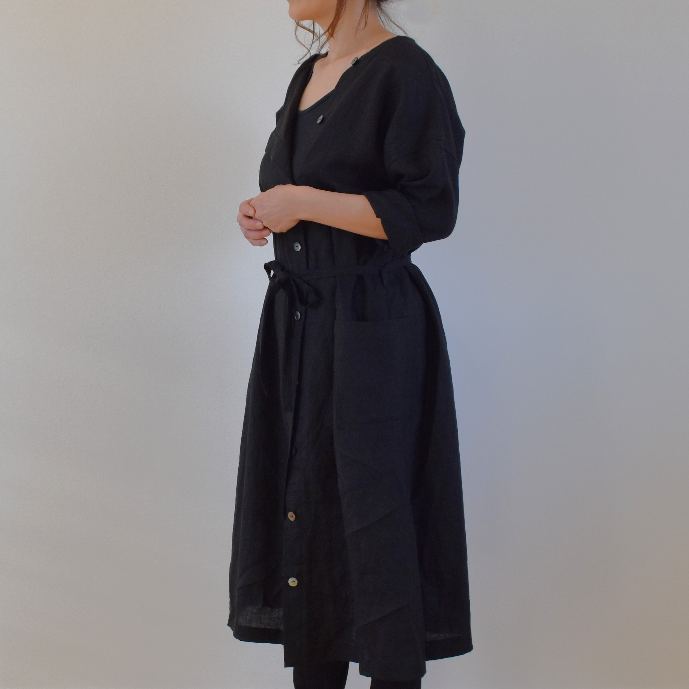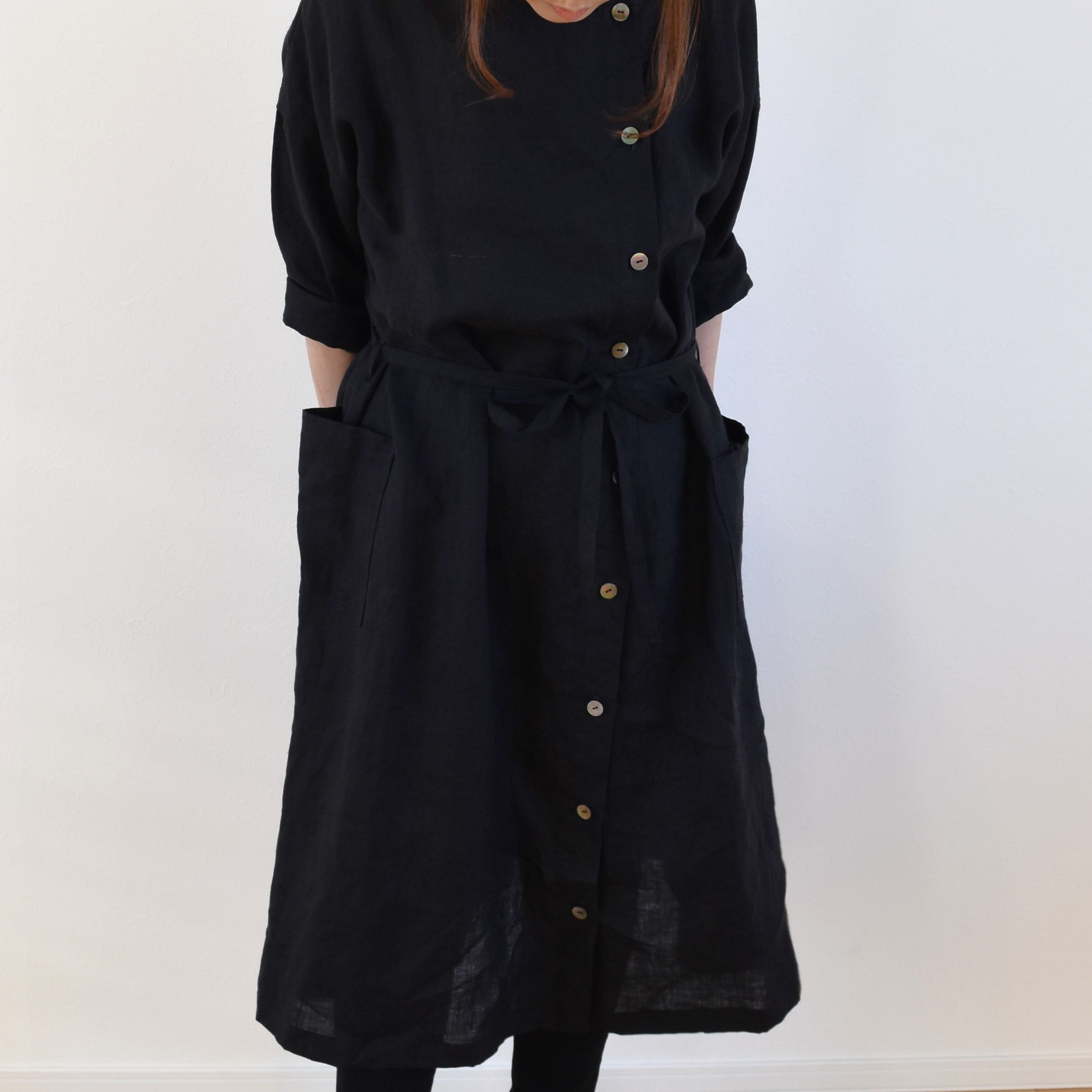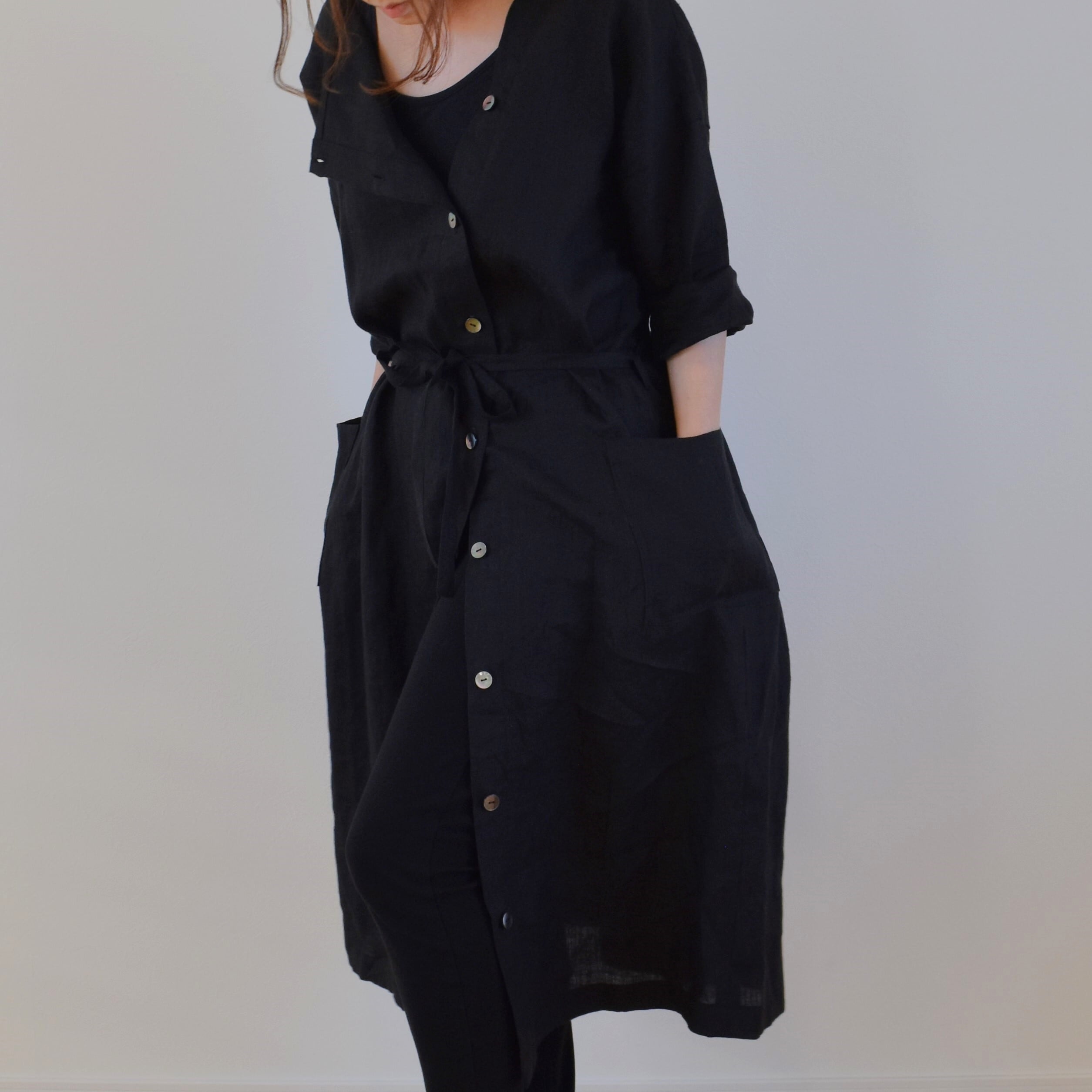 中心ではなく少し横にずらした位置にボタンラインを作りましたので、下を開けてスリット風にしたり、1つだけ留めて羽織りにしたり、ボタンを全部とめてウエストリボンでベーシックなワンピースにしてみたりと着こなしの幅が広がります。