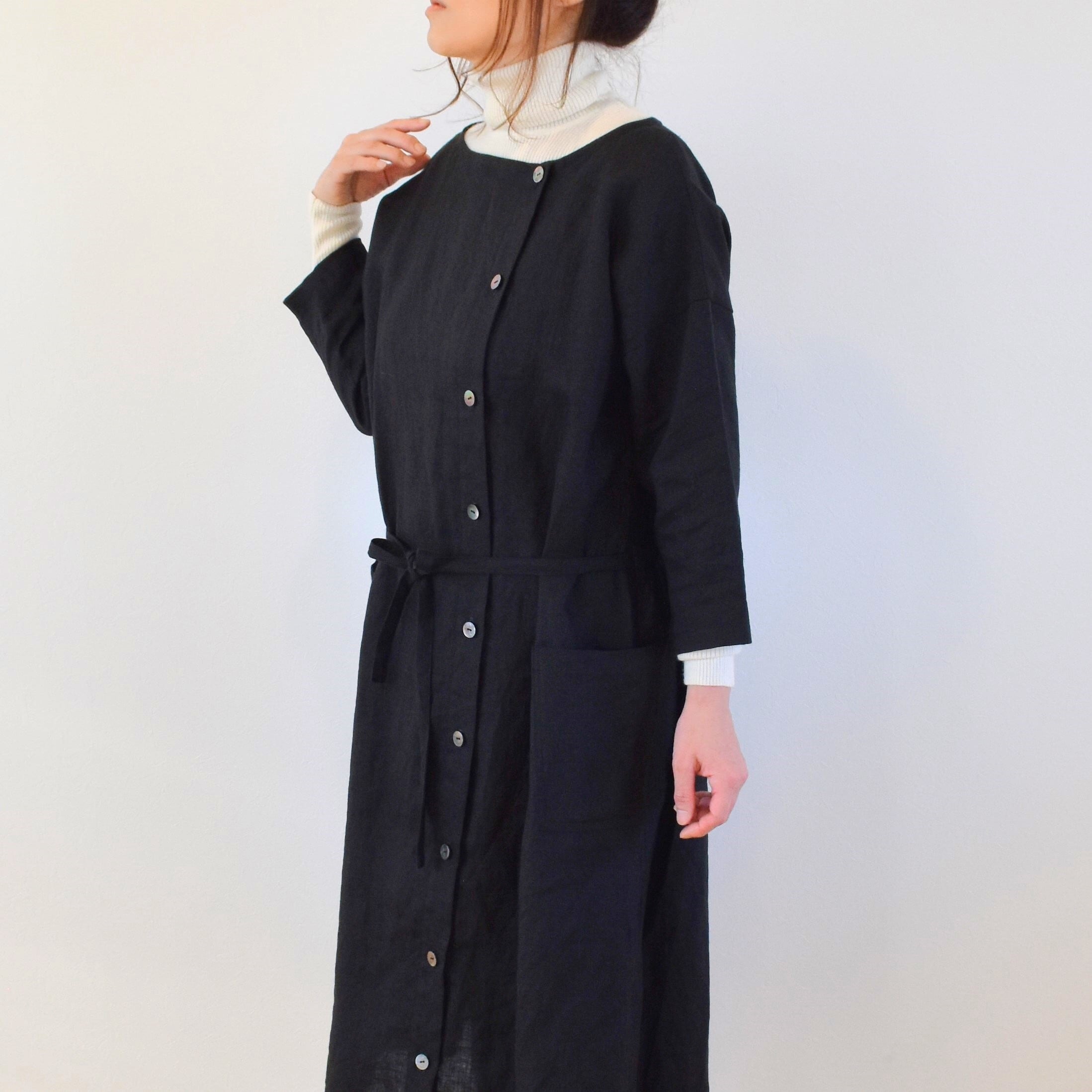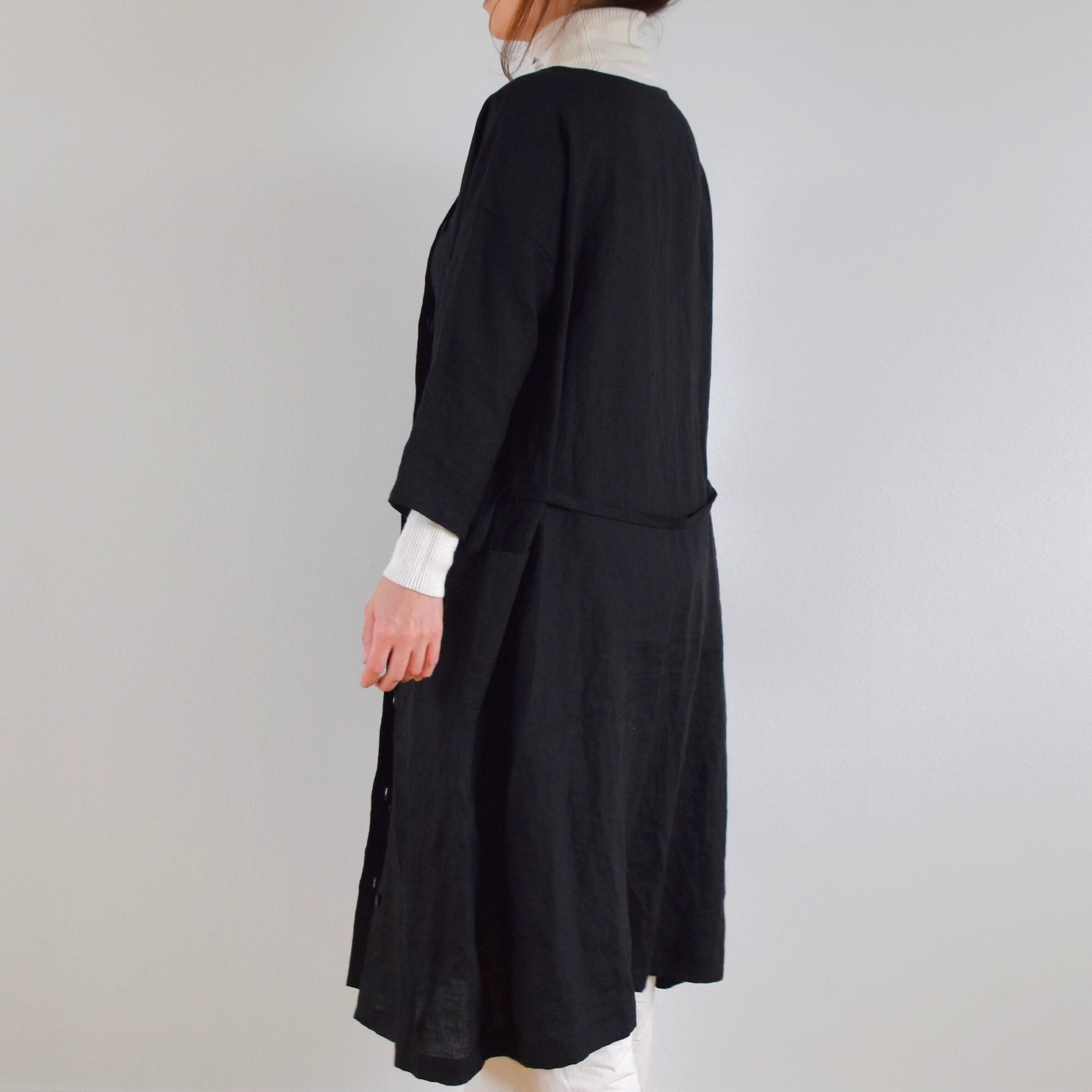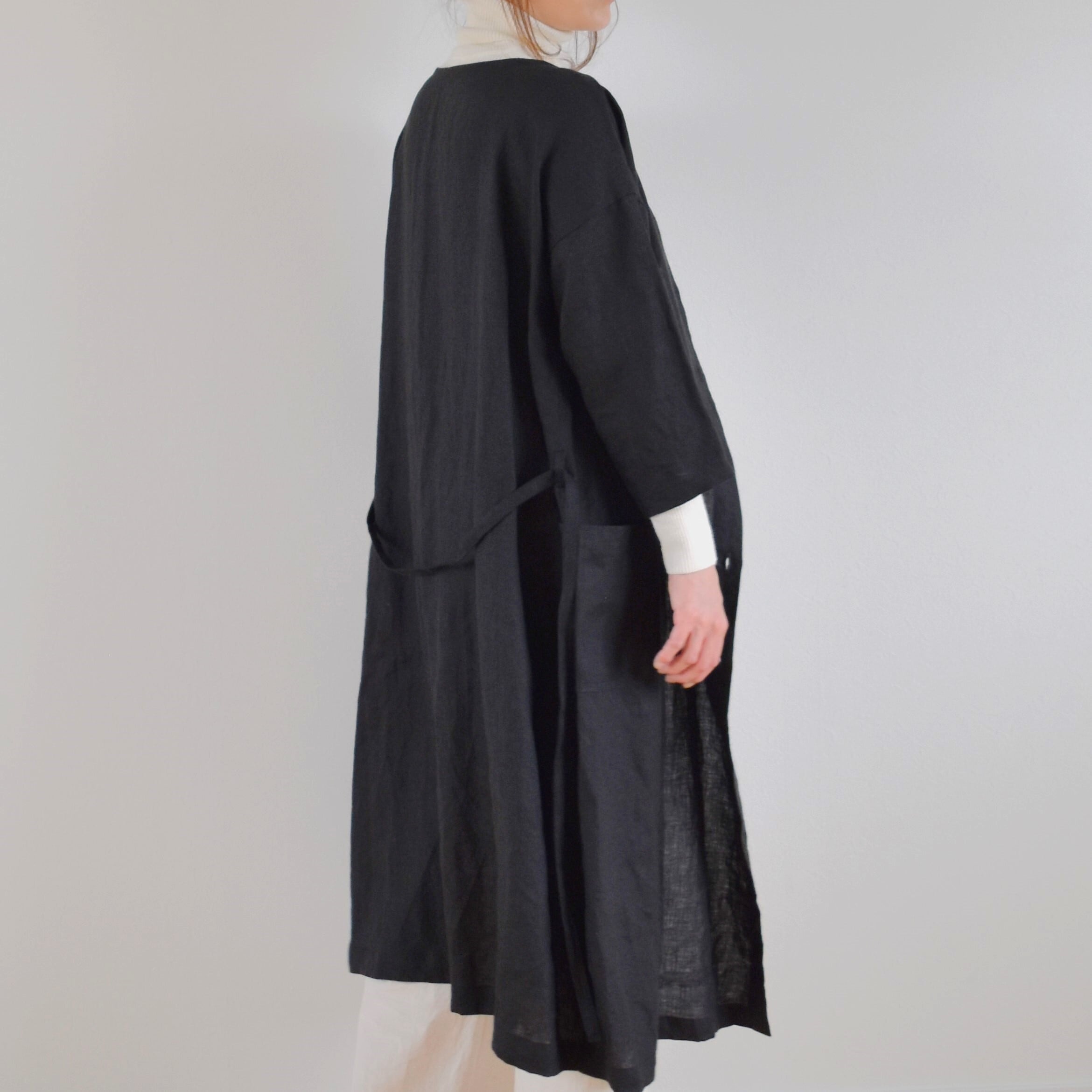リネン100% アシンメトリー コートワンピース/ブラック