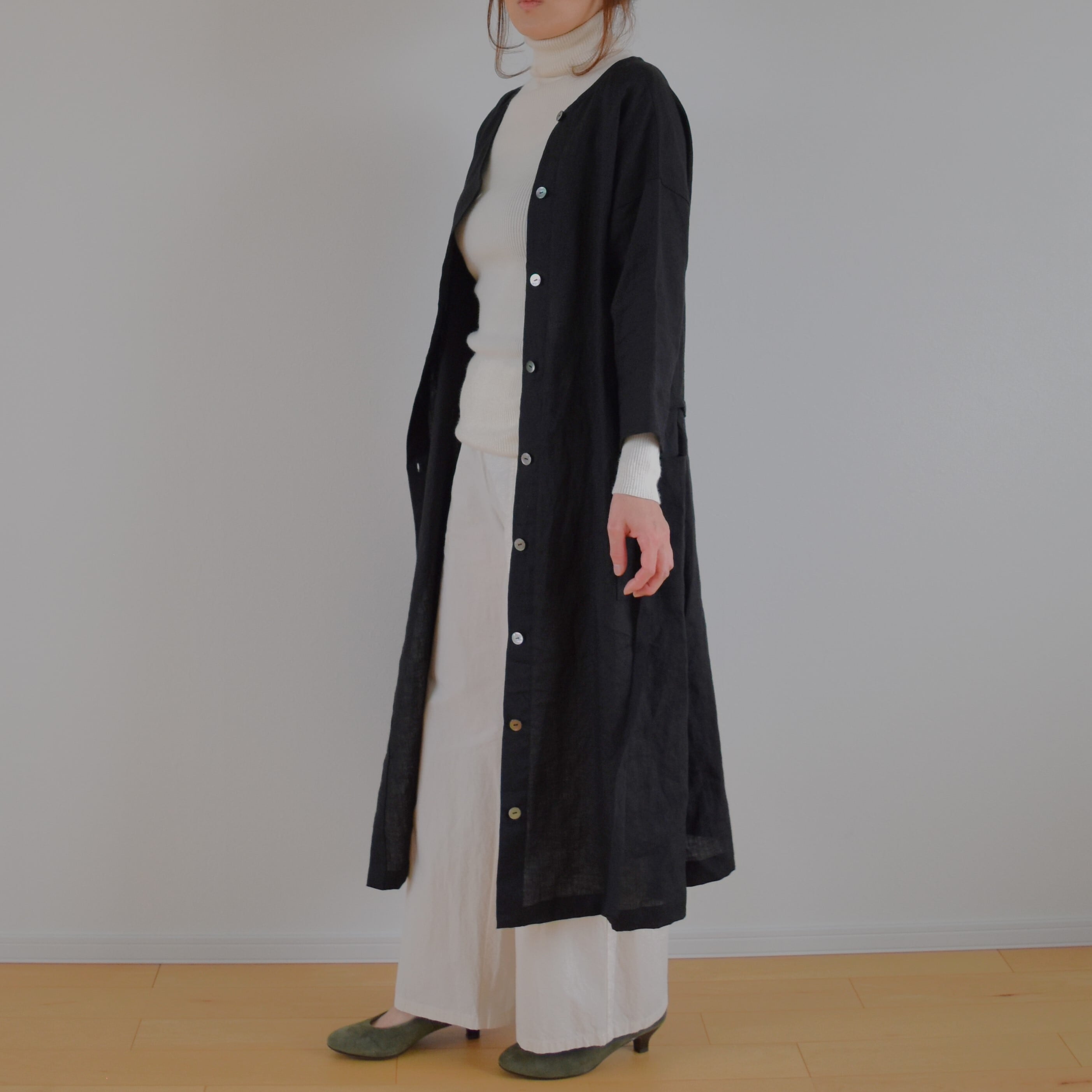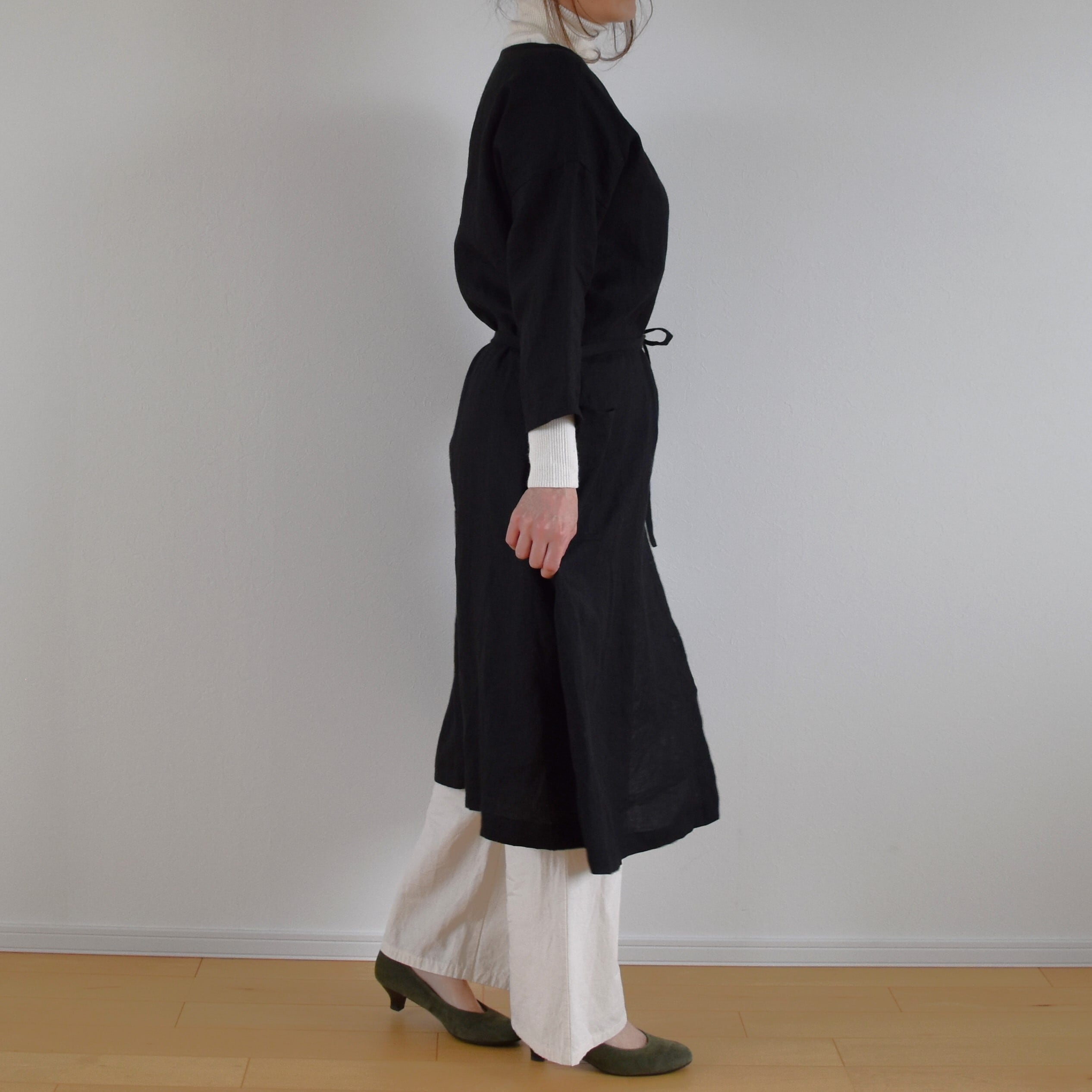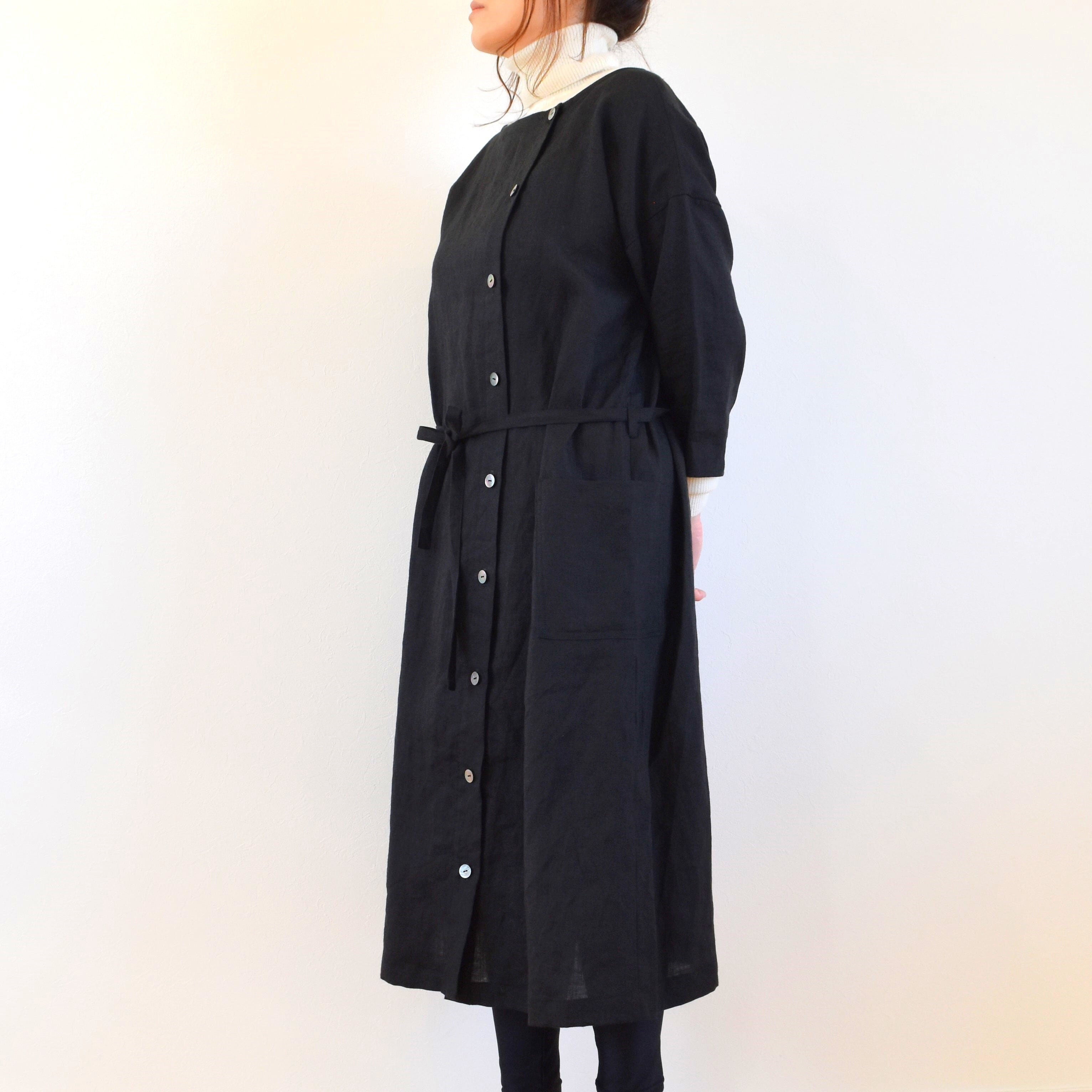 リネン100% アシンメトリー コートワンピース/ブラック