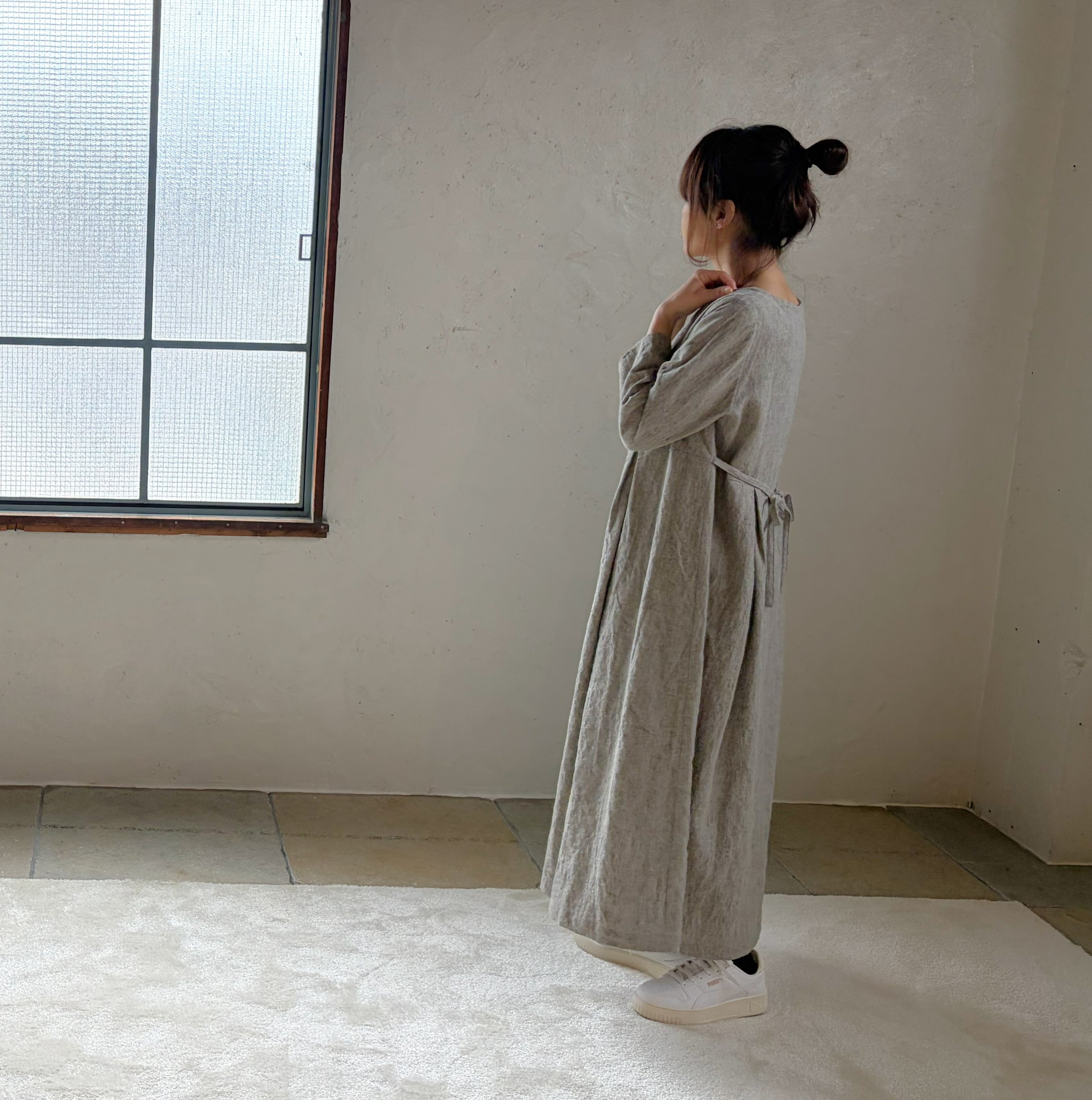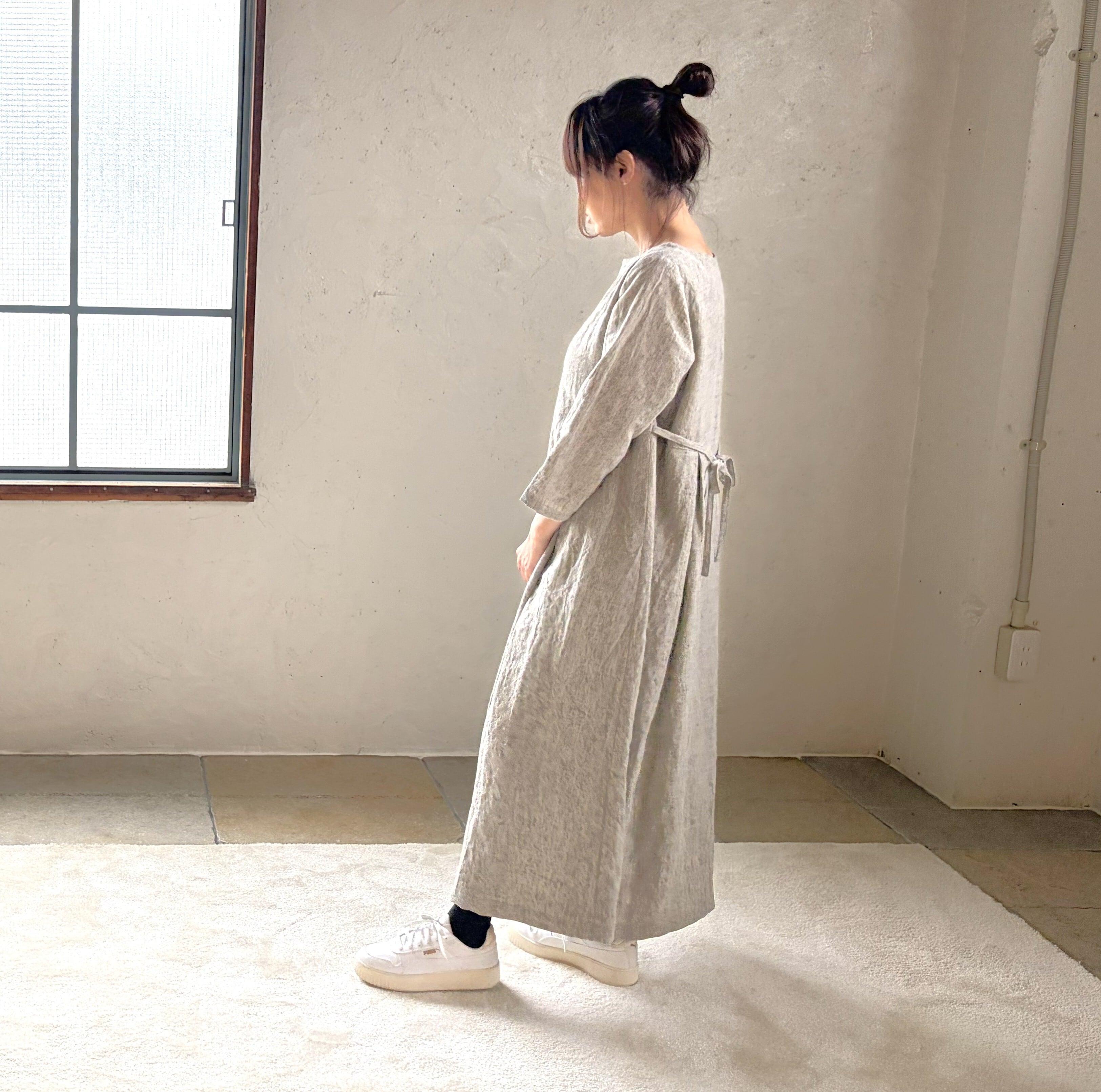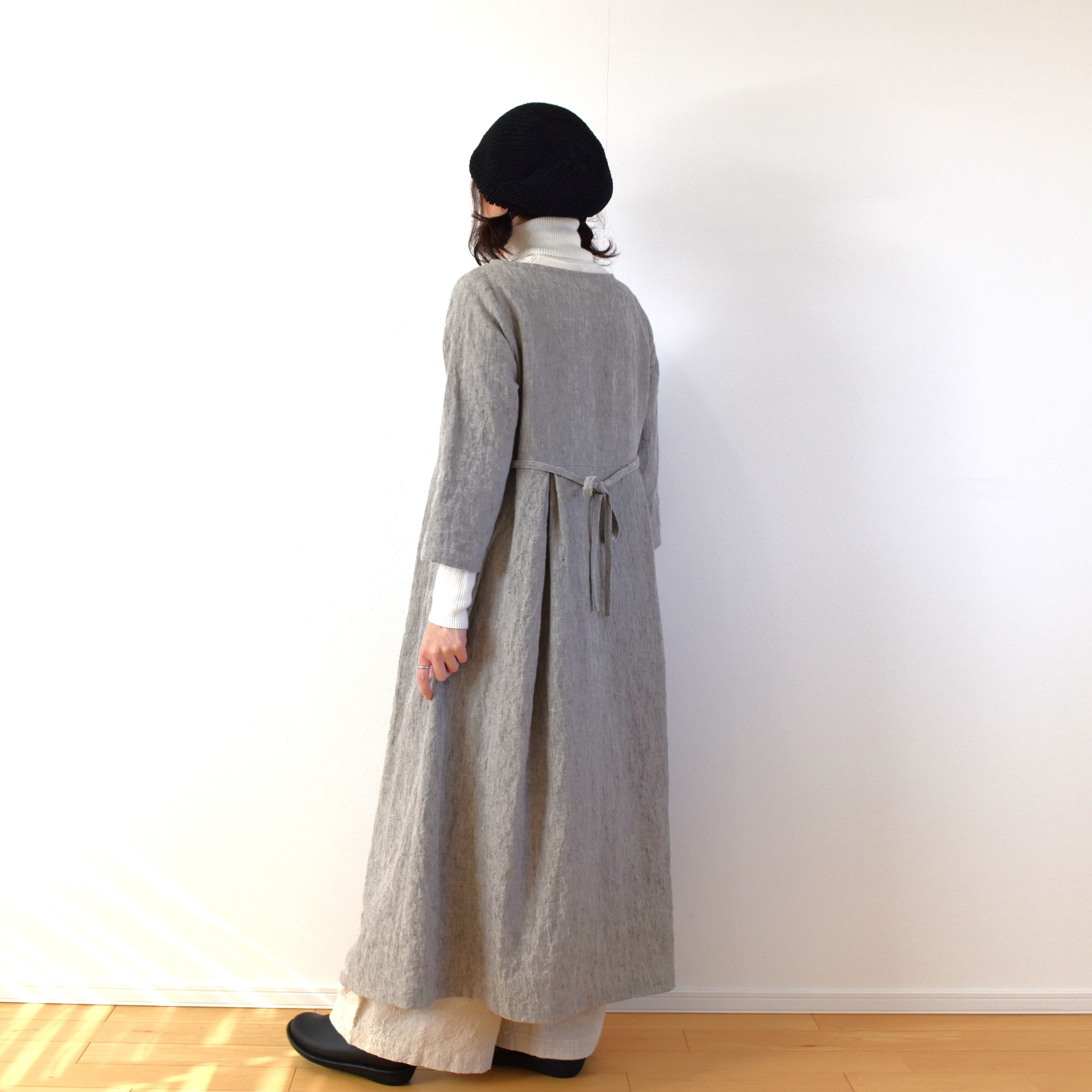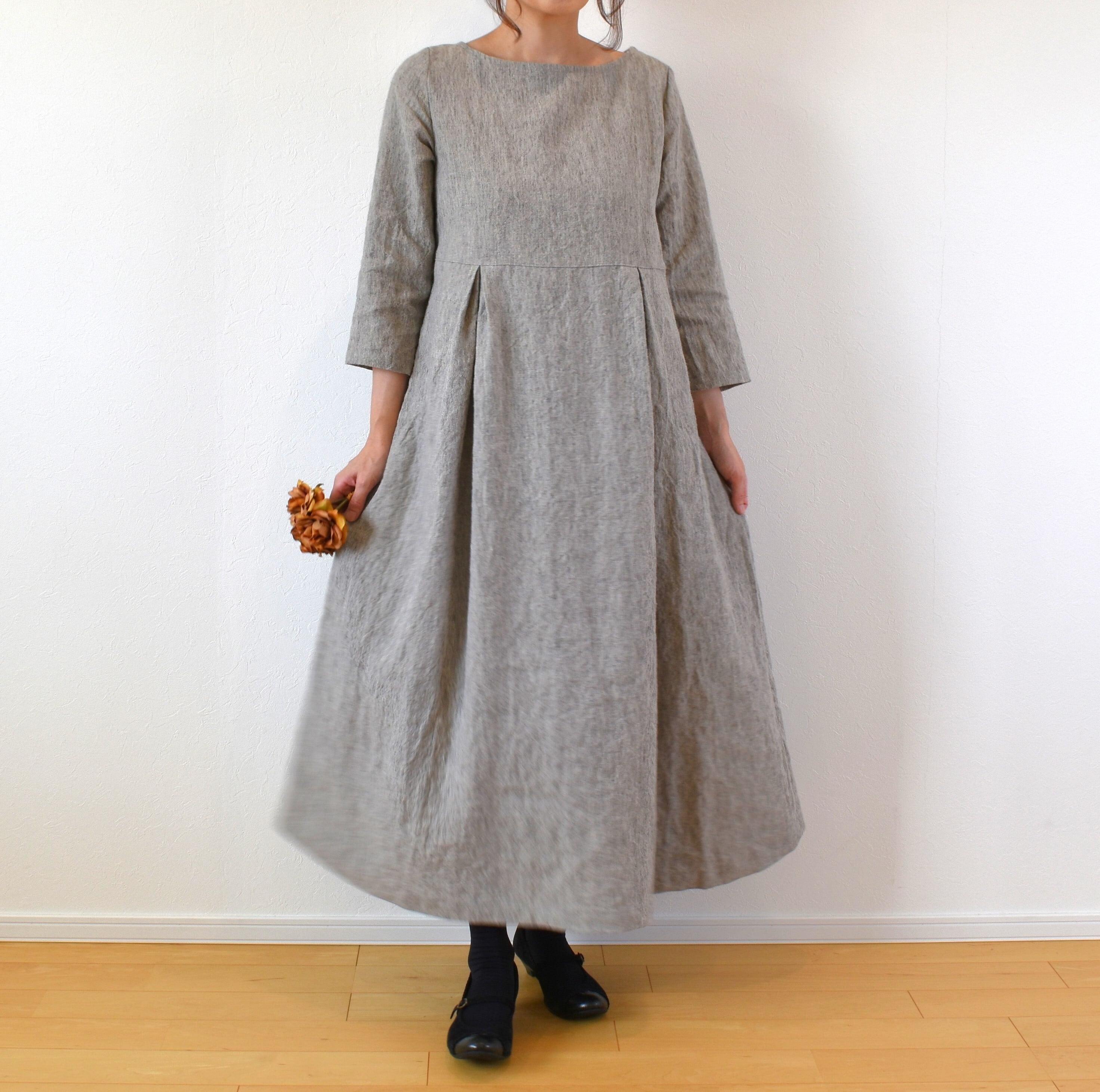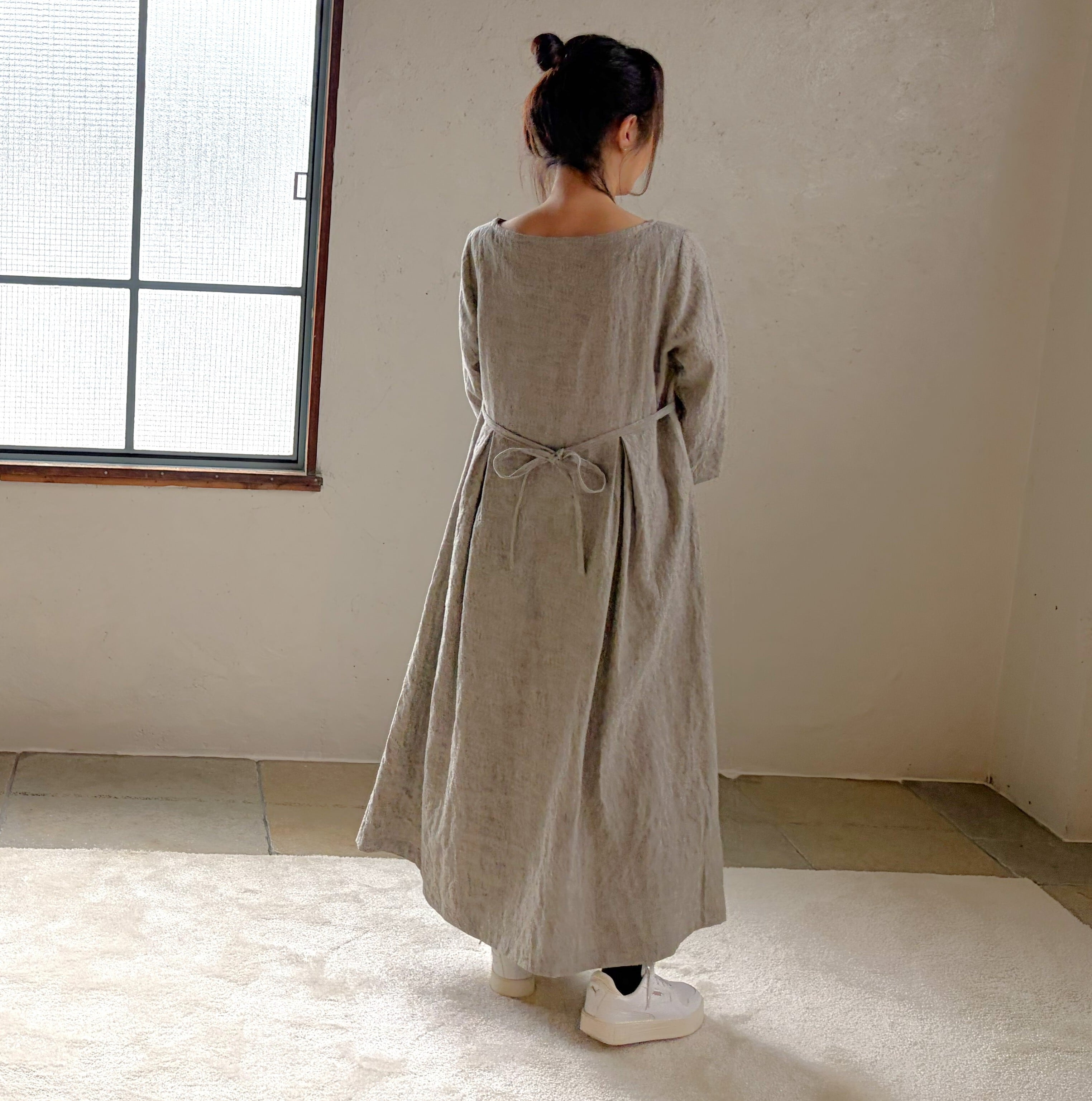 奥行きのある色調の 中厚のリネン生地を使い、ベーシックスタイルのワンピースを作りました。