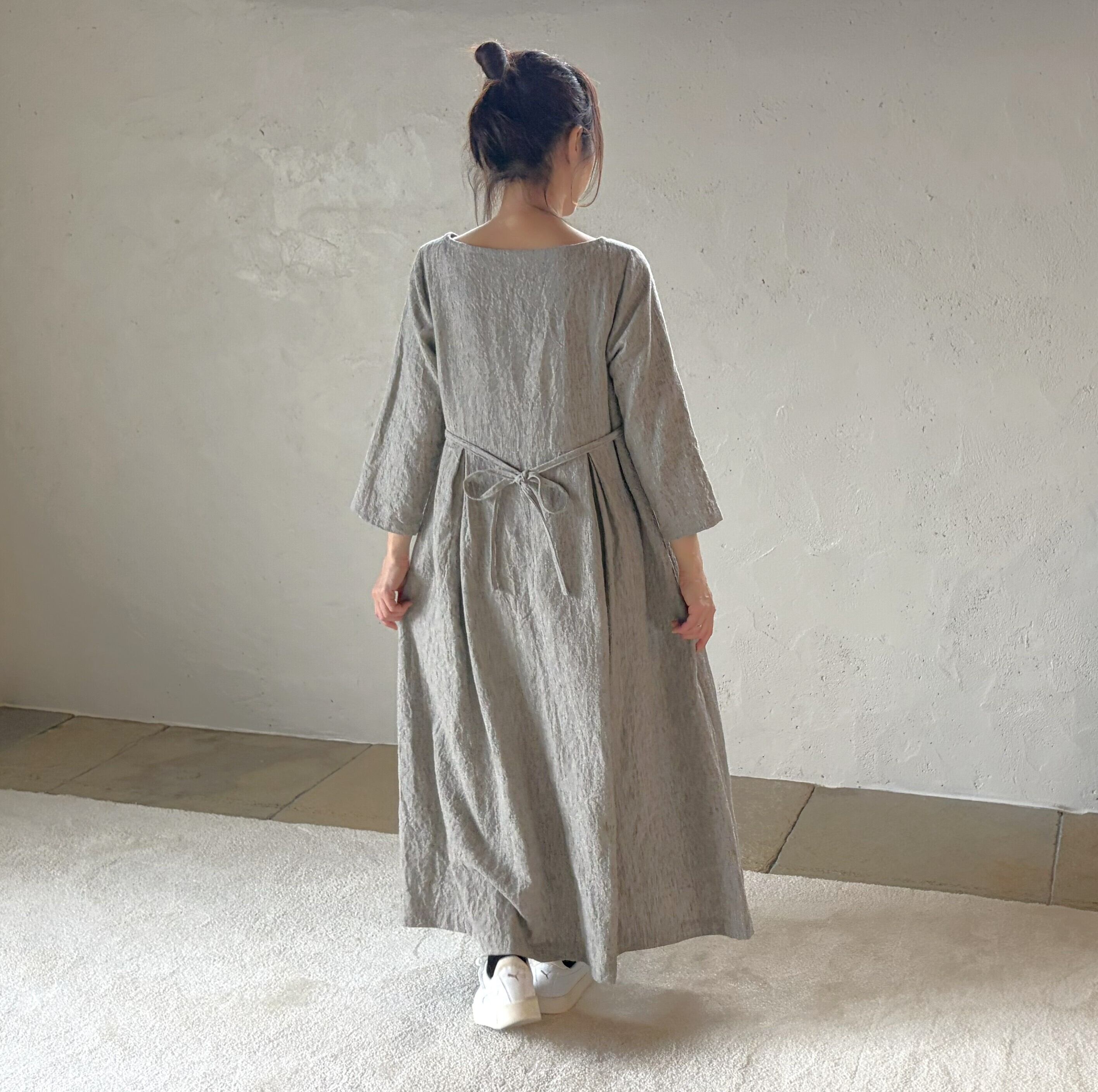 濃淡のある色味と、独特のシボ感が魅力の生地で、一枚で存在感たっぷりのワンピースに仕上がりました。