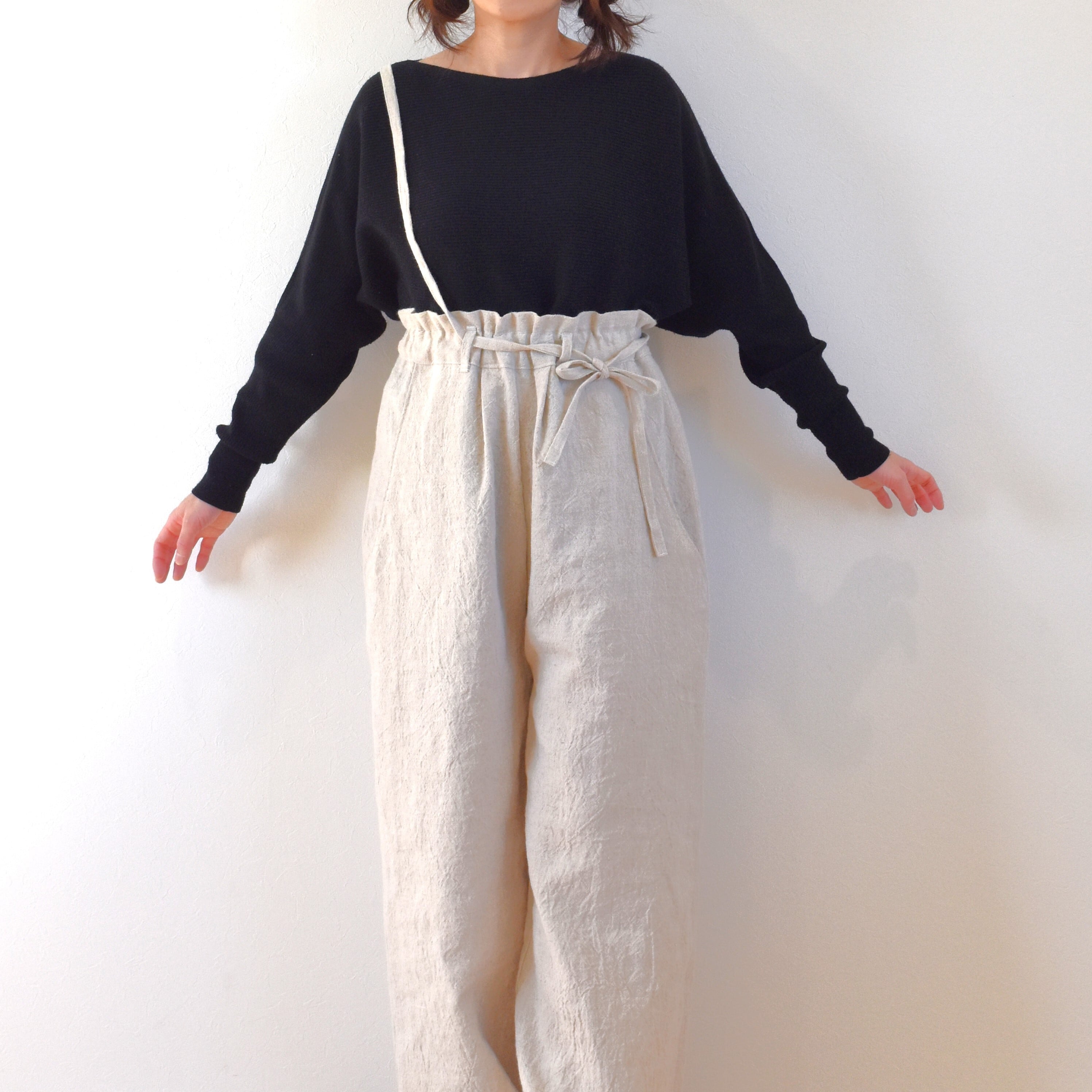 細くて長いリボンは ベルトループの位置を利用して色々なアレンジができます。正面で結んでもいいし 横にずらすのもおすすめ。股上も深くとってありますので、ウエスト位置を上げて両肩に掛けたり 片肩だけに掛けたりリボンの位置も移動できるので、好きな場所で結べます。