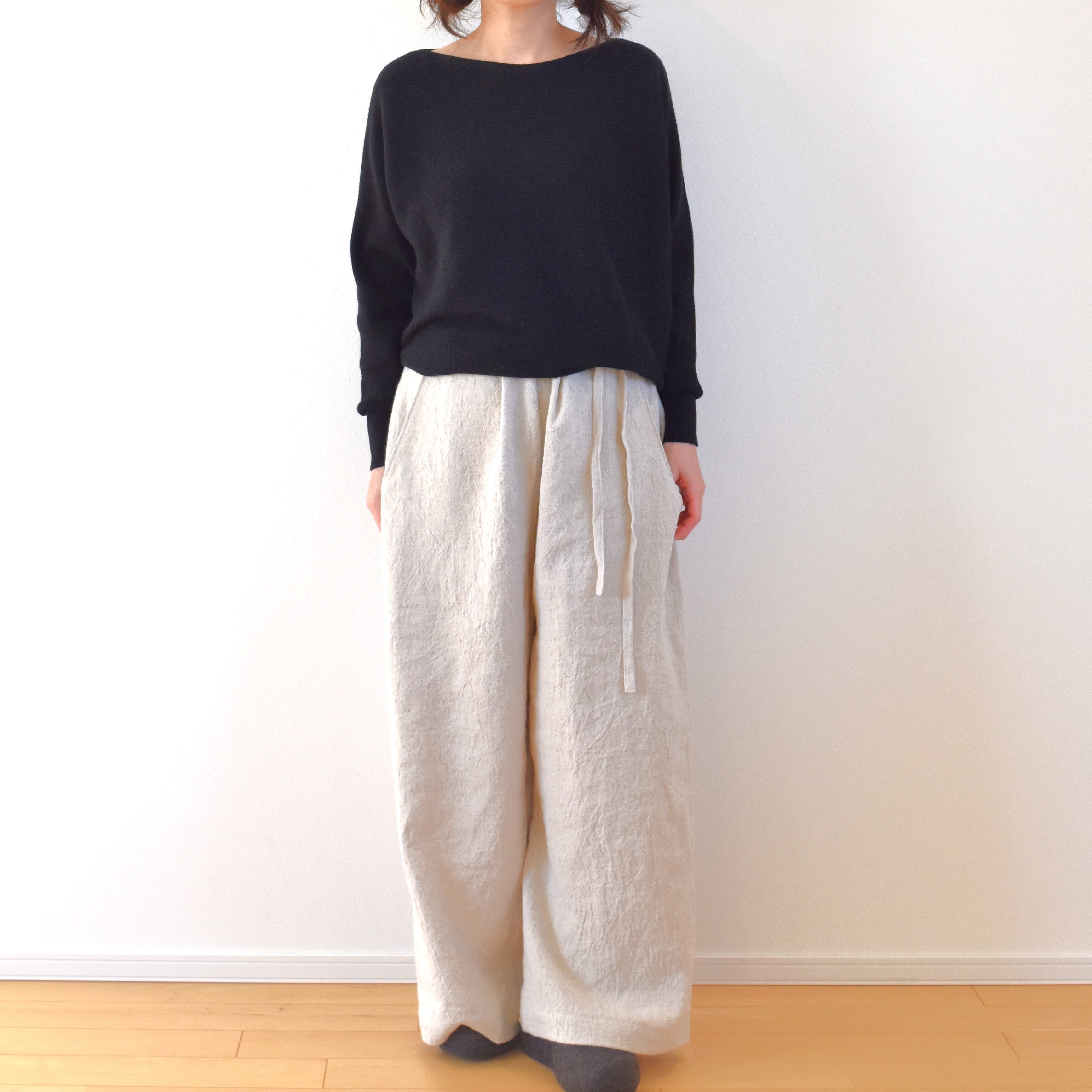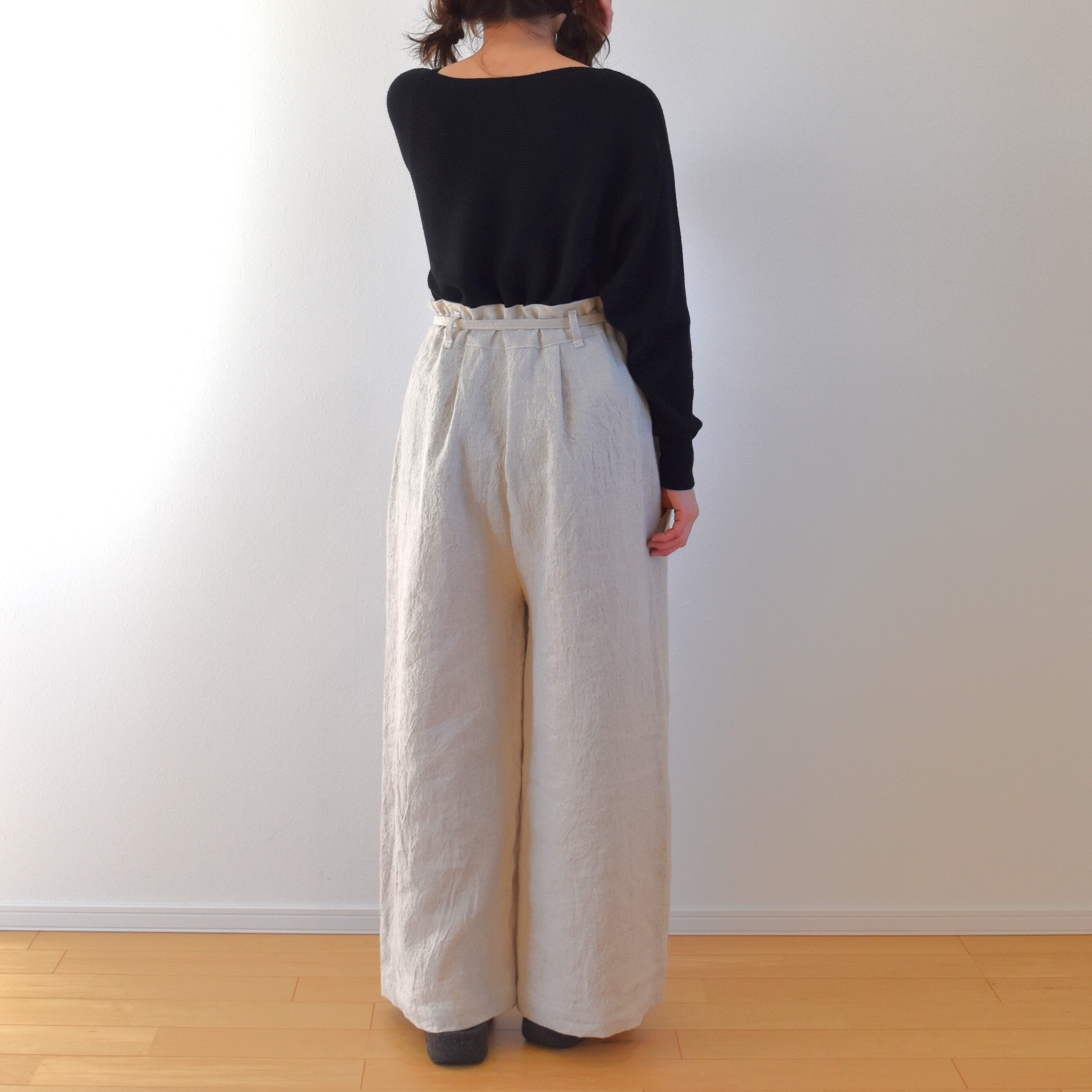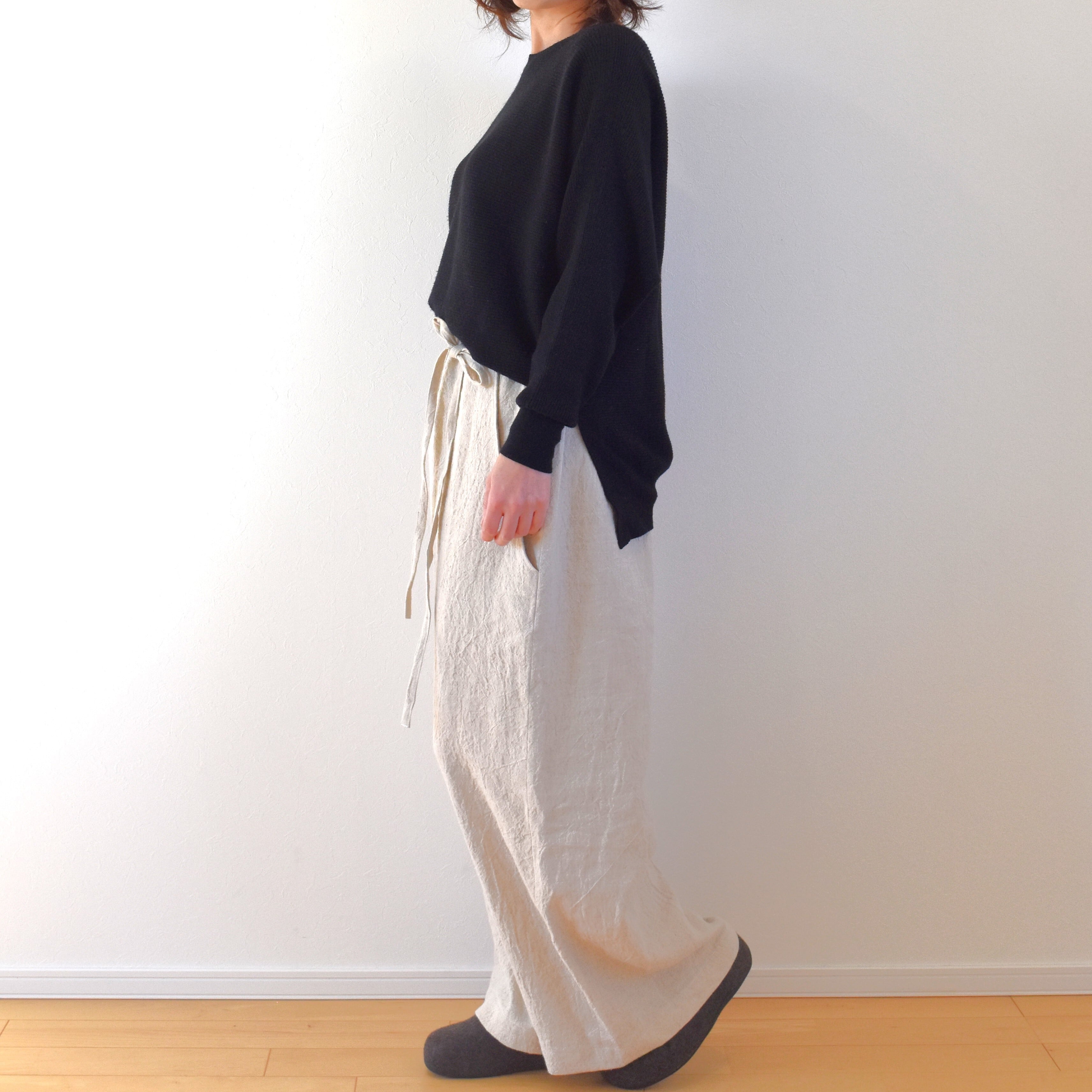 履き心地はサラリとした感触、ふっくらとしたハリと 柔らかさを兼ね備えたリネン生地で、あたたかみを感じられる厚手のリネンにウールが10%混紡されていますので ぬくもりのある雰囲気です。表面のシボと こなれたユーズド感による独特の存在感も魅力です。
