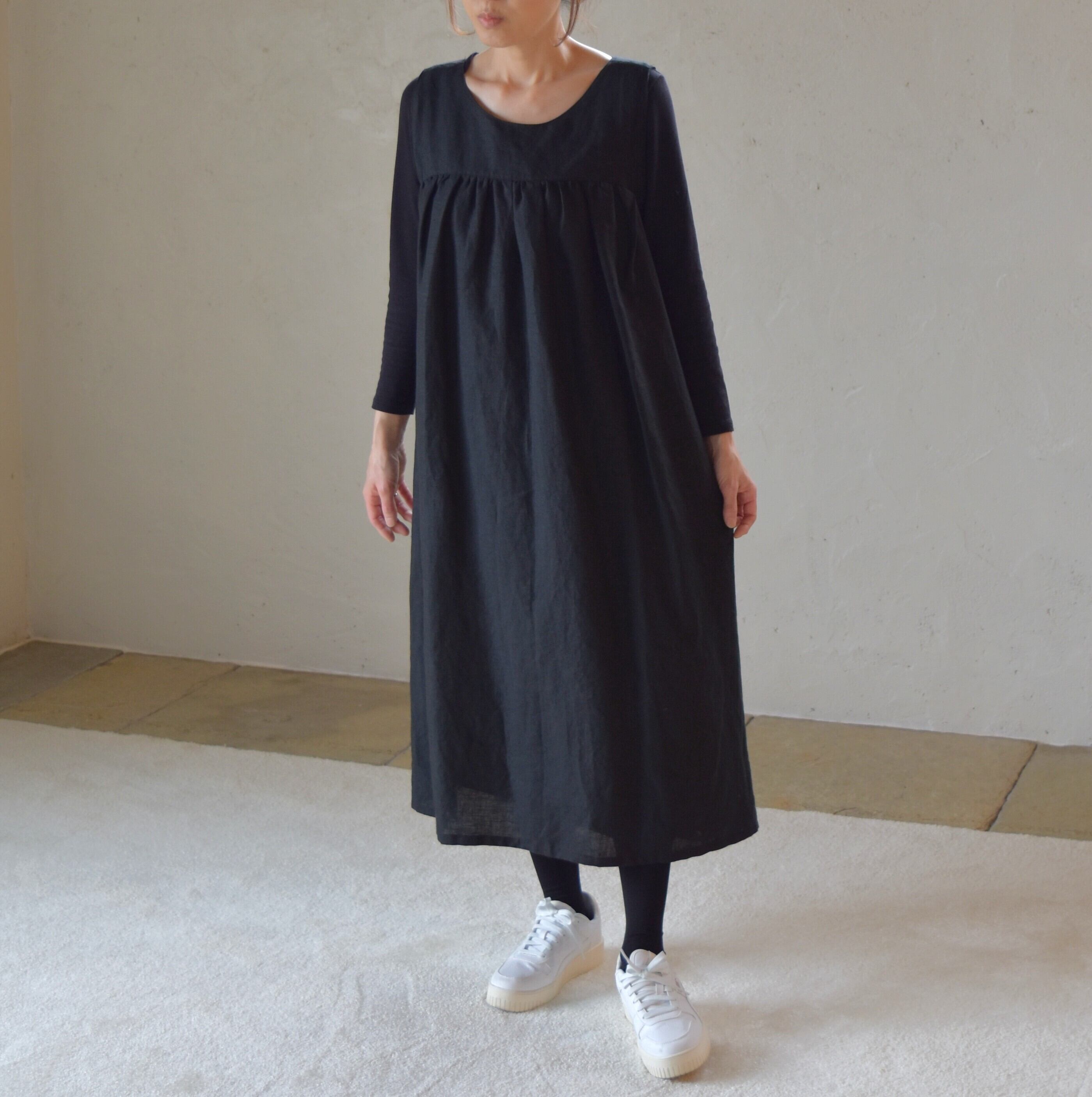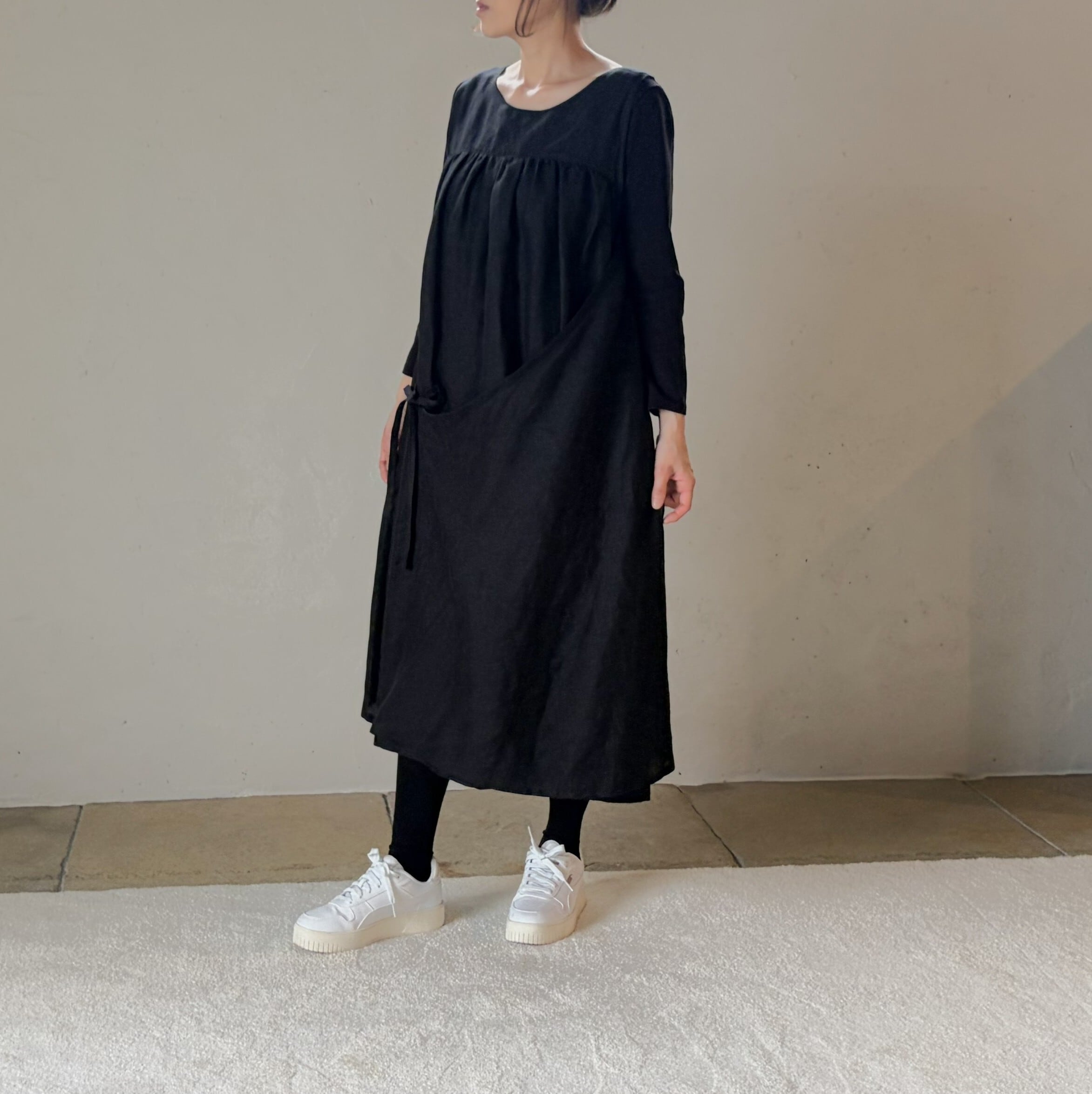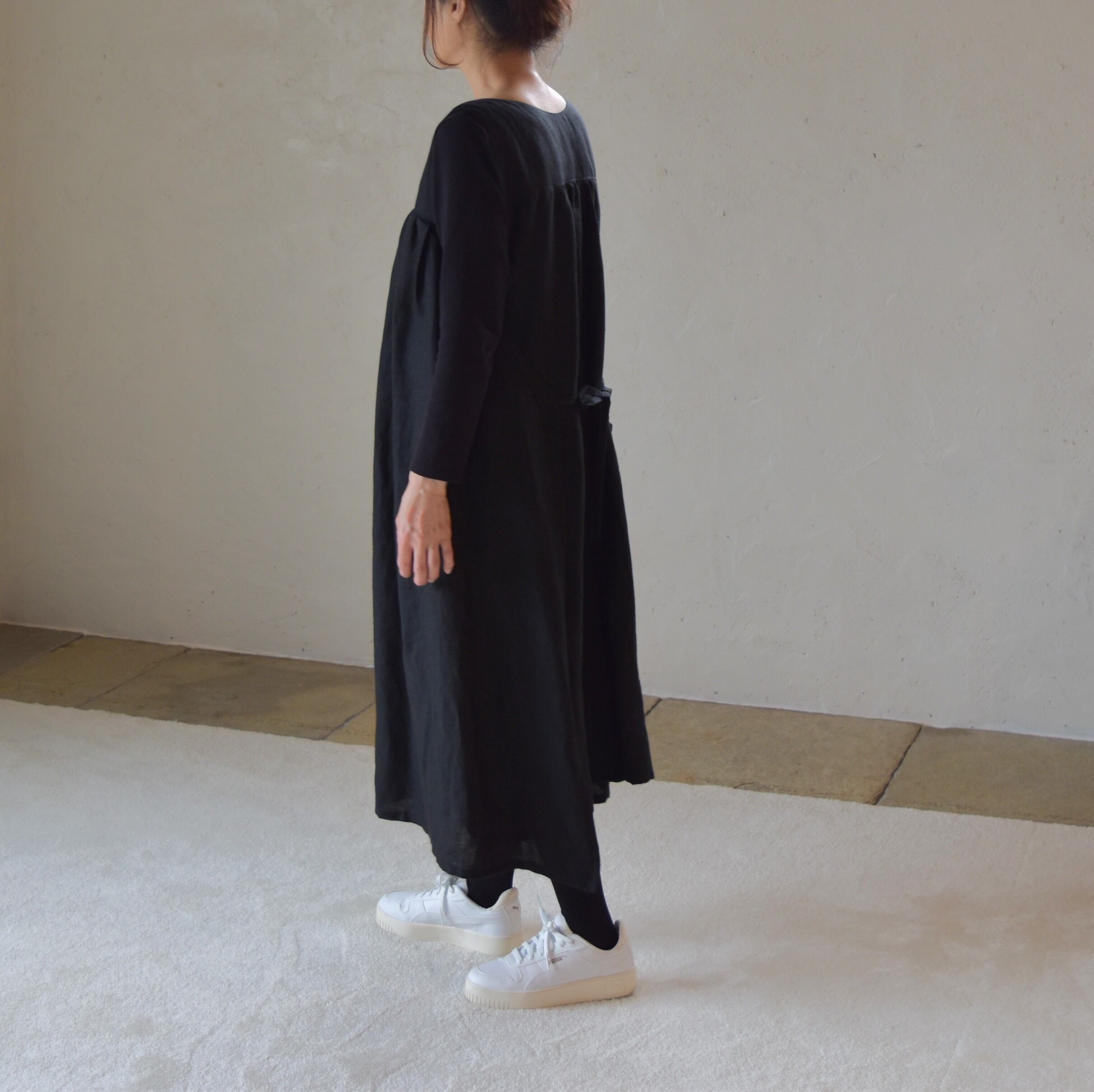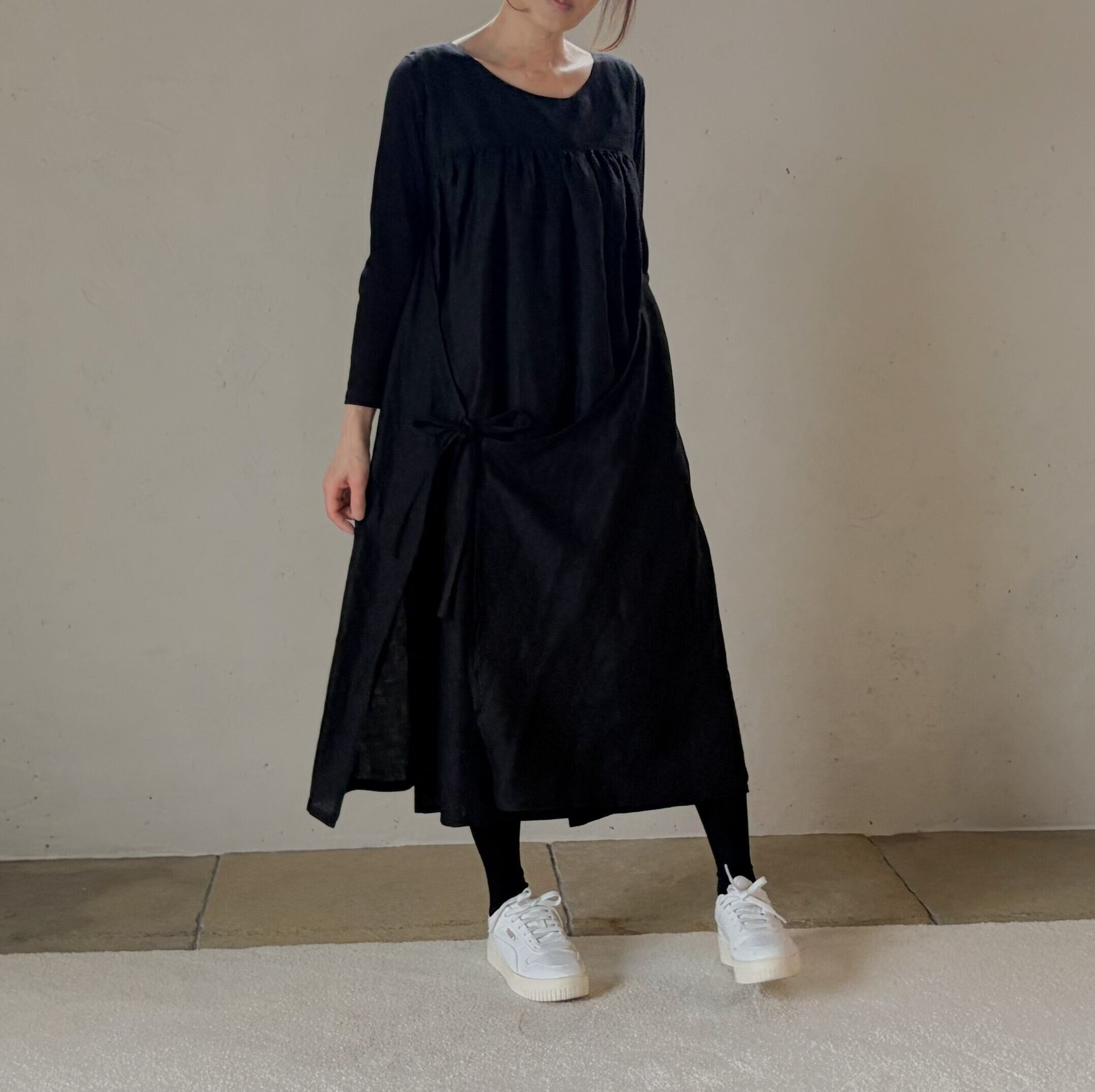 リネン100% アシンメトリー エプロン ギャザーワンピース/ブラック