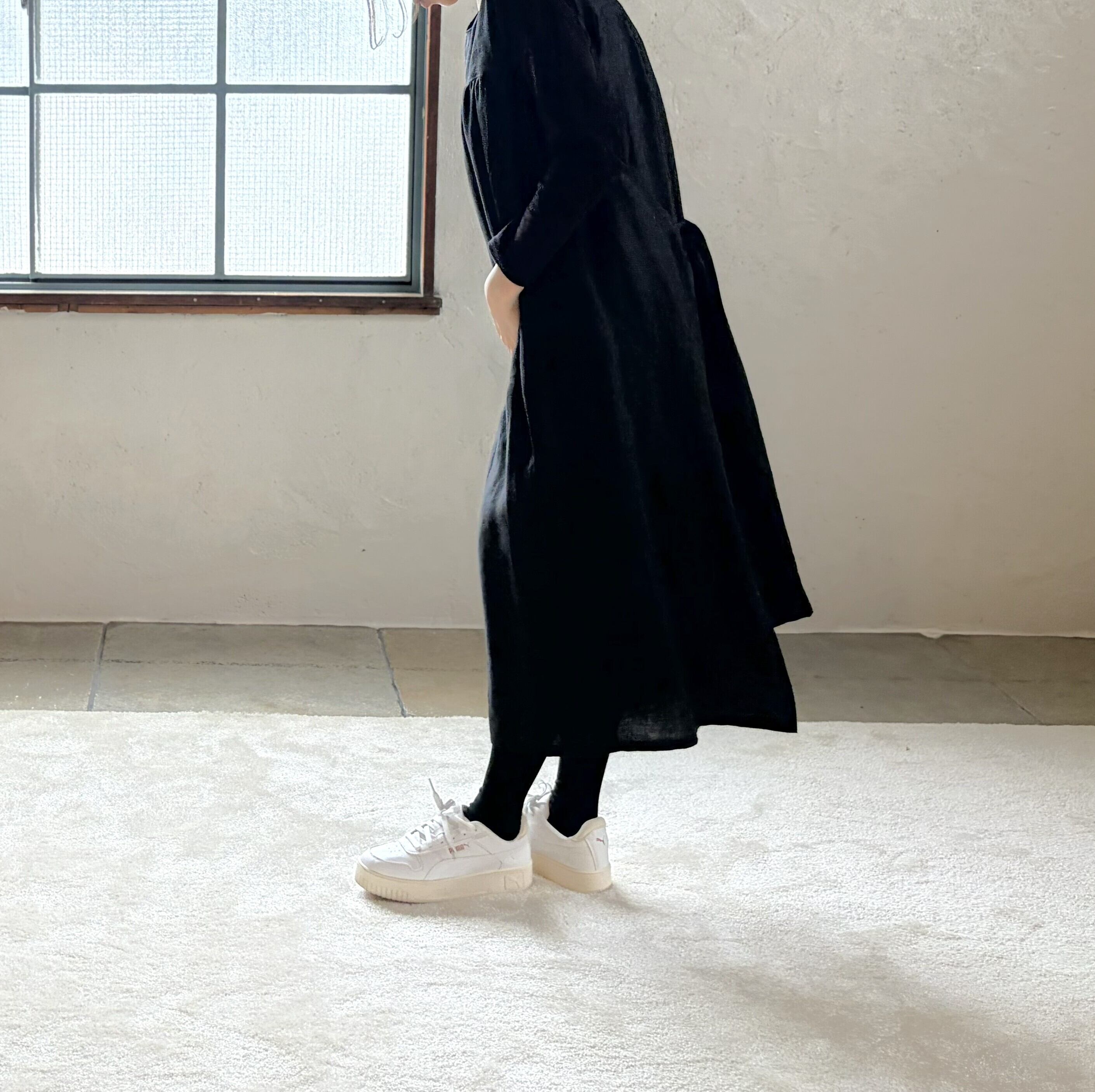 少しの光沢とハリ感がある魅力的なリネン生地ですので 普段使いにも お出掛け着としても どんな場面にも着用して頂けると思います。