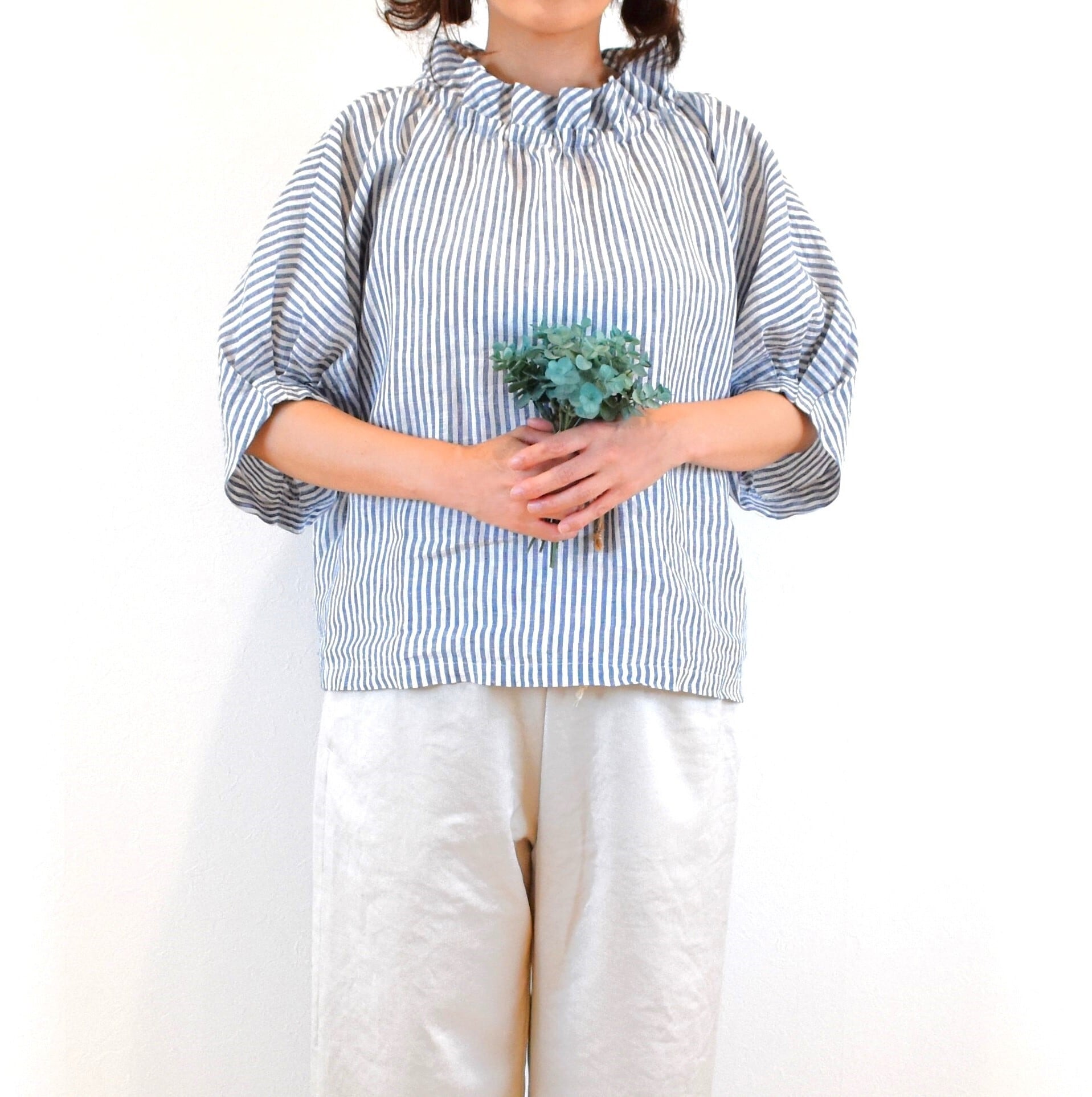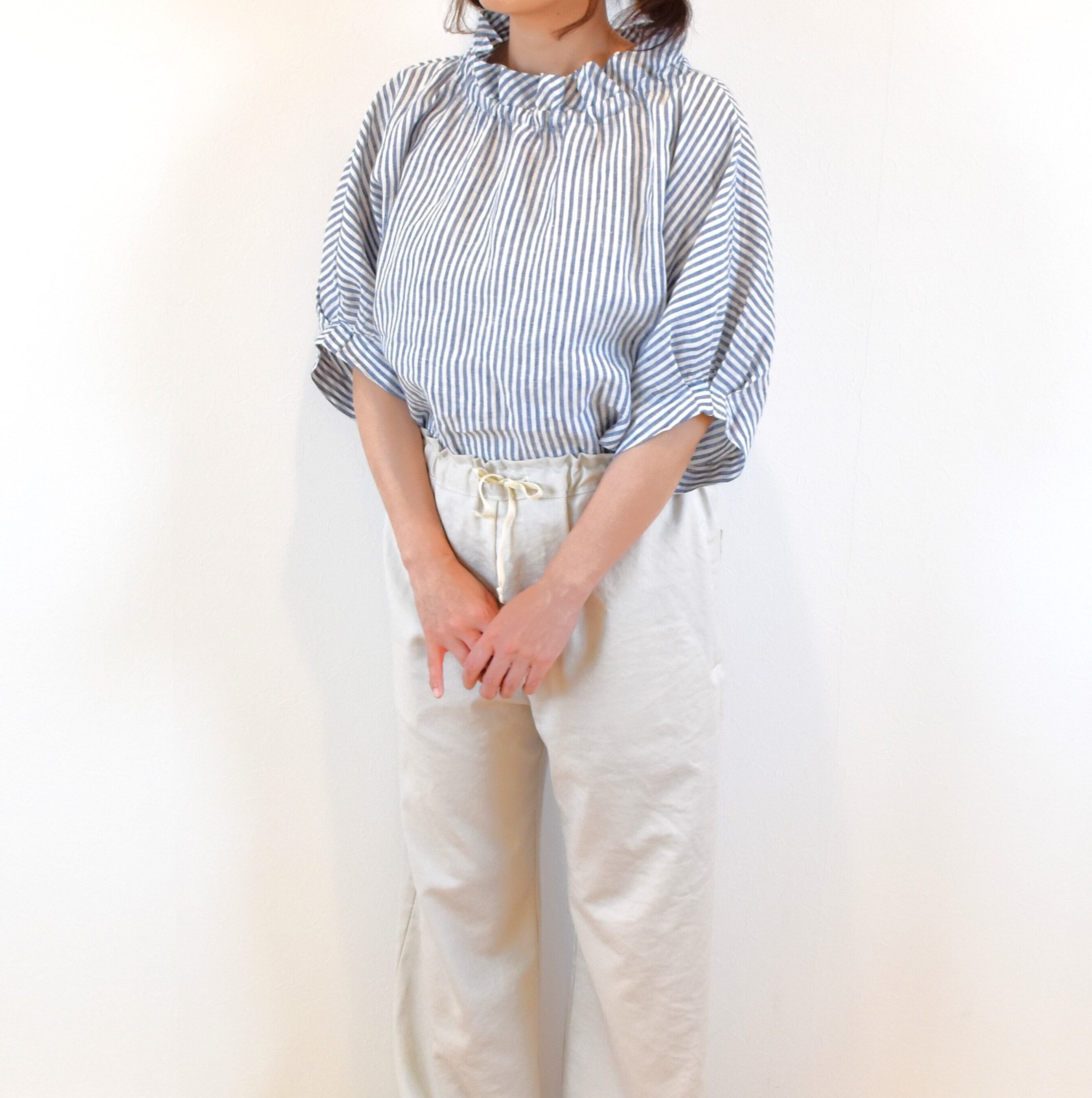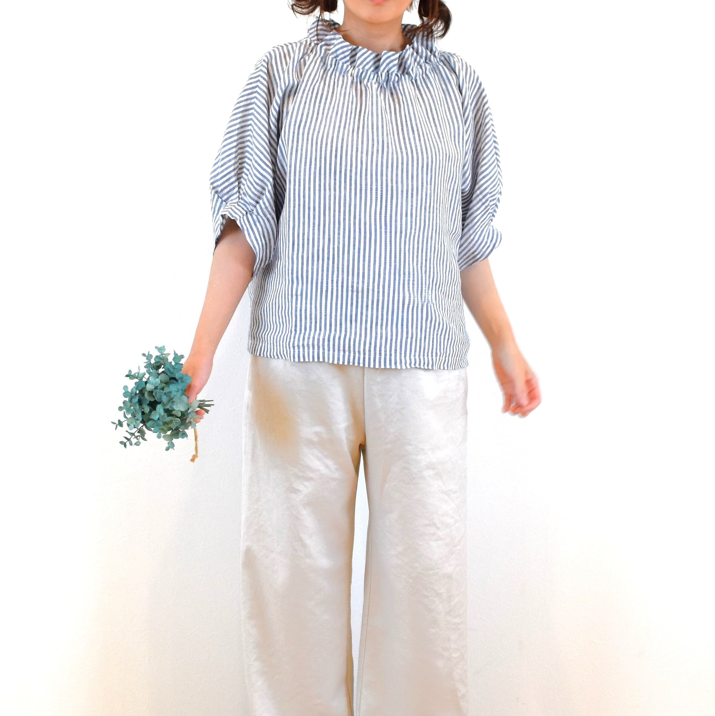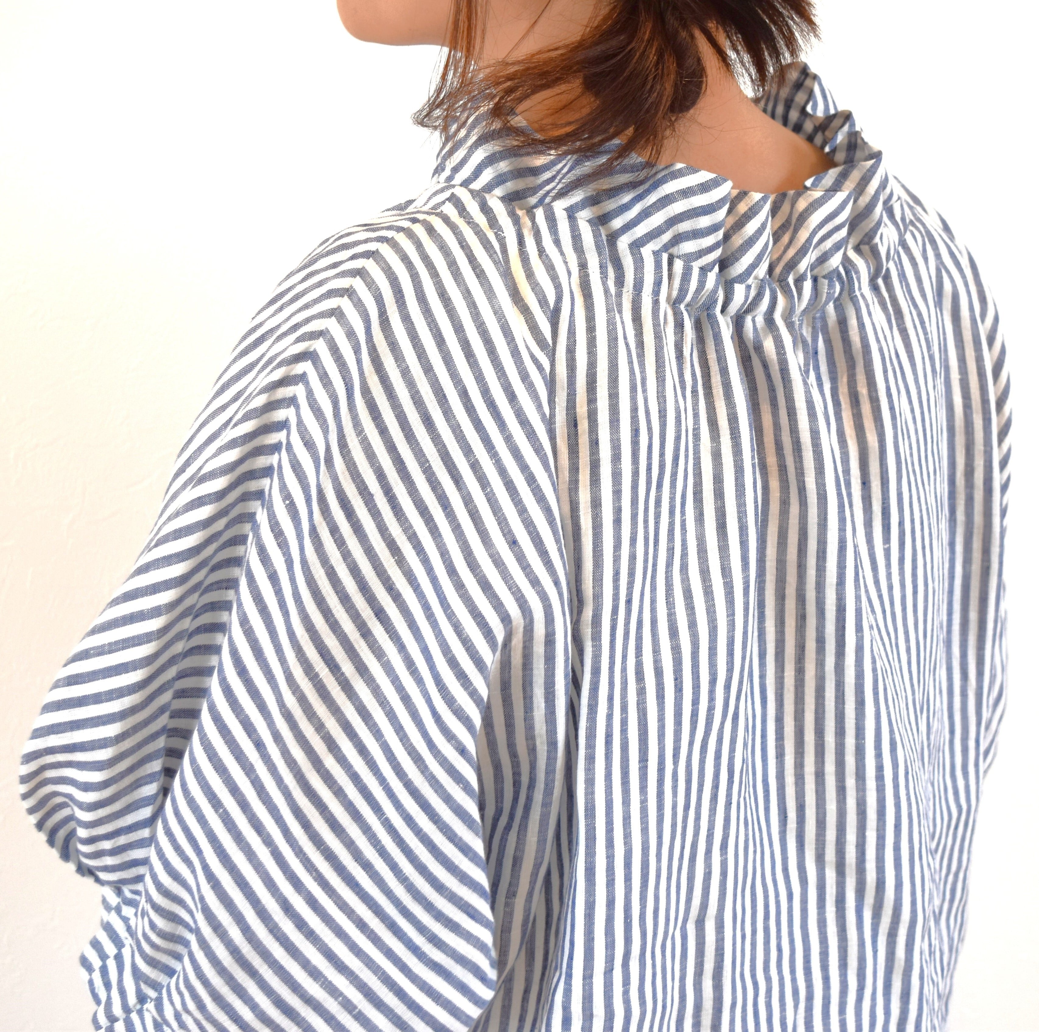 さらりとした肌触りの 優しいリネン生地でクールな印象のストライプ柄を、ナチュラルで可愛らしい雰囲気のブラウスに仕上げました。