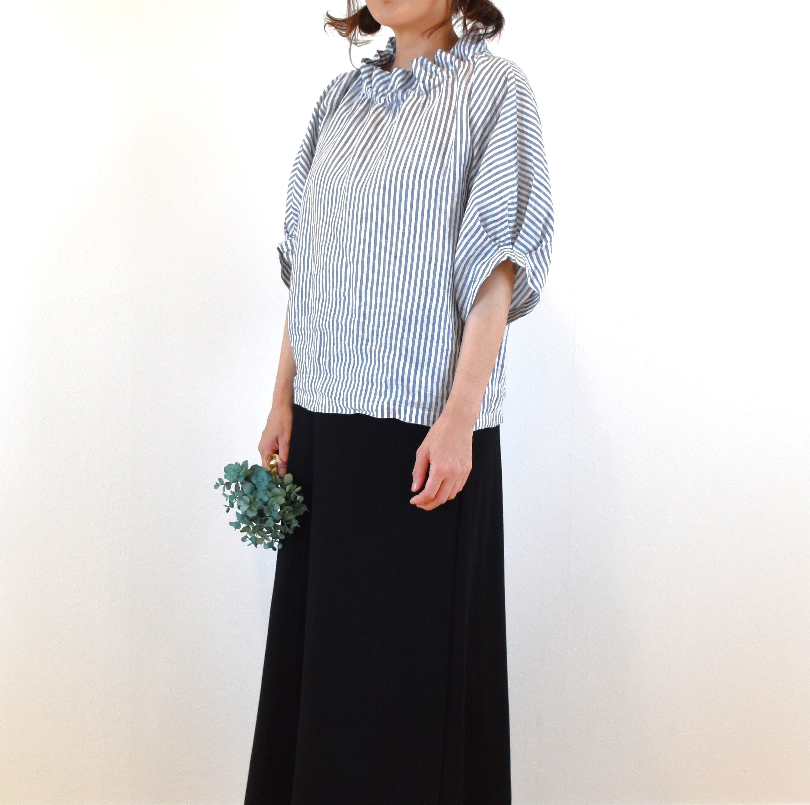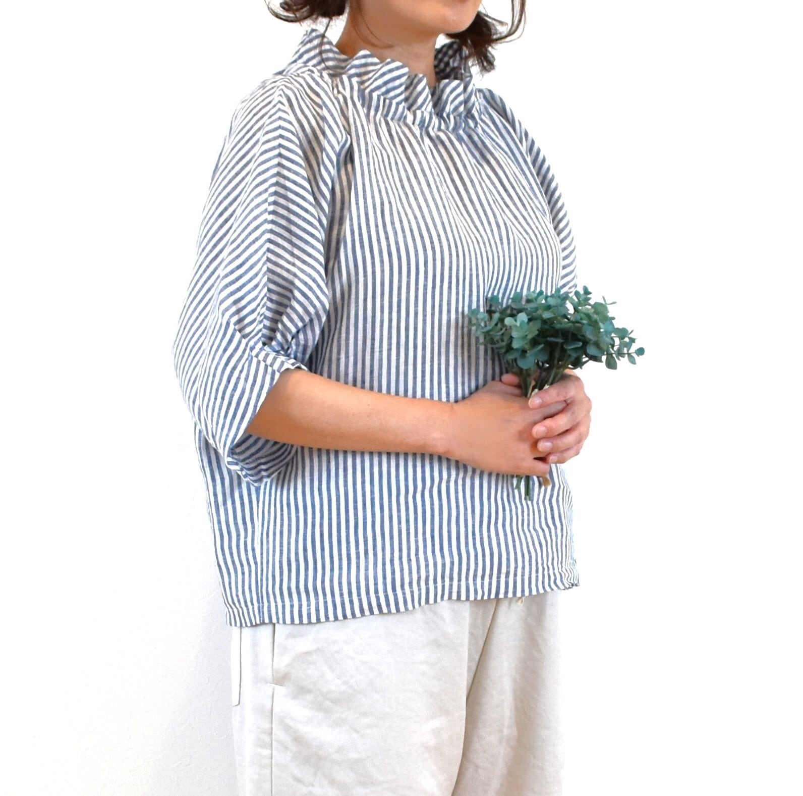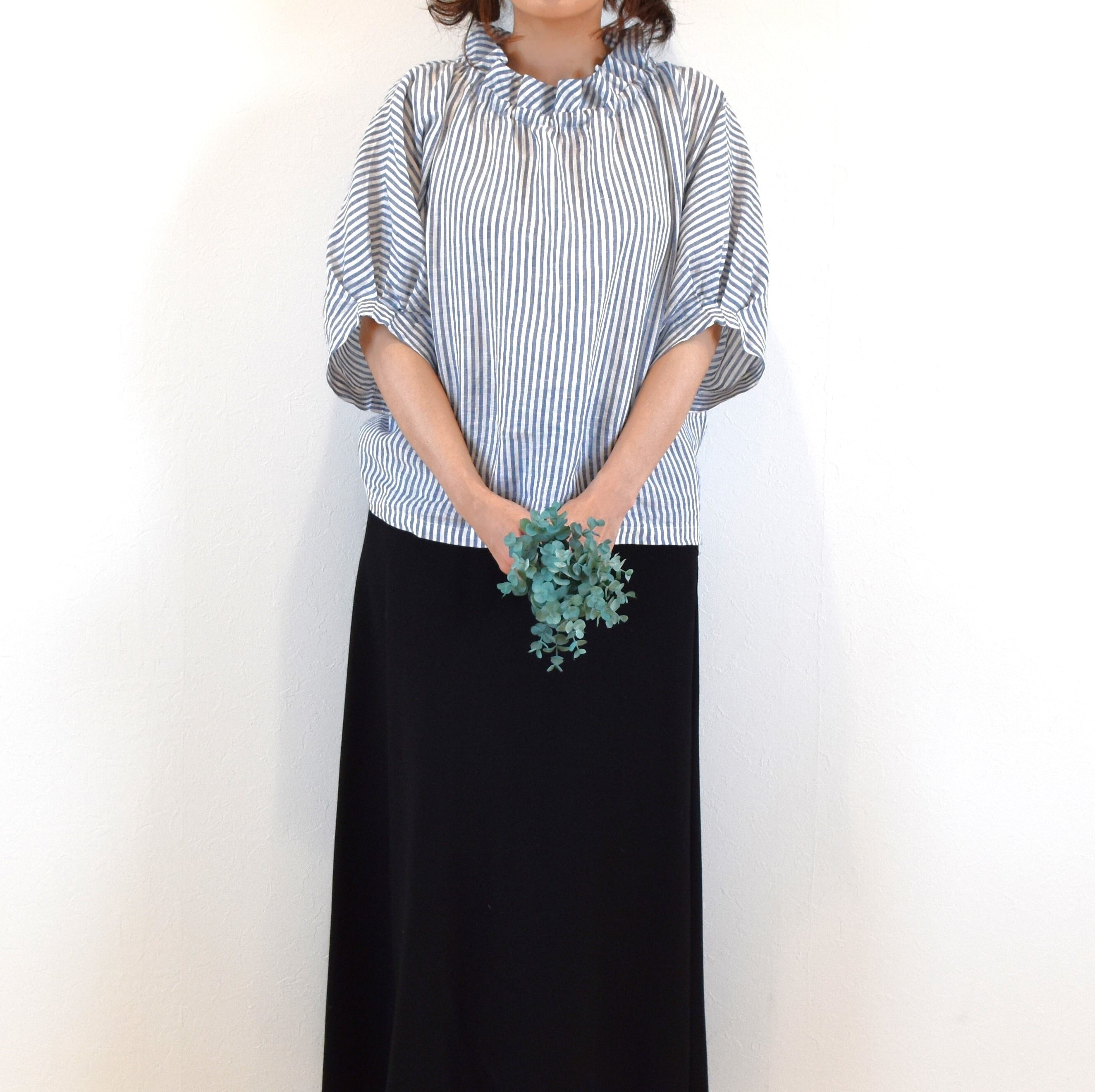 さらりとした肌触りの 優しいリネン生地でクールな印象のストライプ柄を、ナチュラルで可愛らしい雰囲気のブラウスに仕上げました。