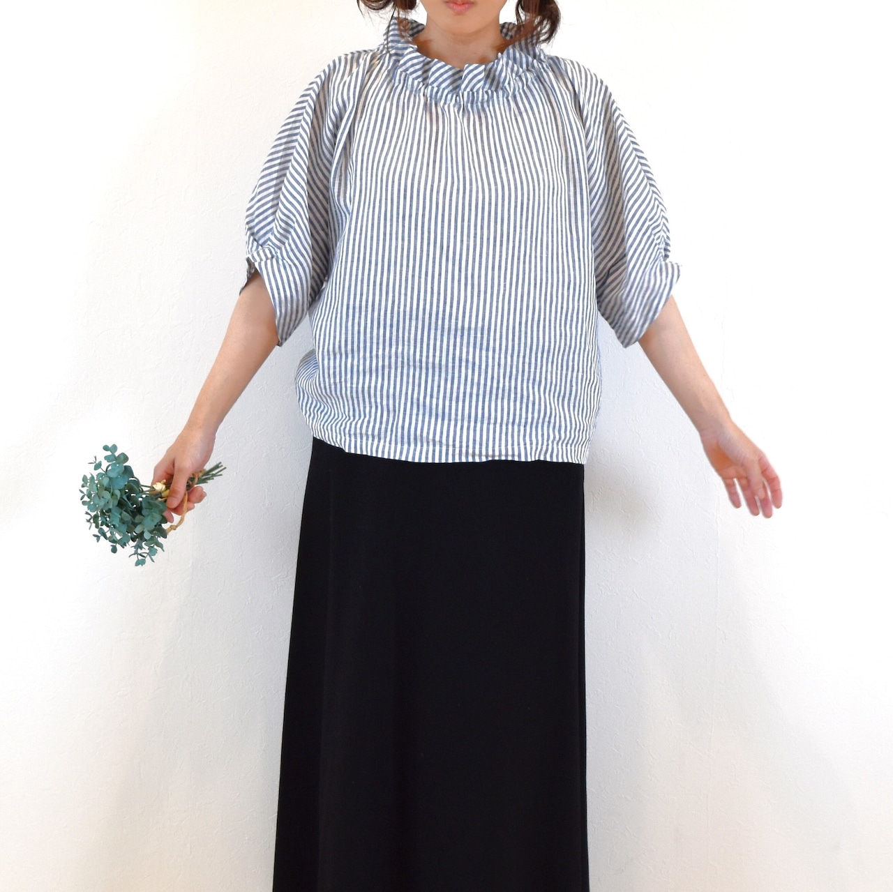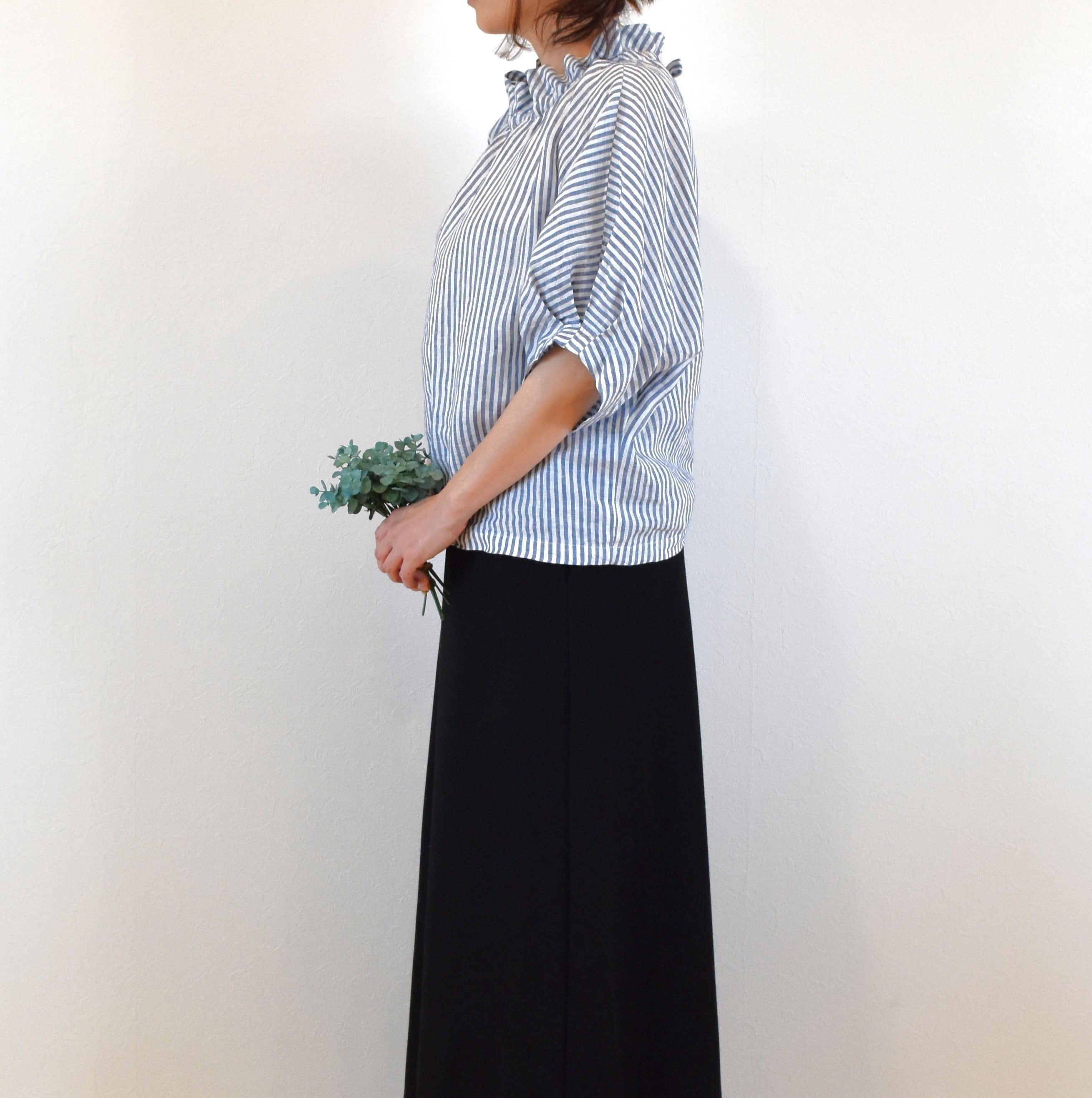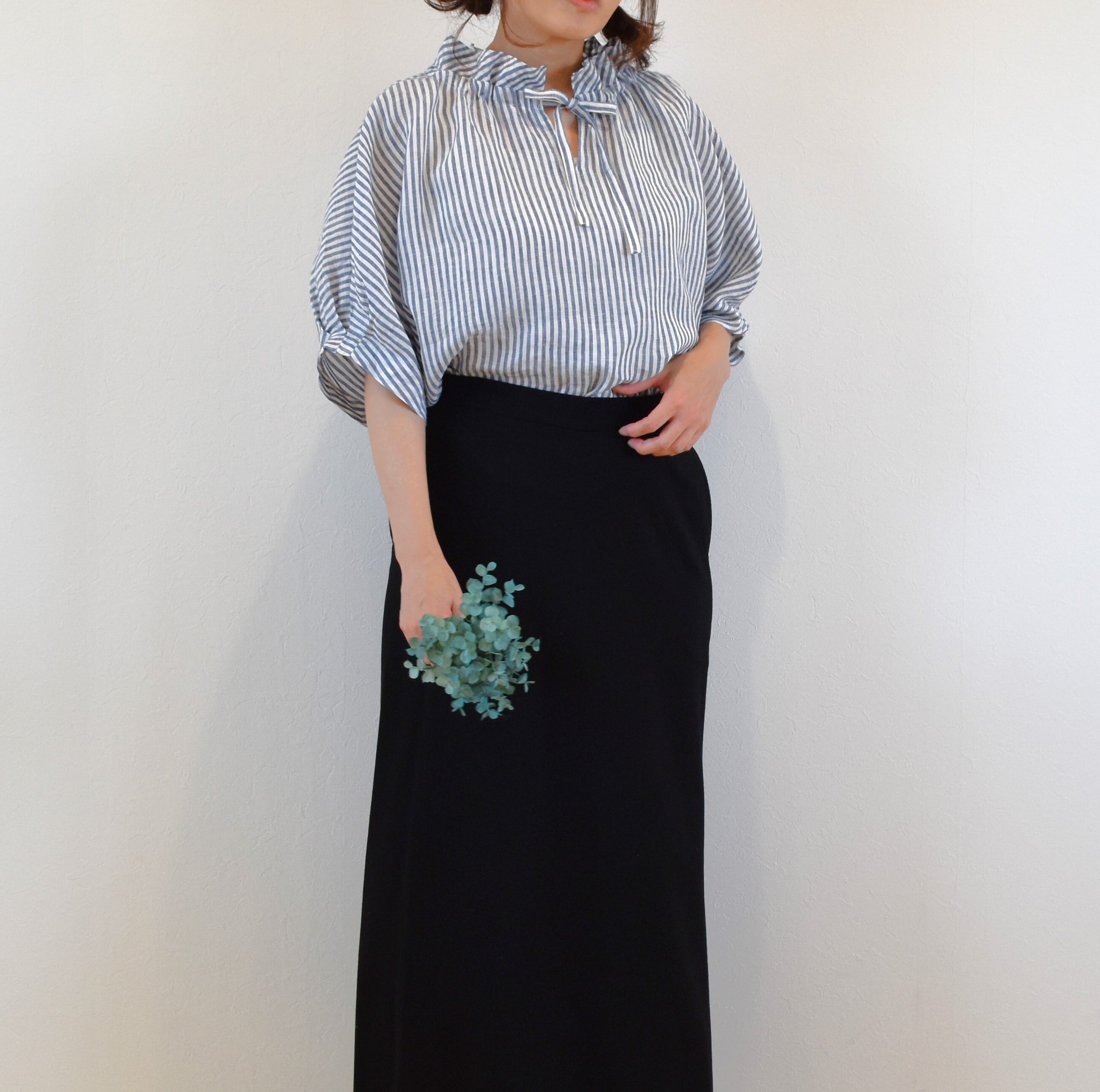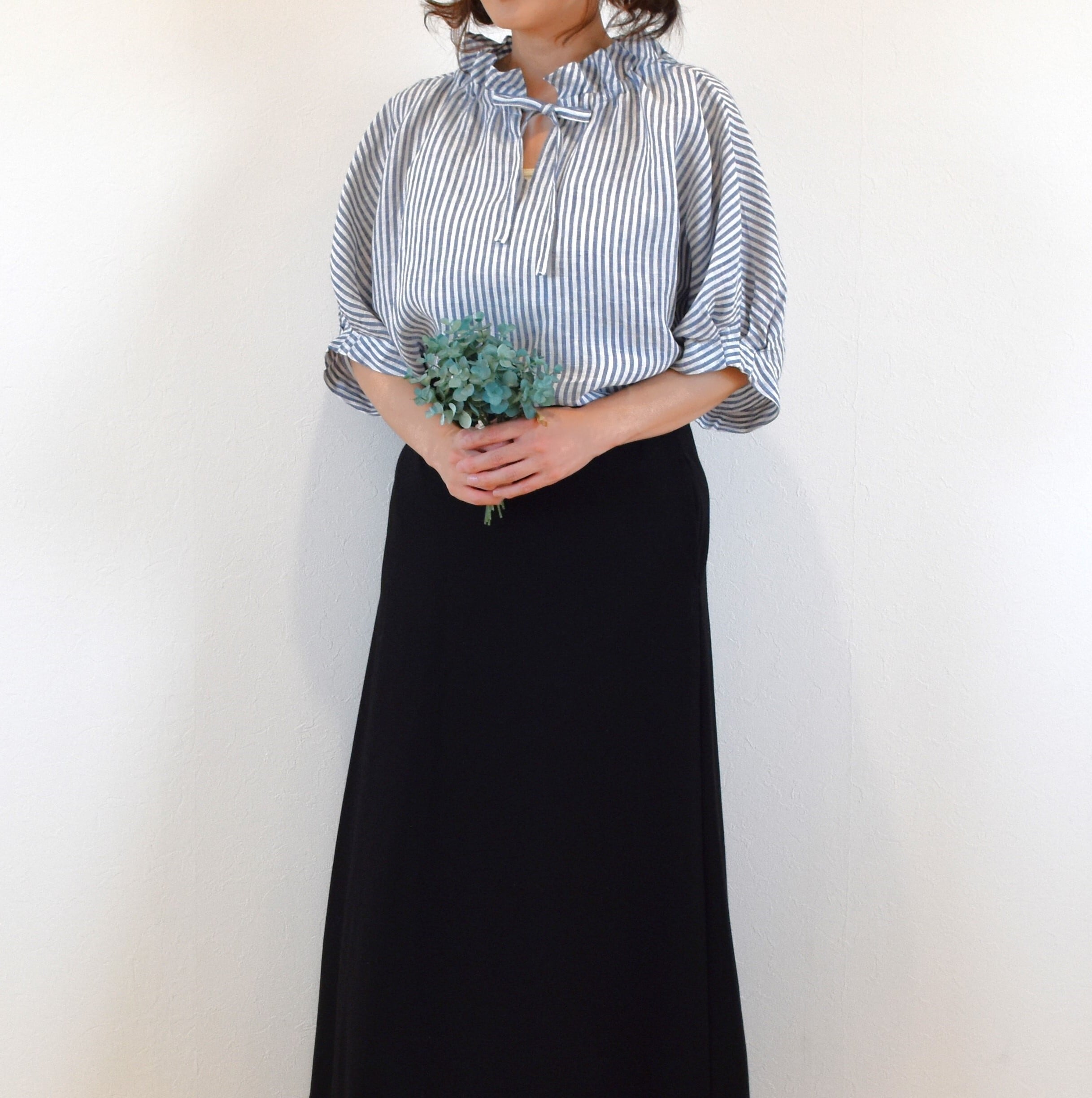 さらりとした肌触りの 優しいリネン生地でクールな印象のストライプ柄を、ナチュラルで可愛らしい雰囲気のブラウスに仕上げました。