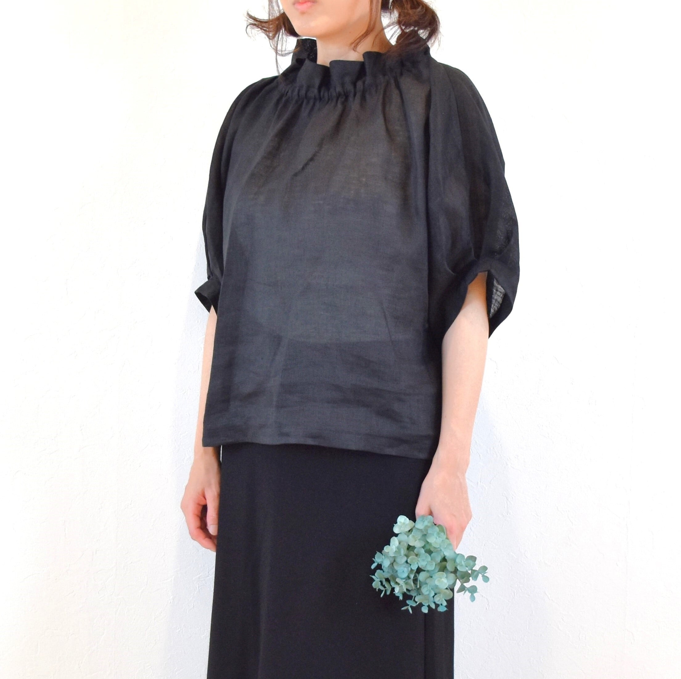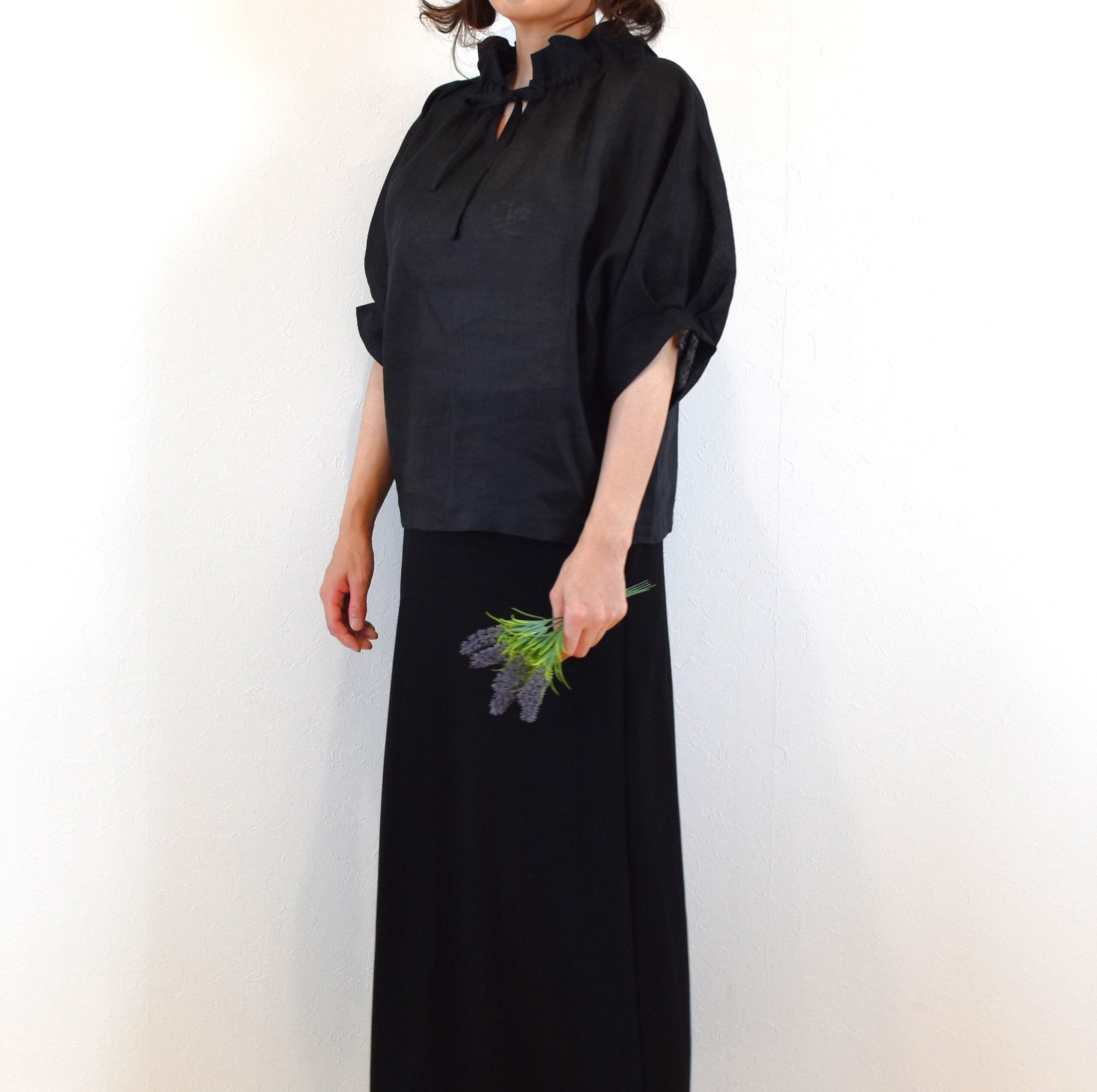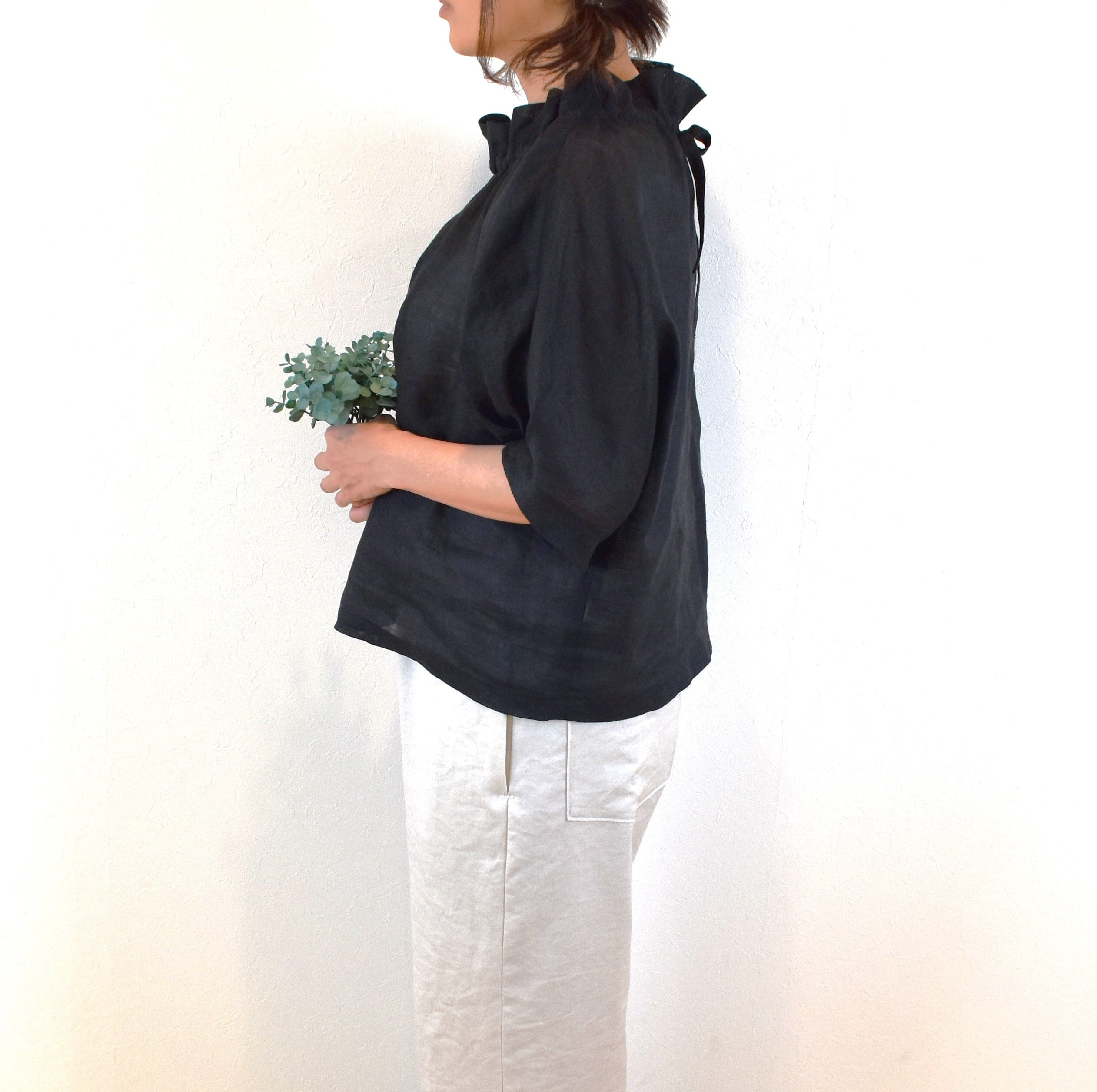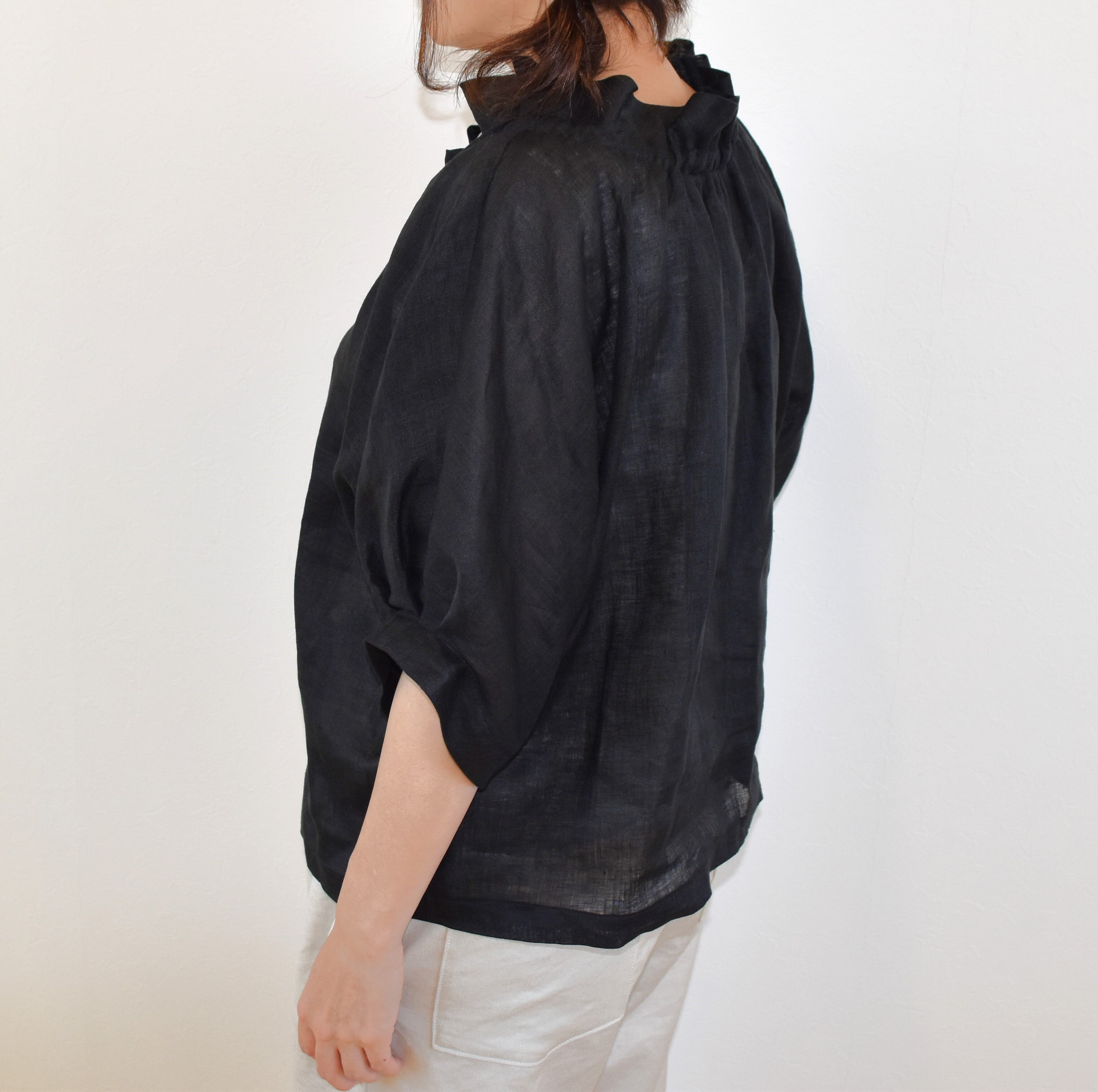 爽やかリネン100% 2way フリル襟 パフスリーブブラウス/ブラック
