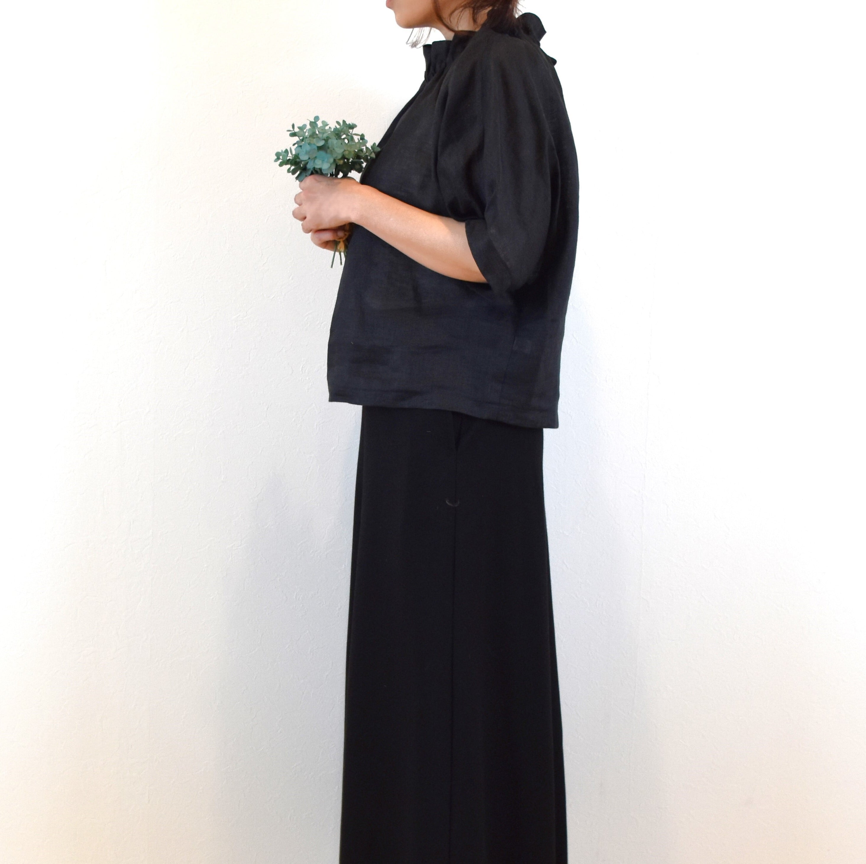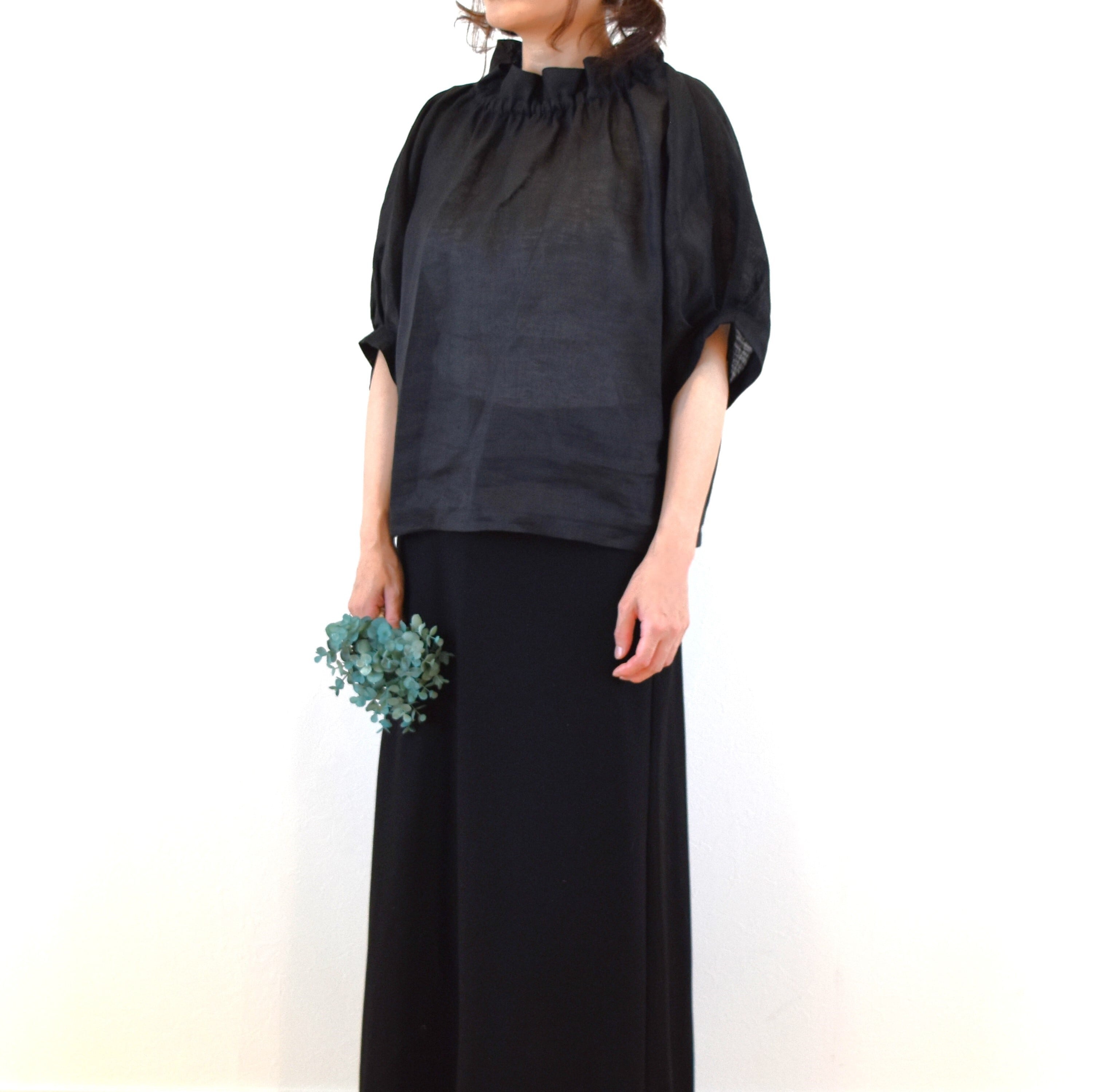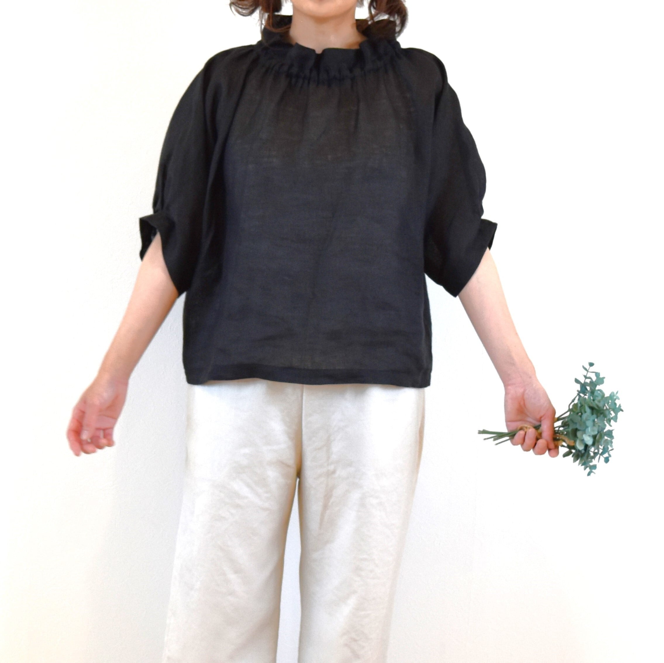 爽やかリネン100% 2way フリル襟 パフスリーブブラウス/ブラック