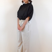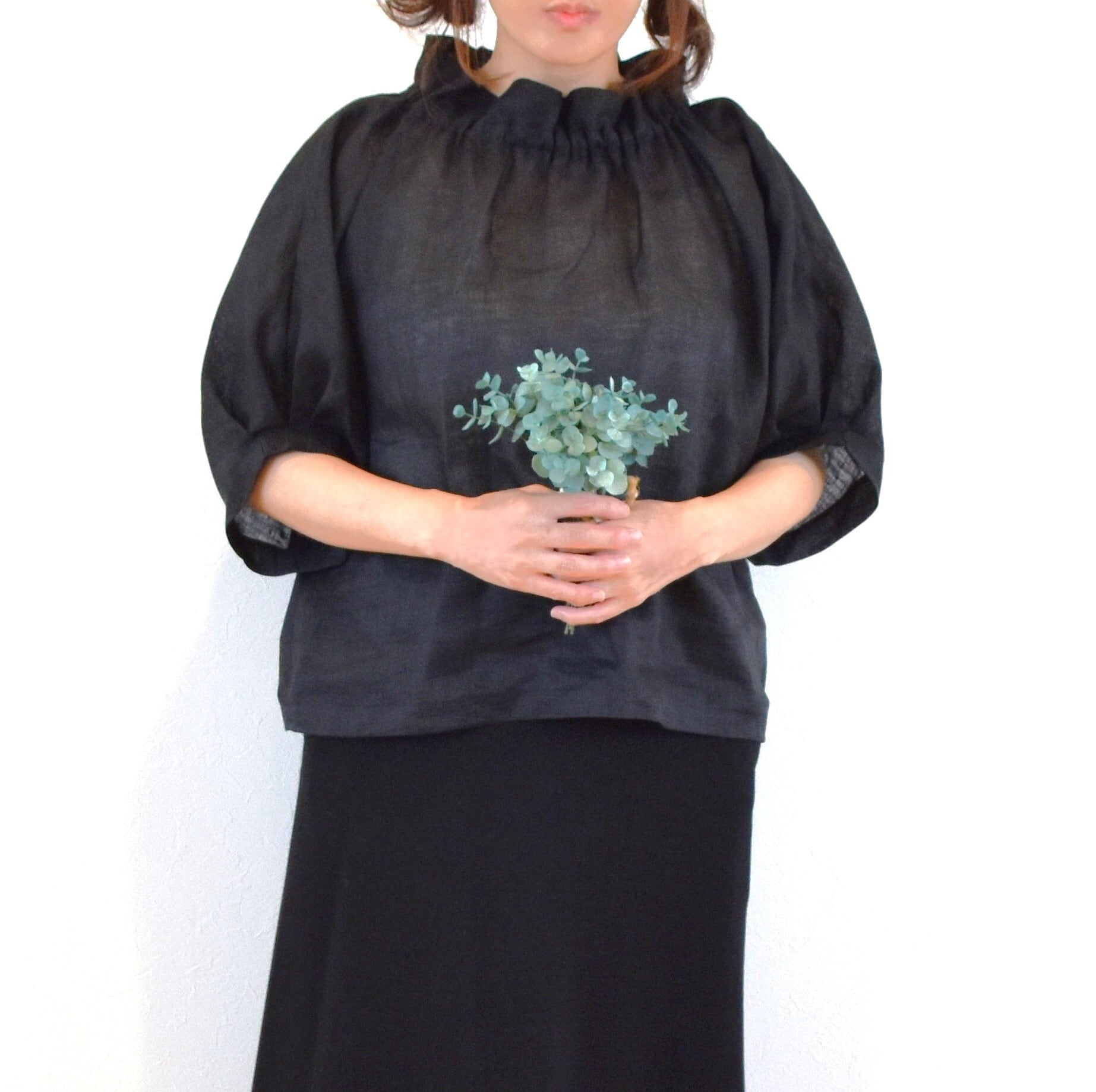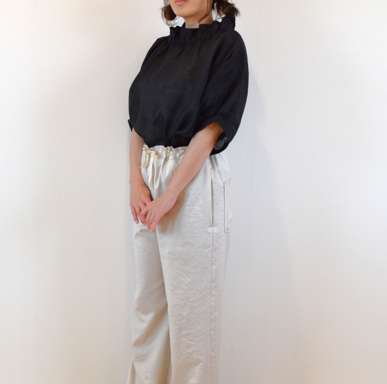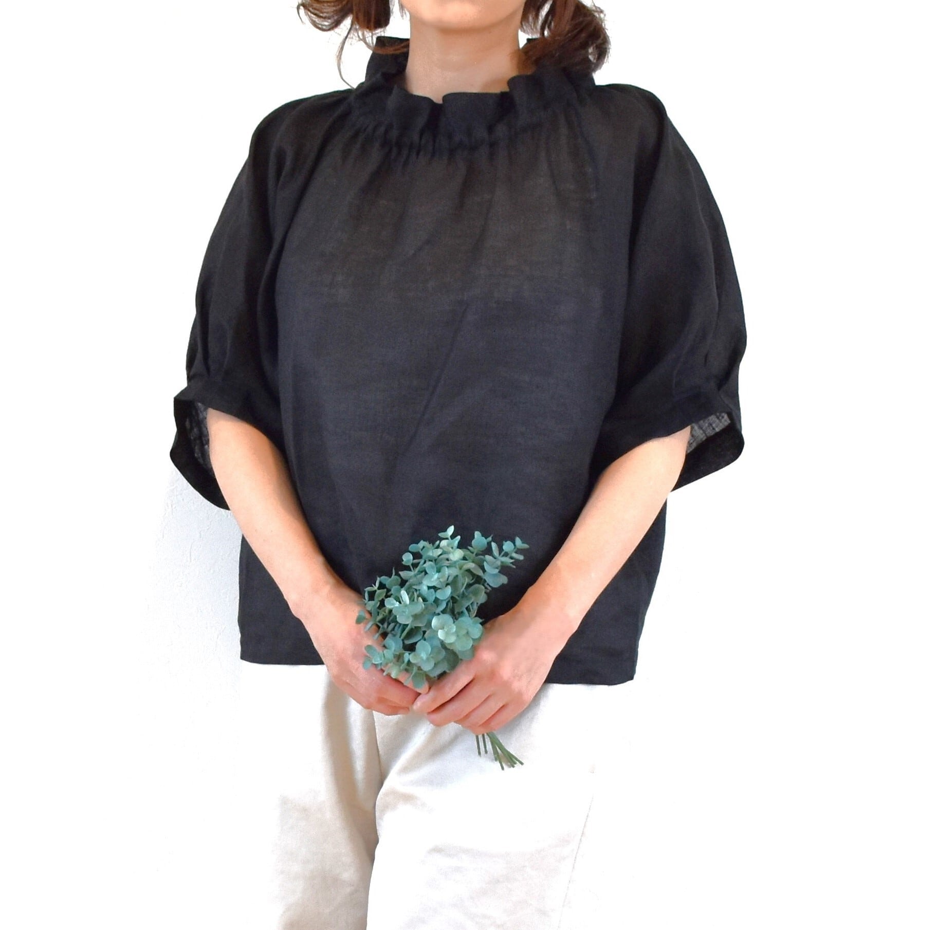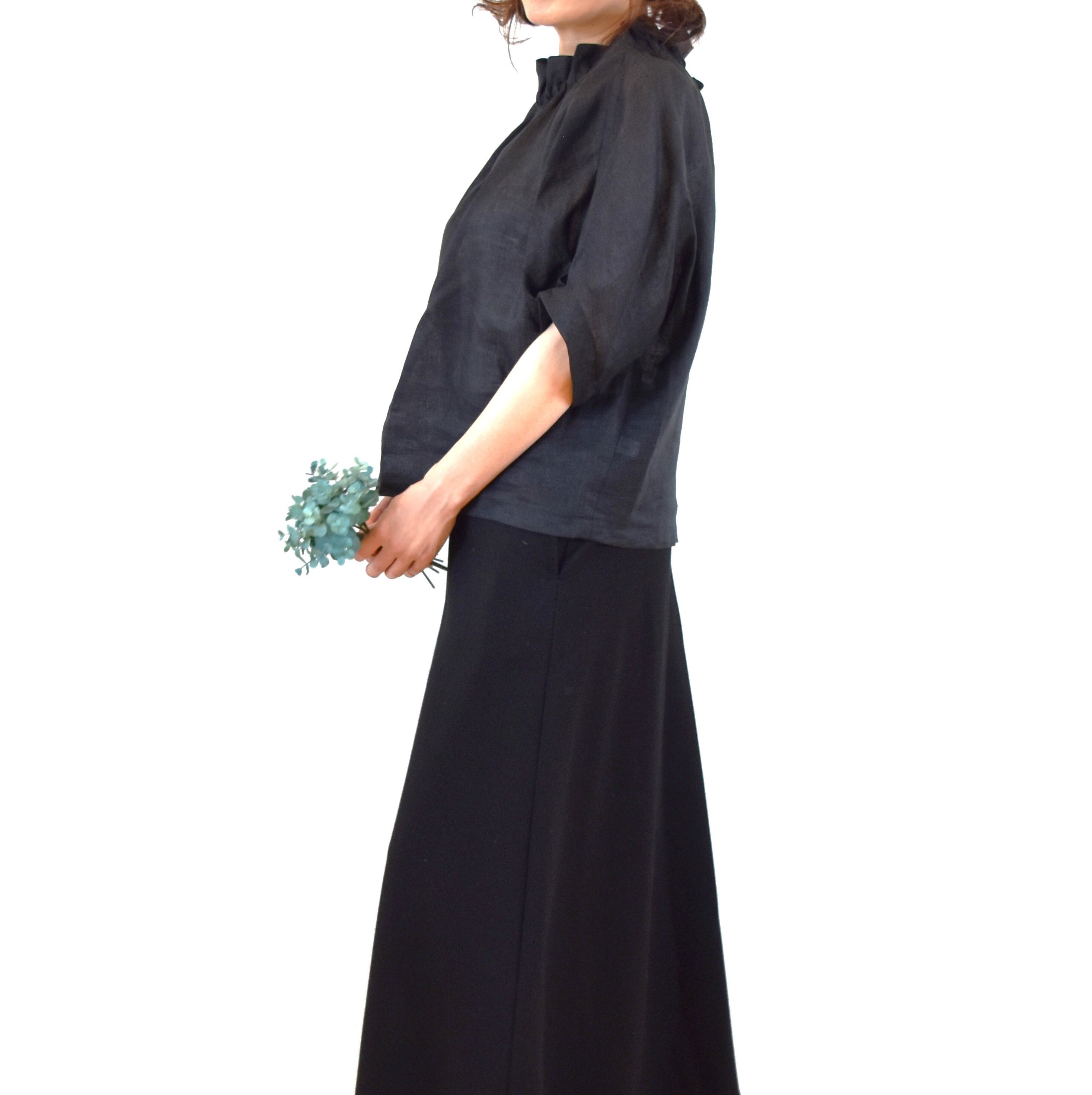 爽やかリネン100% 2way フリル襟 パフスリーブブラウス/ブラック